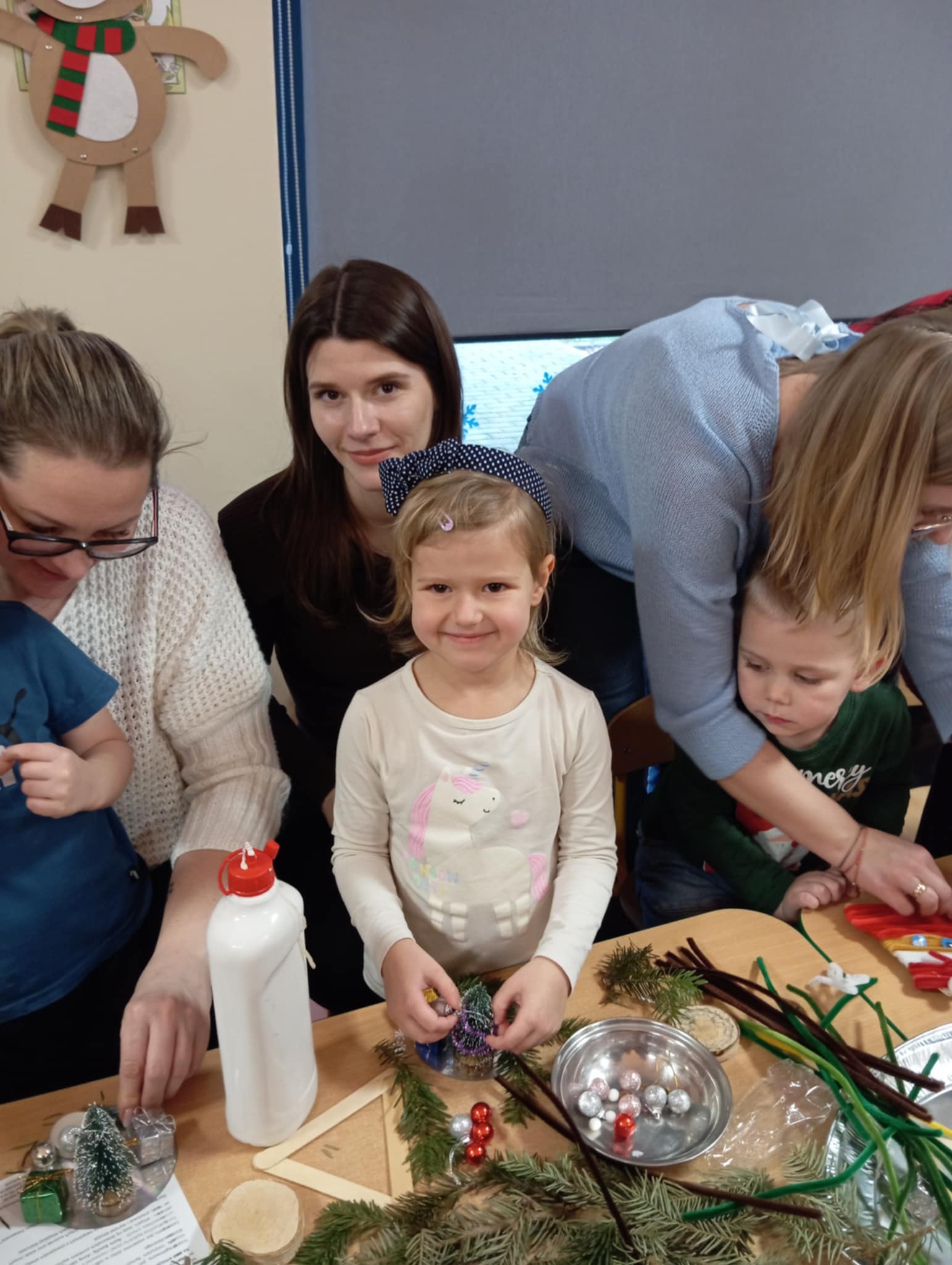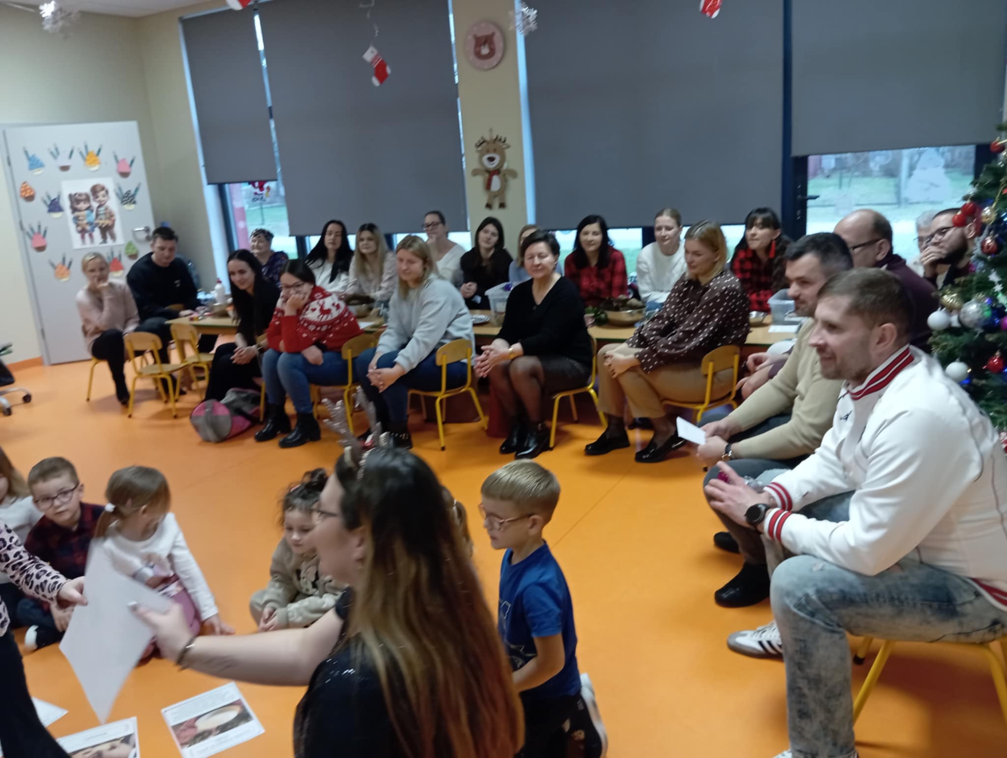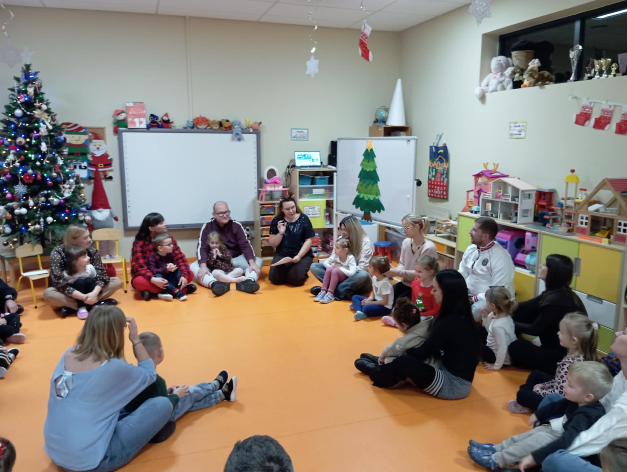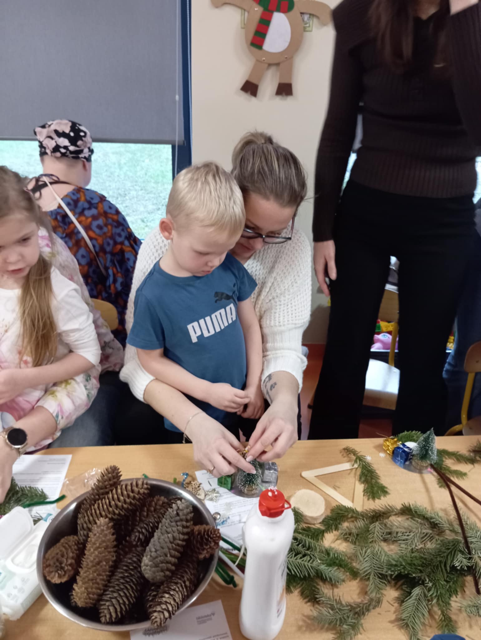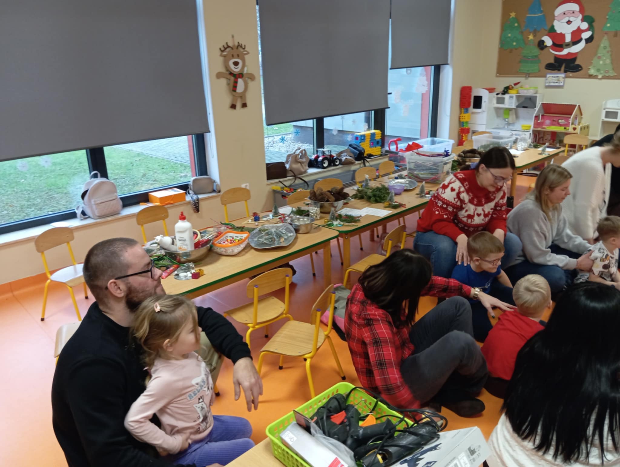 Dzisiejszego dnia w naszej grupie odbyło się bożonarodzeniowe spotkanie z rodzicami. Najpierw rodzice mieli przyjemność oglądać zajęcia, w których uczestniczyły dzieci. Zajęcia o tematyce Bożego Narodzenie. Rodzice aktywnie włączyli się w pracę, odgadywali tradycje ukryte na obrazkach, nauczyły się piosenki, bawili się wspólnie z dziećmi. Następnie wszyscy przystąpili do kreatywnej części naszego spotkania. Rodzice wspólnie z dziećmi wykonaywali ozdoby, stroiki świąteczne. To był wspaniały czas.