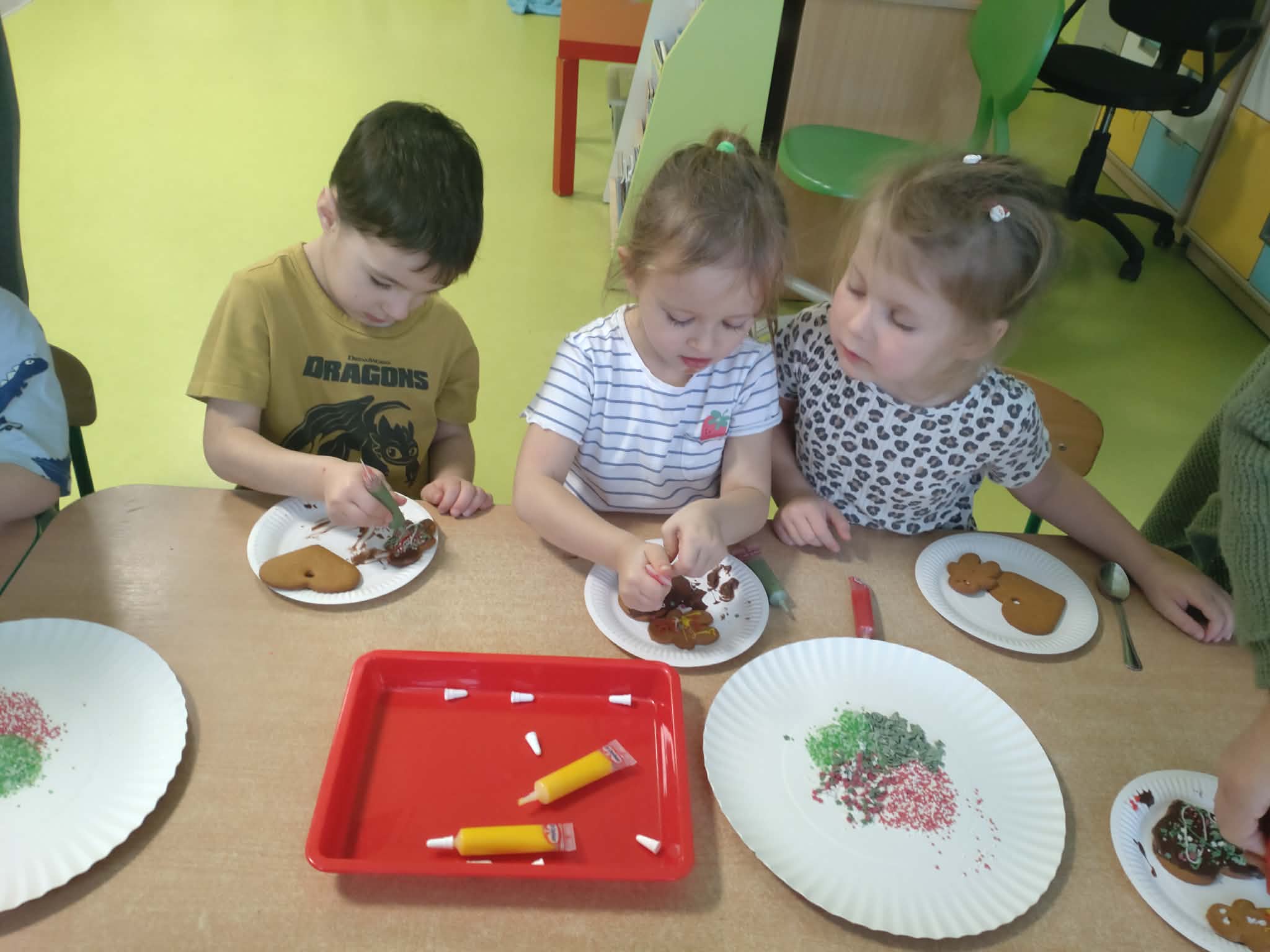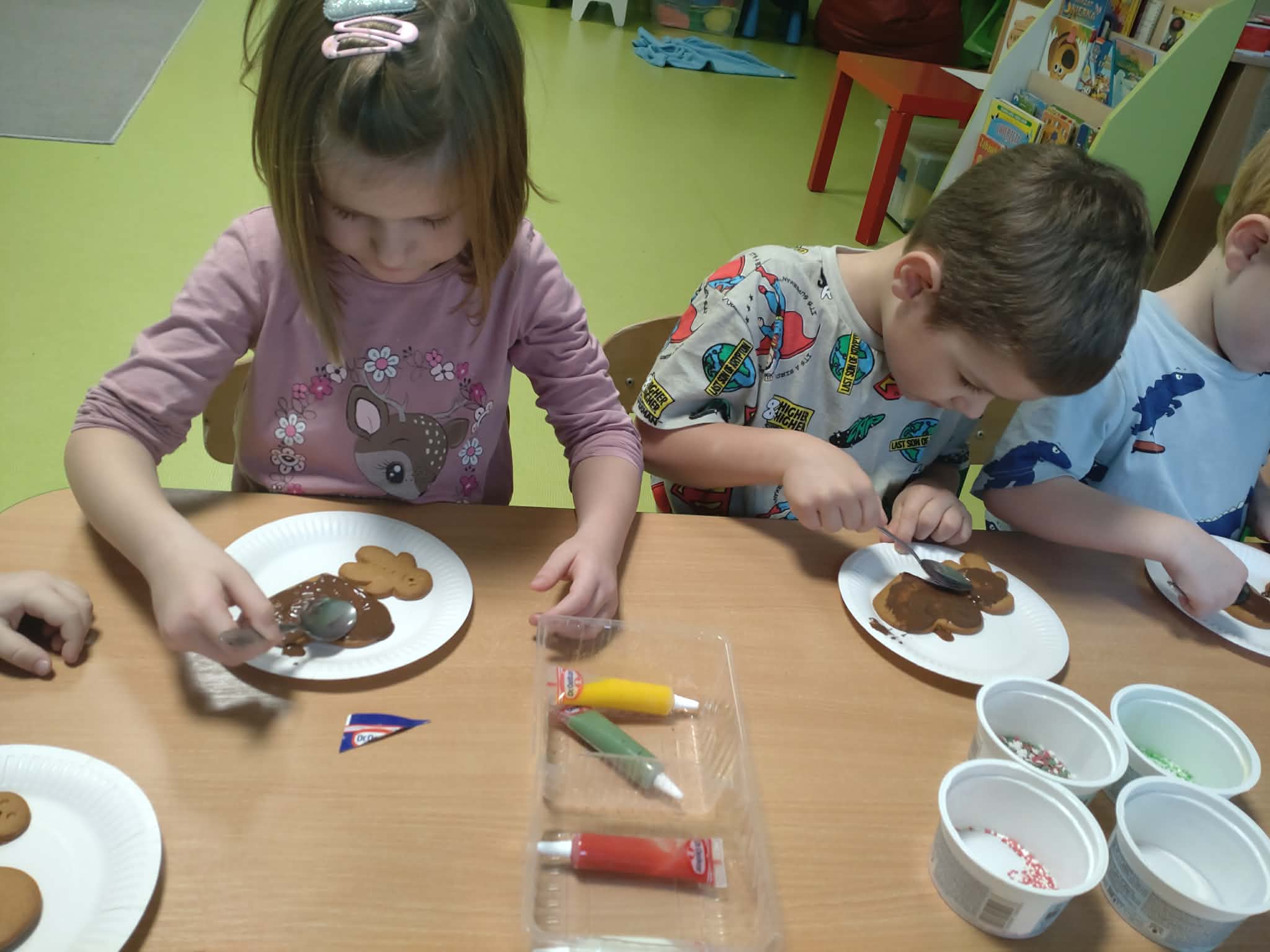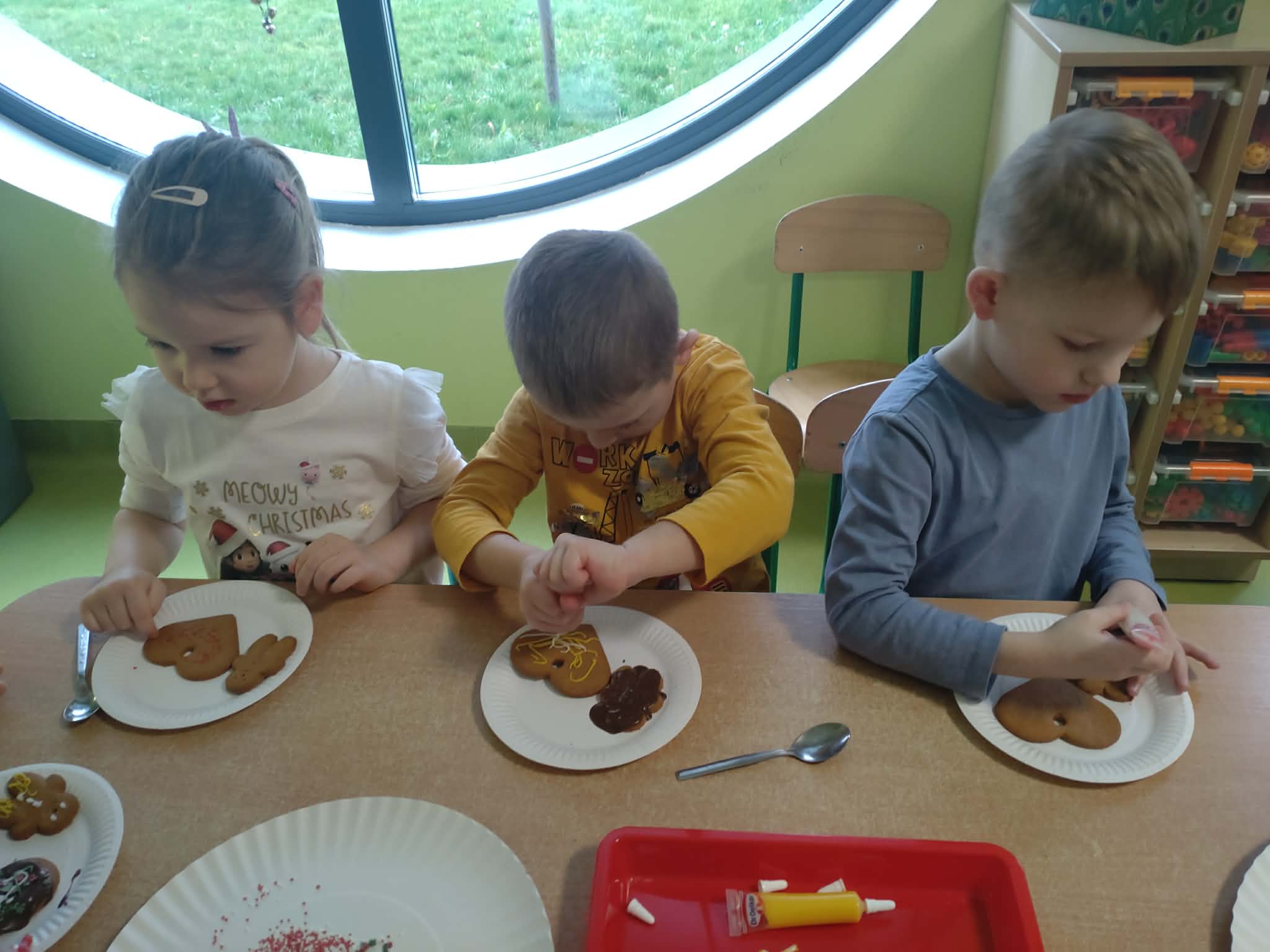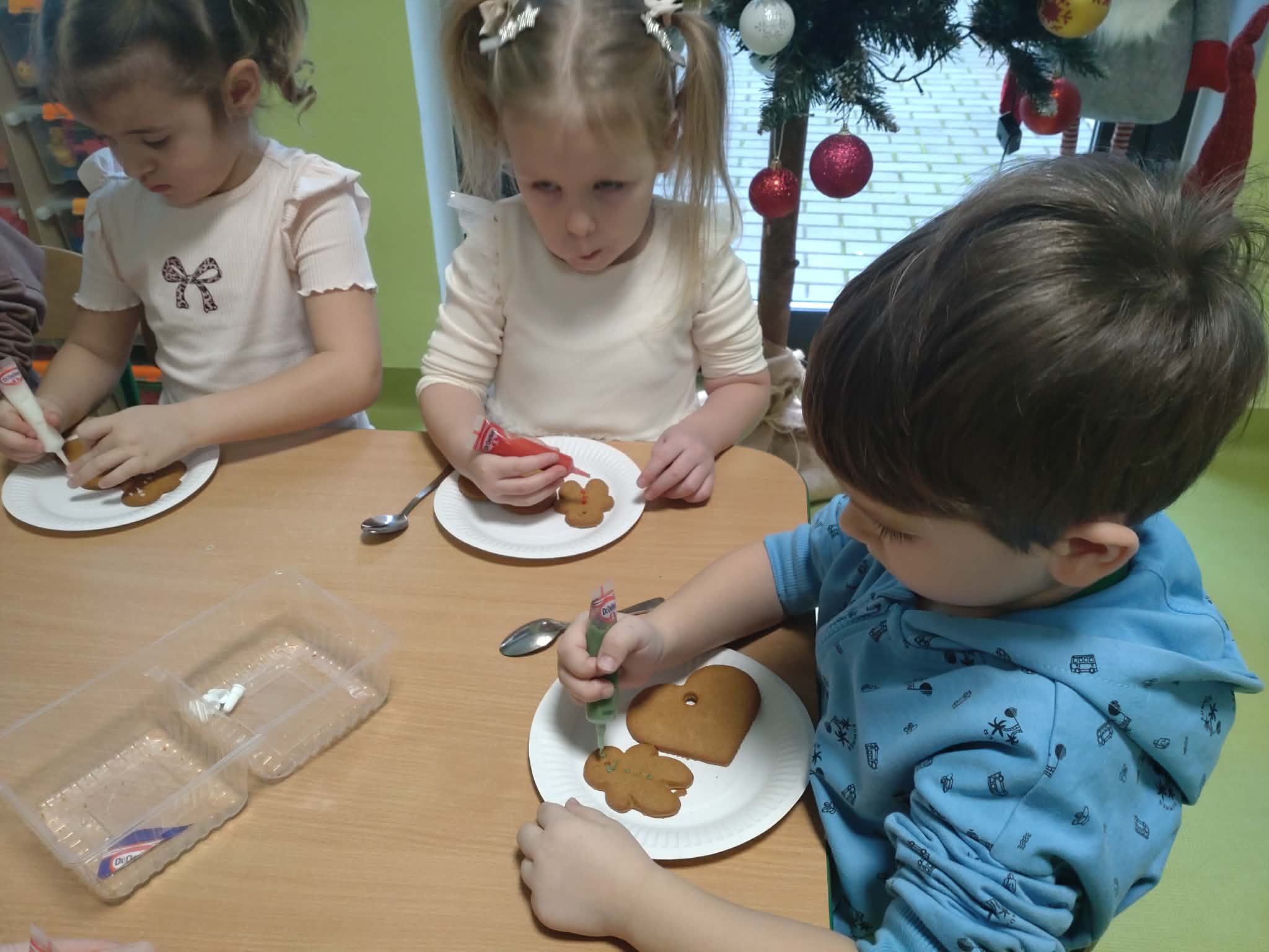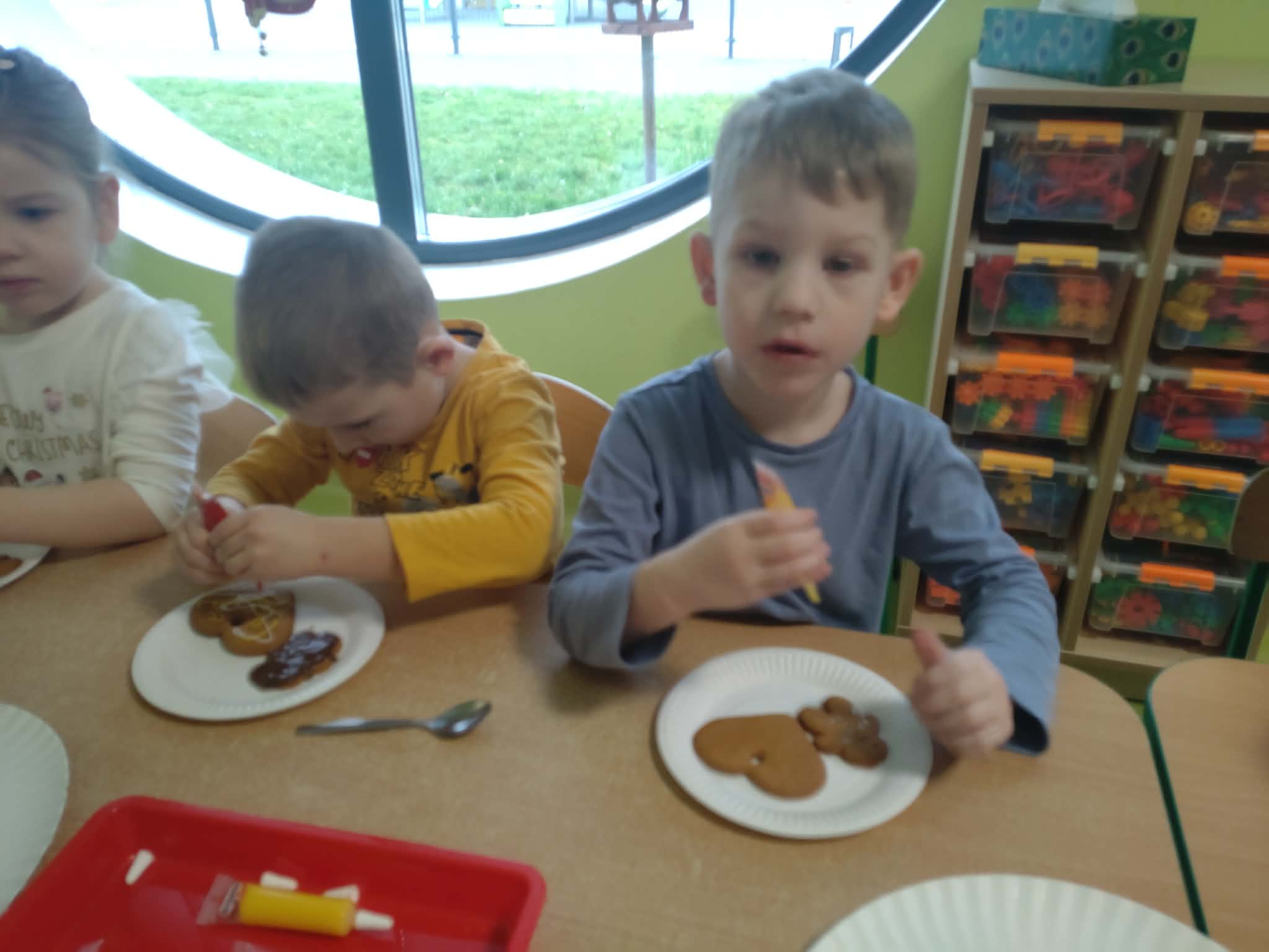 W przedszkolu bardzo czujemy już zbliżające się święta. Codziennie elf Zefirek ma dla nas nowego psikusa, a dzisiaj ozdabialiśmy pierniczki. Okazało się, że nie jest to łatwe zajęcie, ale było bardzo smacznie.