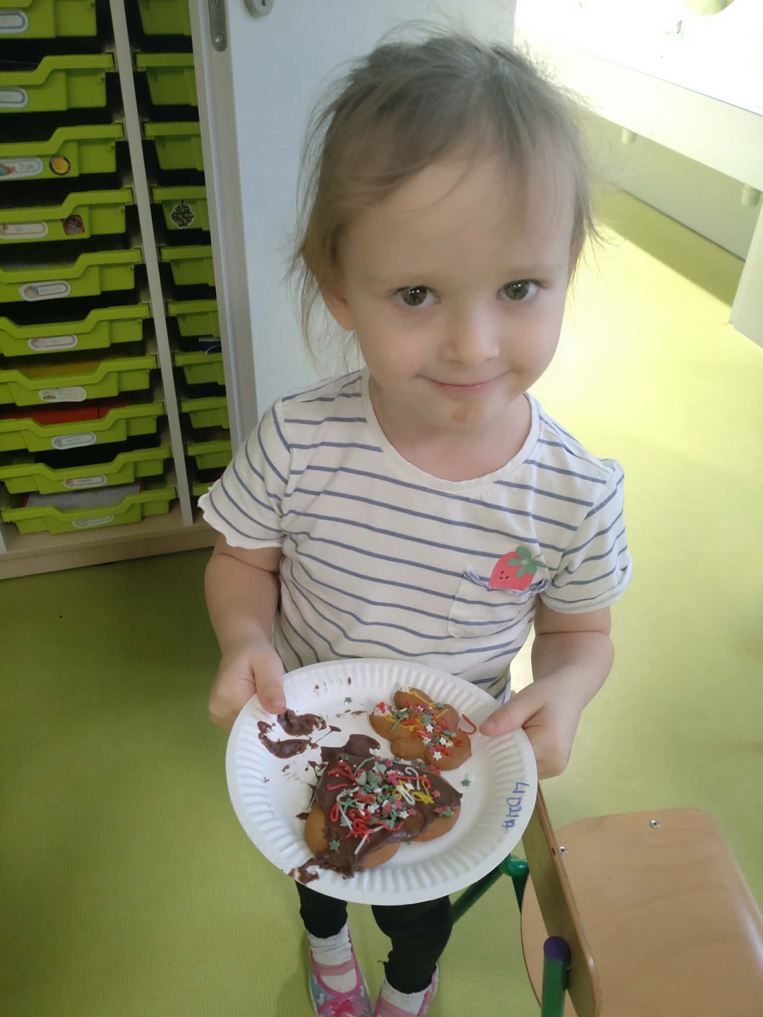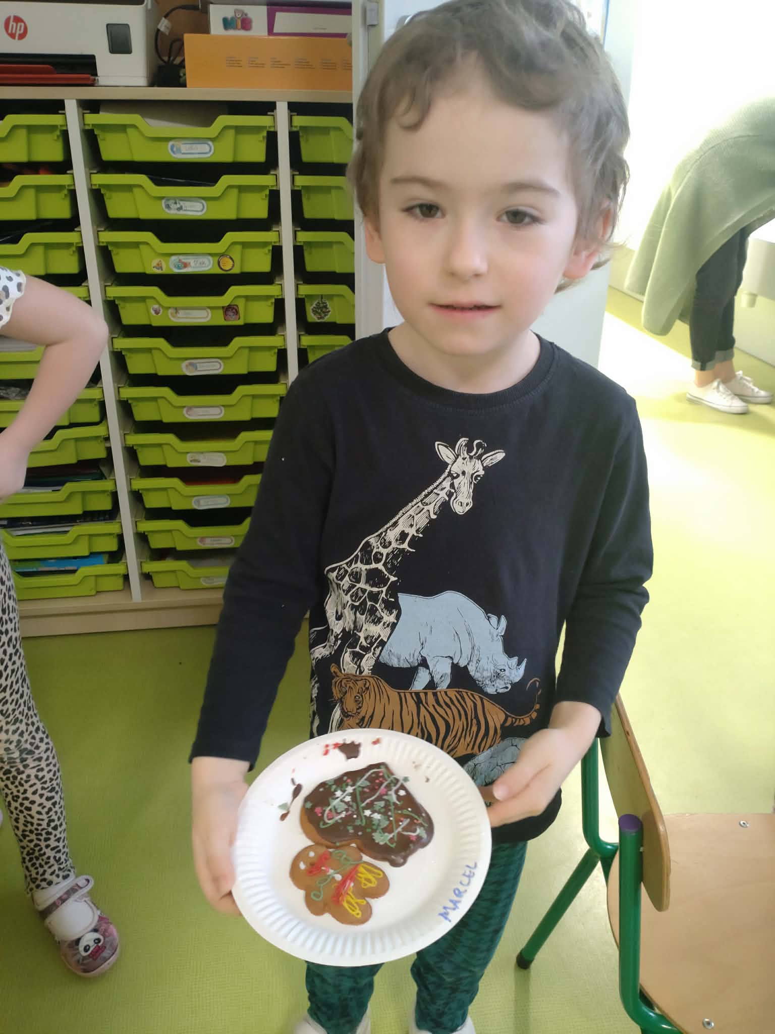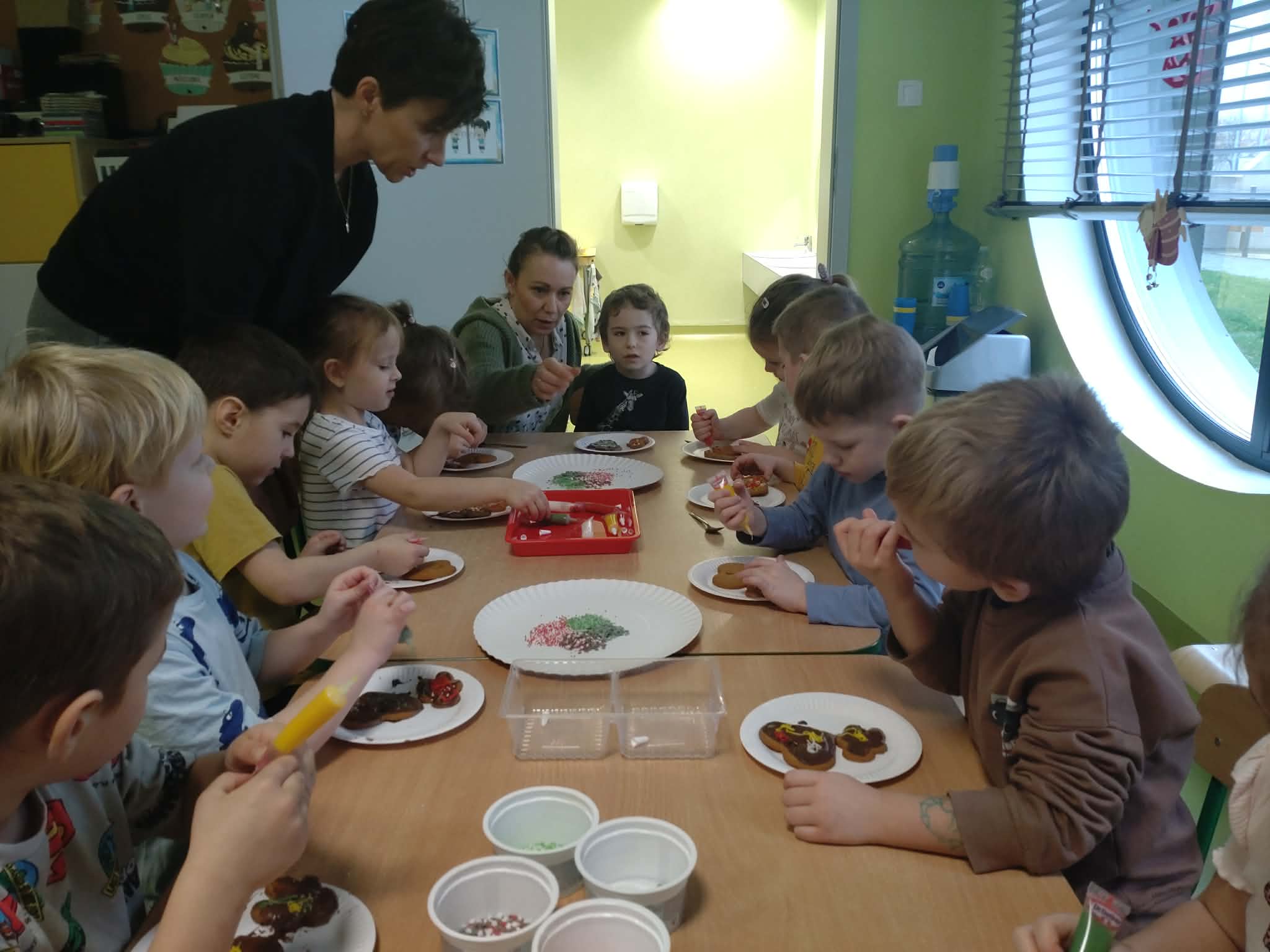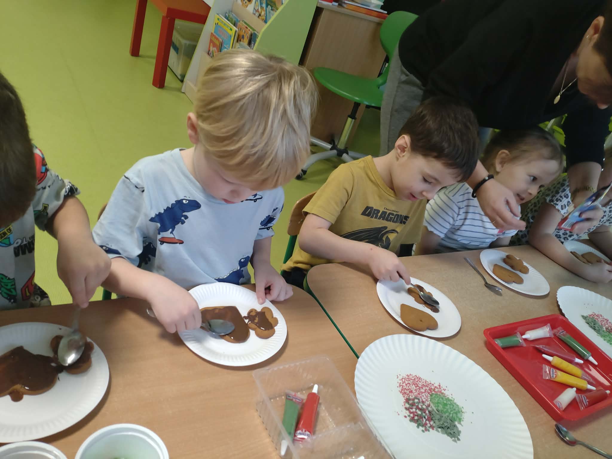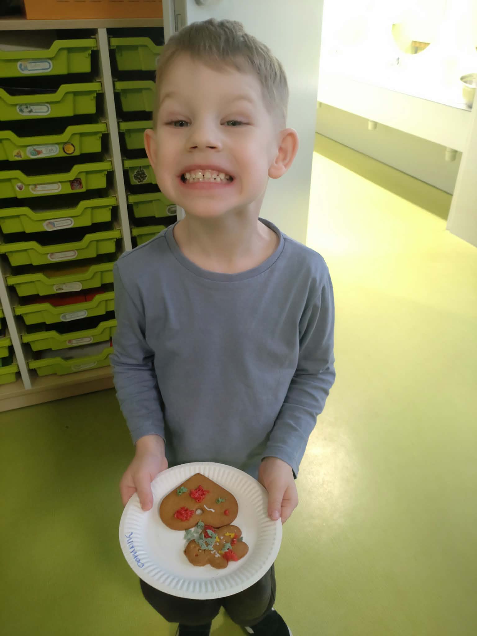 W przedszkolu bardzo czujemy już zbliżające się święta. Codziennie elf Zefirek ma dla nas nowego psikusa, a dzisiaj ozdabialiśmy pierniczki. Okazało się, że nie jest to łatwe zajęcie, ale było bardzo smacznie.
