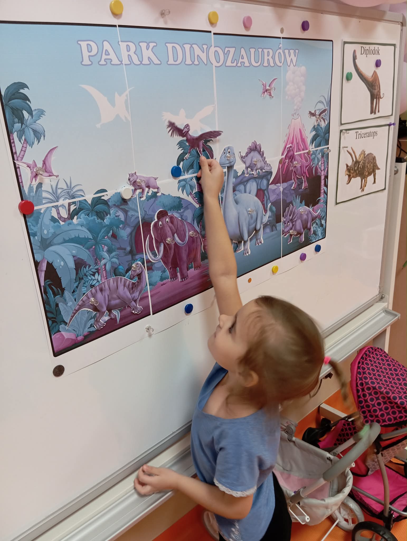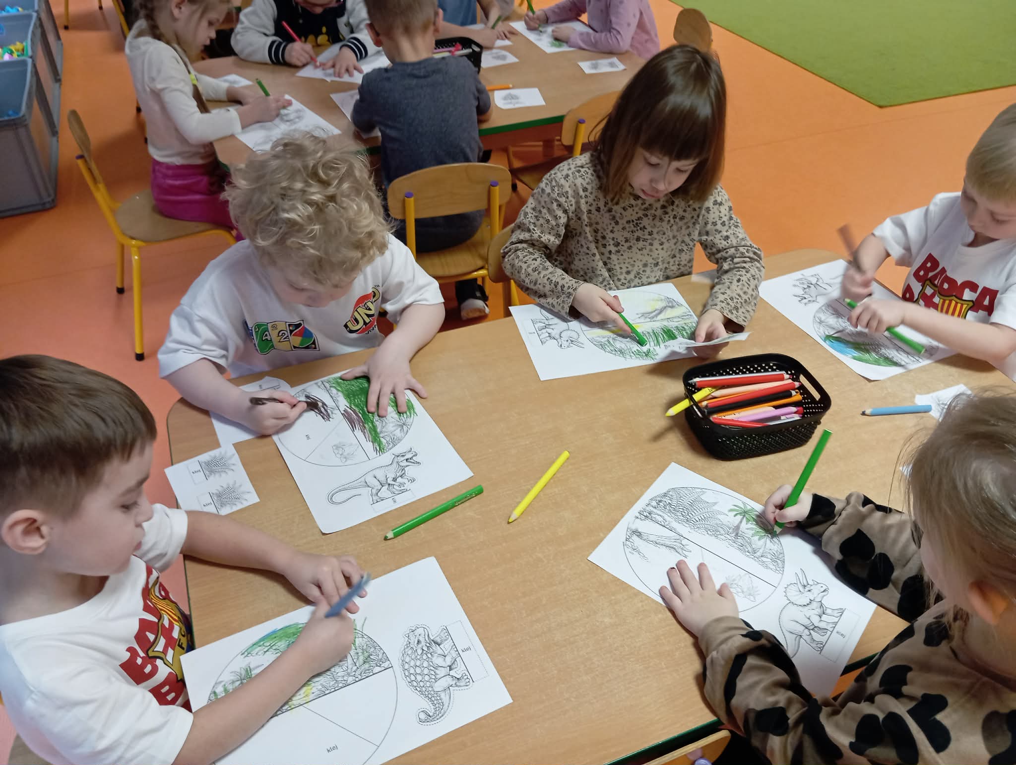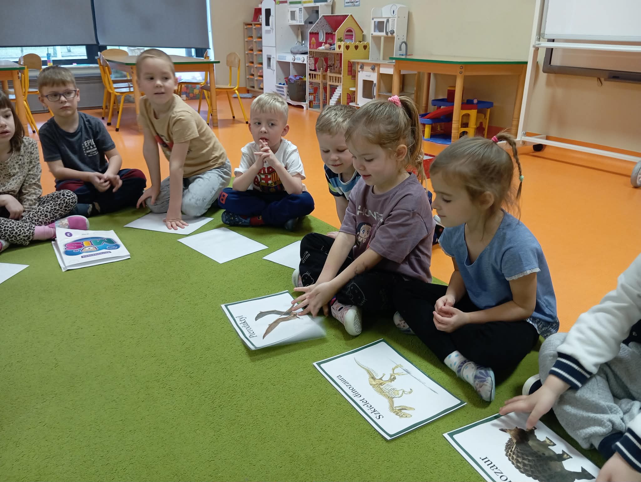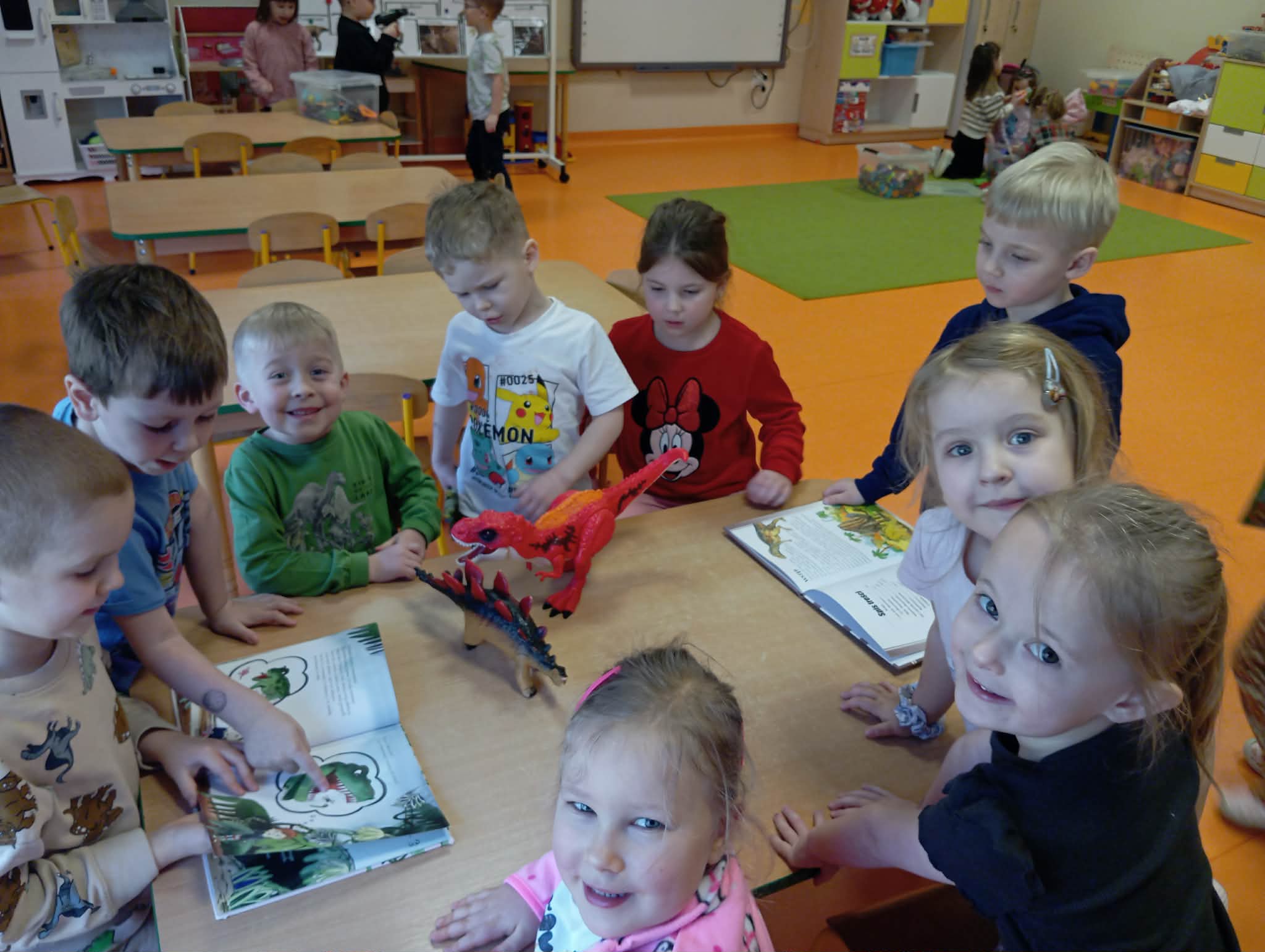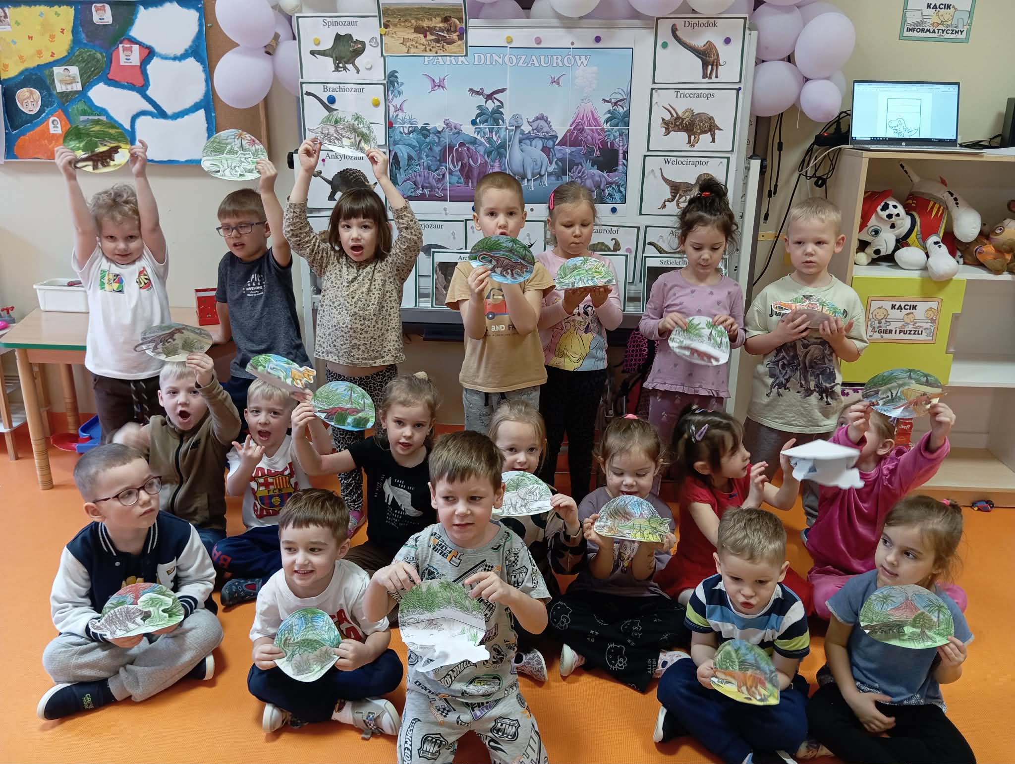 Cały ostatni tydzień poświeciliśmy w Morelkach na omówienie tematyki pradawnych czasów - dinozaury. Oprócz przypomnienia nazw, omówienia wyglądu dinozaurów, dzieci wykonywały szereg czynności edukacyjnych. Dopasowywały sylwety dinozaurów, robiły ćwiczenia grafomotoryczne, układały puzzle. Wykonaliśmy dwa eksperymenty - jajko w occie oraz to, co dzieciom podobało się najbardziej - erupcja wulkanu. Dzieci chętnie przynosiły swoje zabawki, związane z tematem tygodnia. Okazało się, ze mamy w naszej grupie wiernego fana tematu dinozaurów, zna się na temacie lepiej niż jeden naukowiec.
