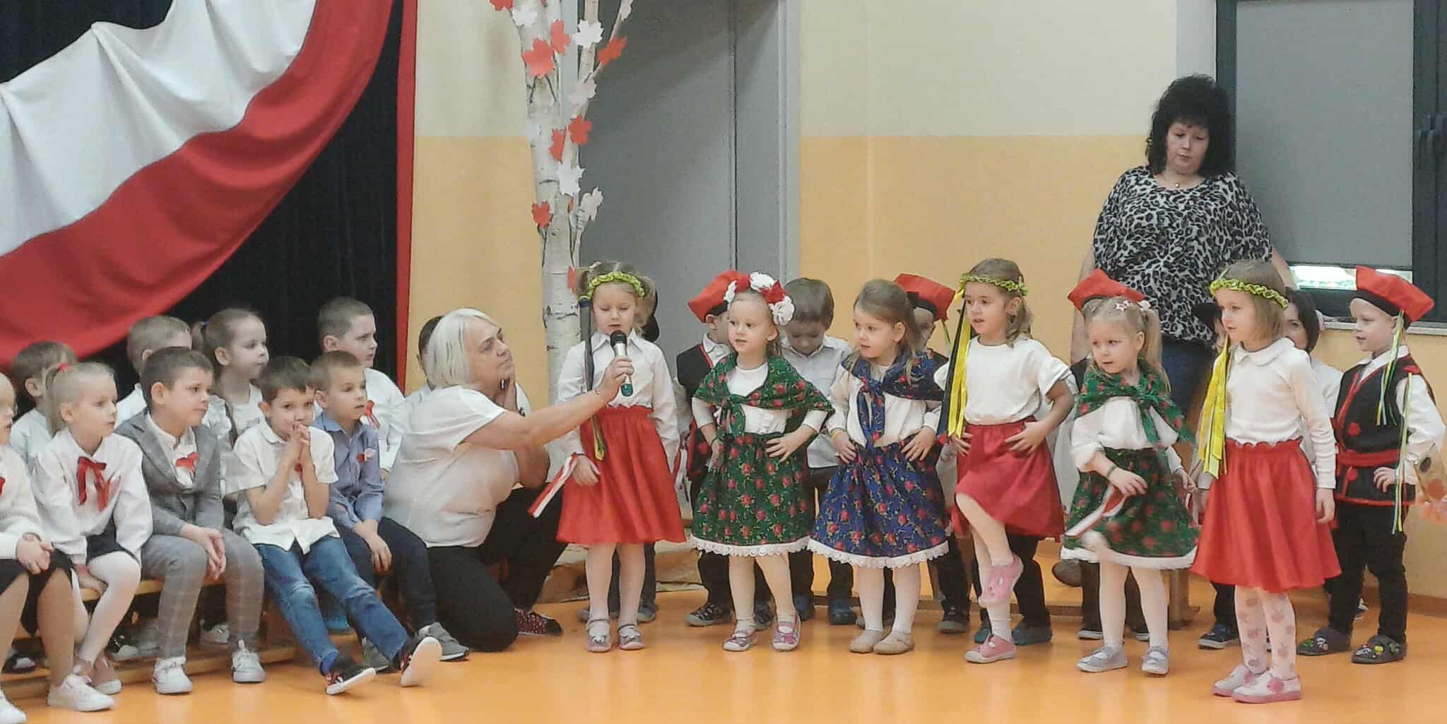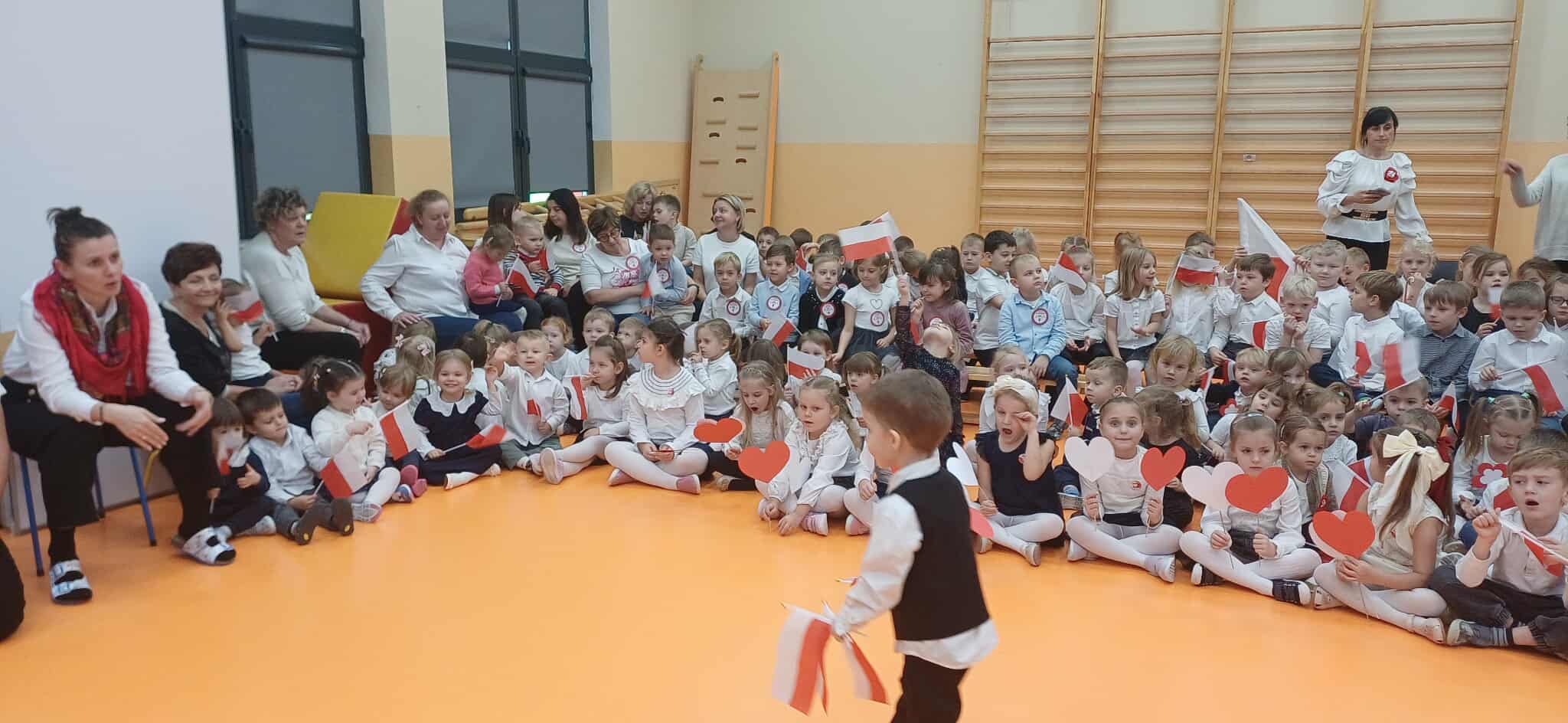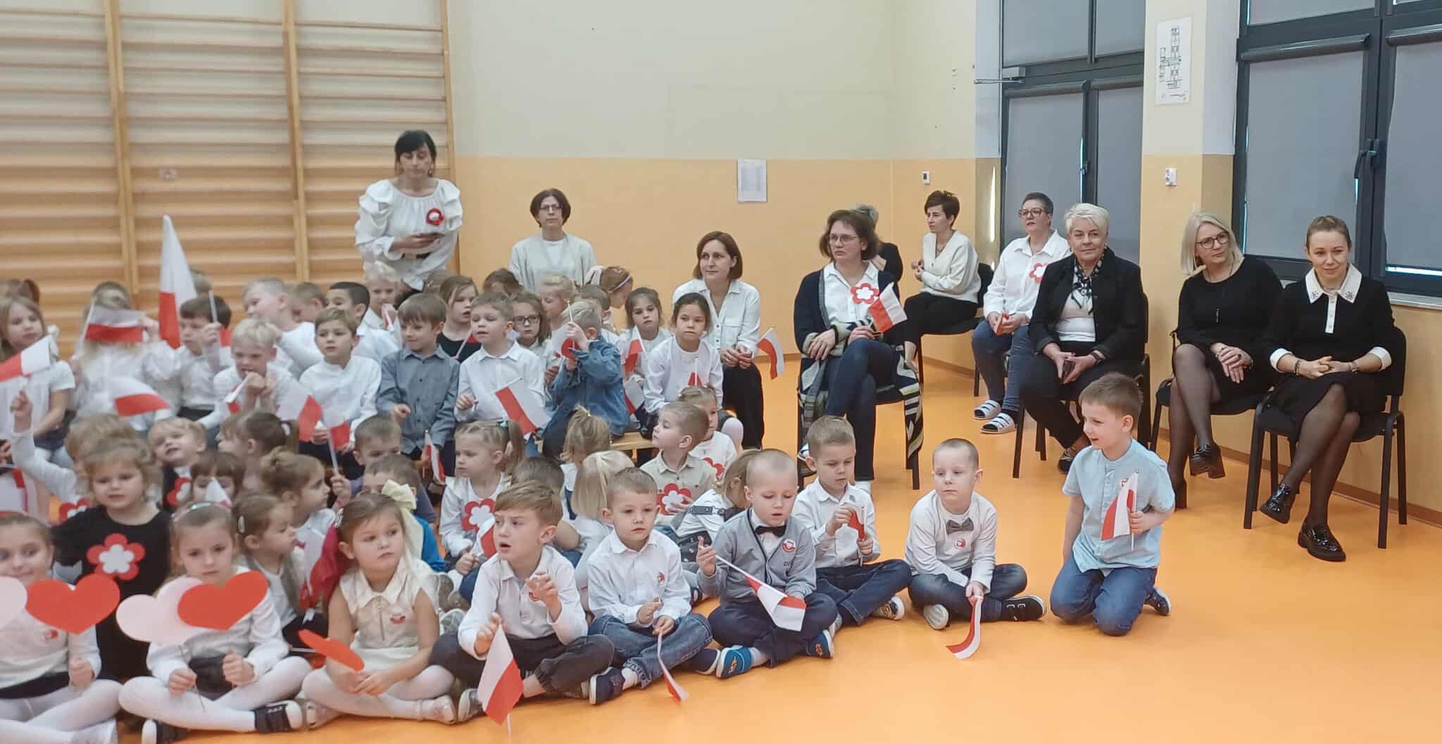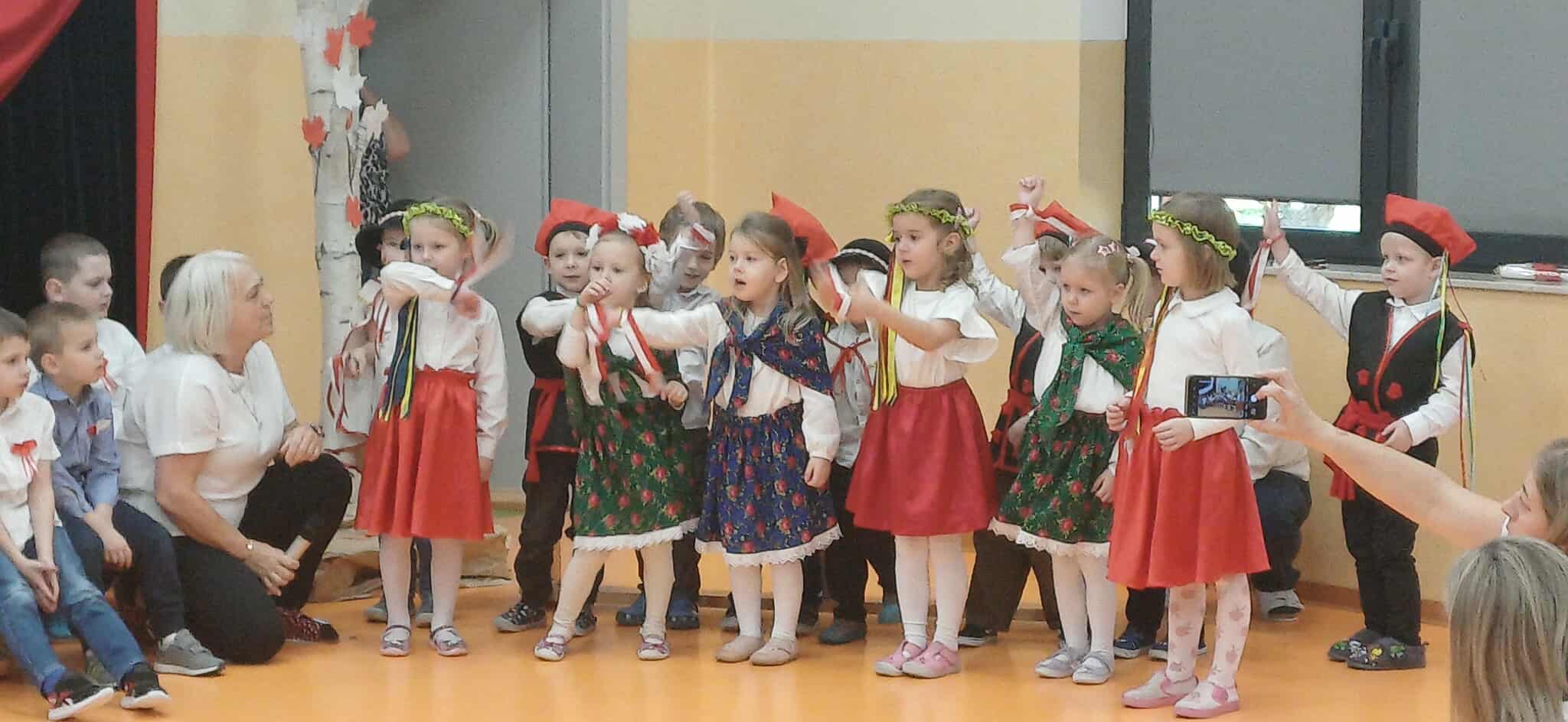 Dzisiejszego dnia odbyła się uroczysta akademia. Akademia z okazji upamiętnienia kolejnej rocznicy odzyskania przez Polskę niepodległości. Koordynatorem tego wydarzania była Pani Iwonka i grupa Malinki. Dzieci wprowadziły uroczysty nastrój i zagłębiły całą społeczność przedszkola w ważne wydarzenia, o których wszyscy muszą wiedzieć. Grupę 6-latków dzielnie wspierały młodsze grupy: Truskaweczki, Morelki i Wisienki, które przygotowały piosenki z układami tanecznymi. Grupy 4-latków zaprezentowały się w tradycyjnych strojach ludowych. Cała społeczność przedszkolna uroczyście odśpiewała Hymn Polski, dołączając do akcji Szkoła do hymnu.