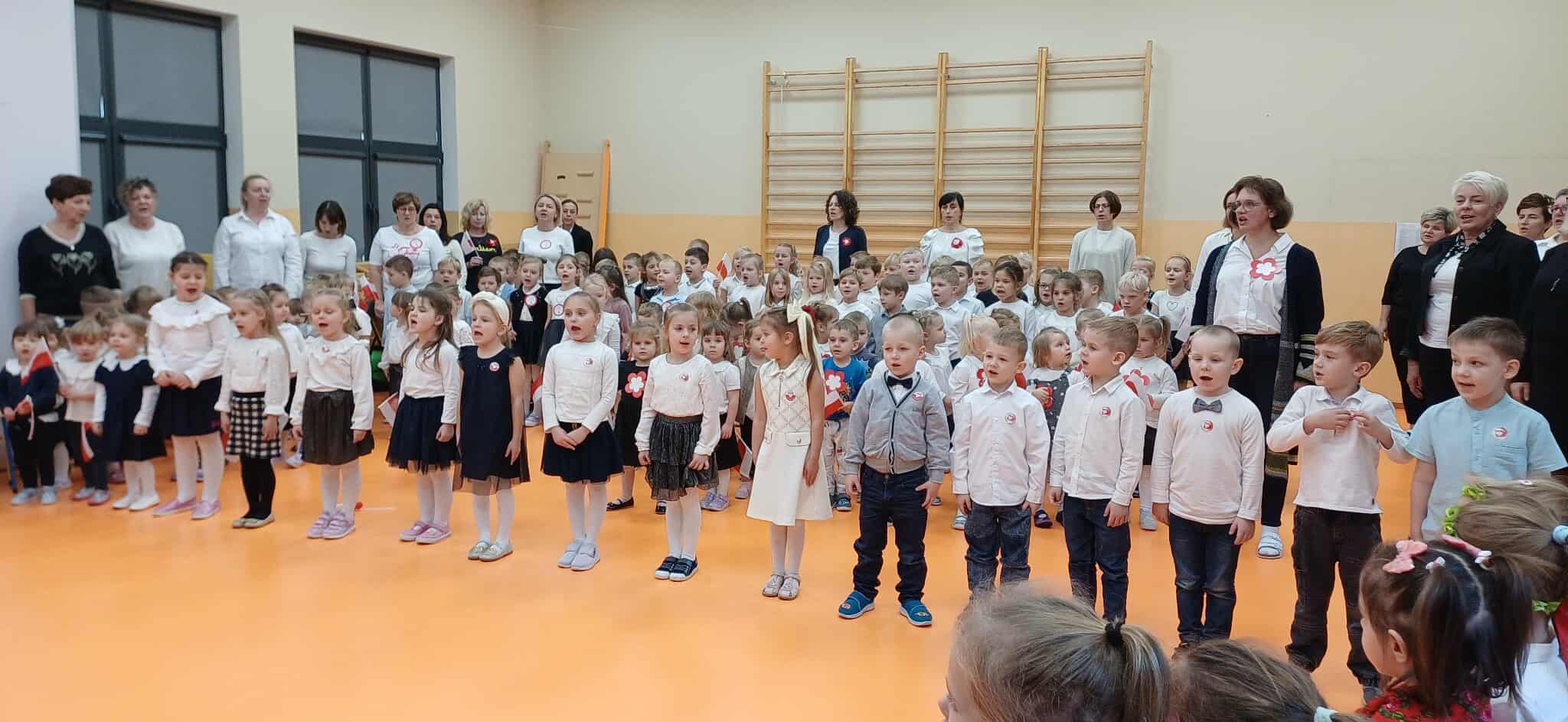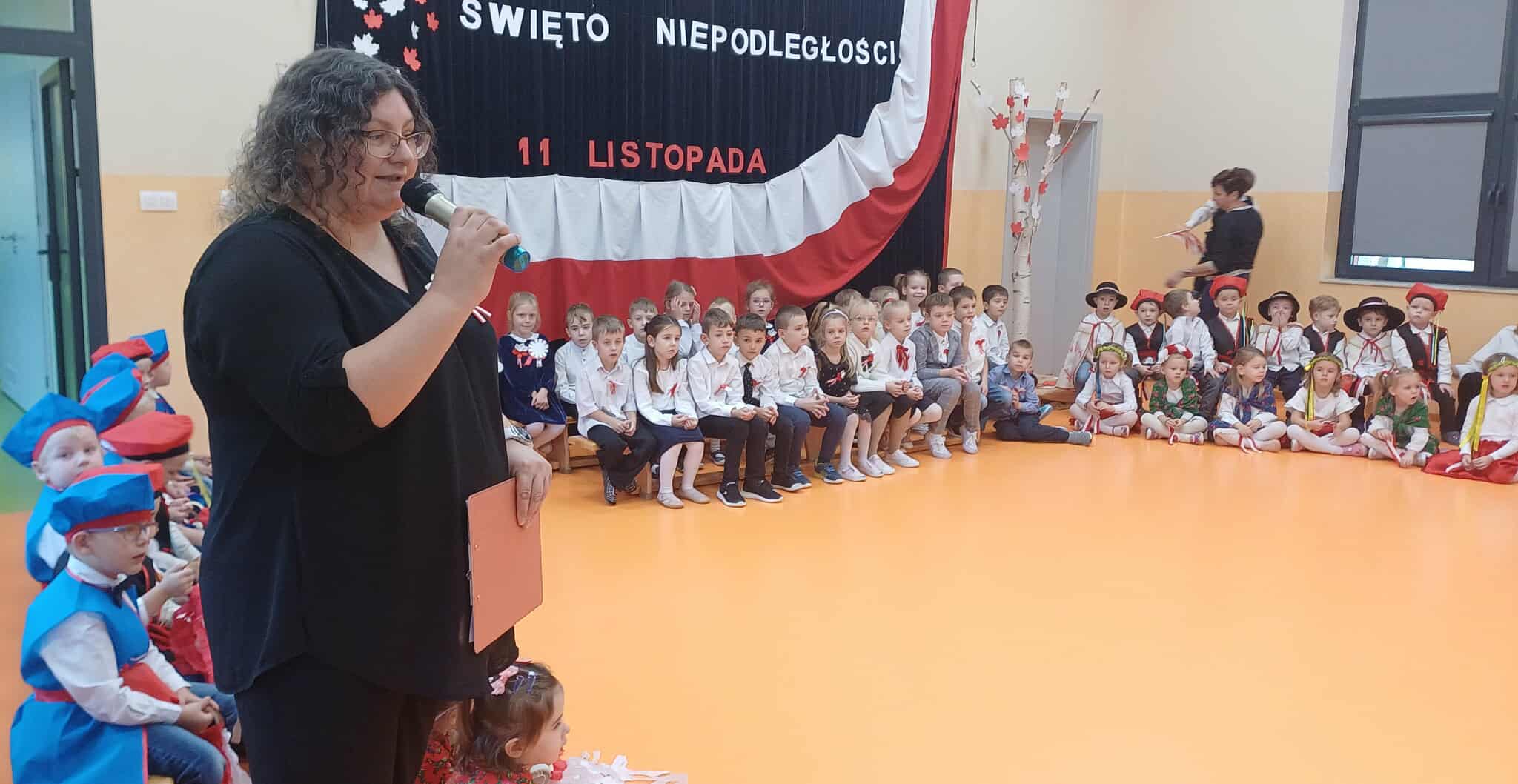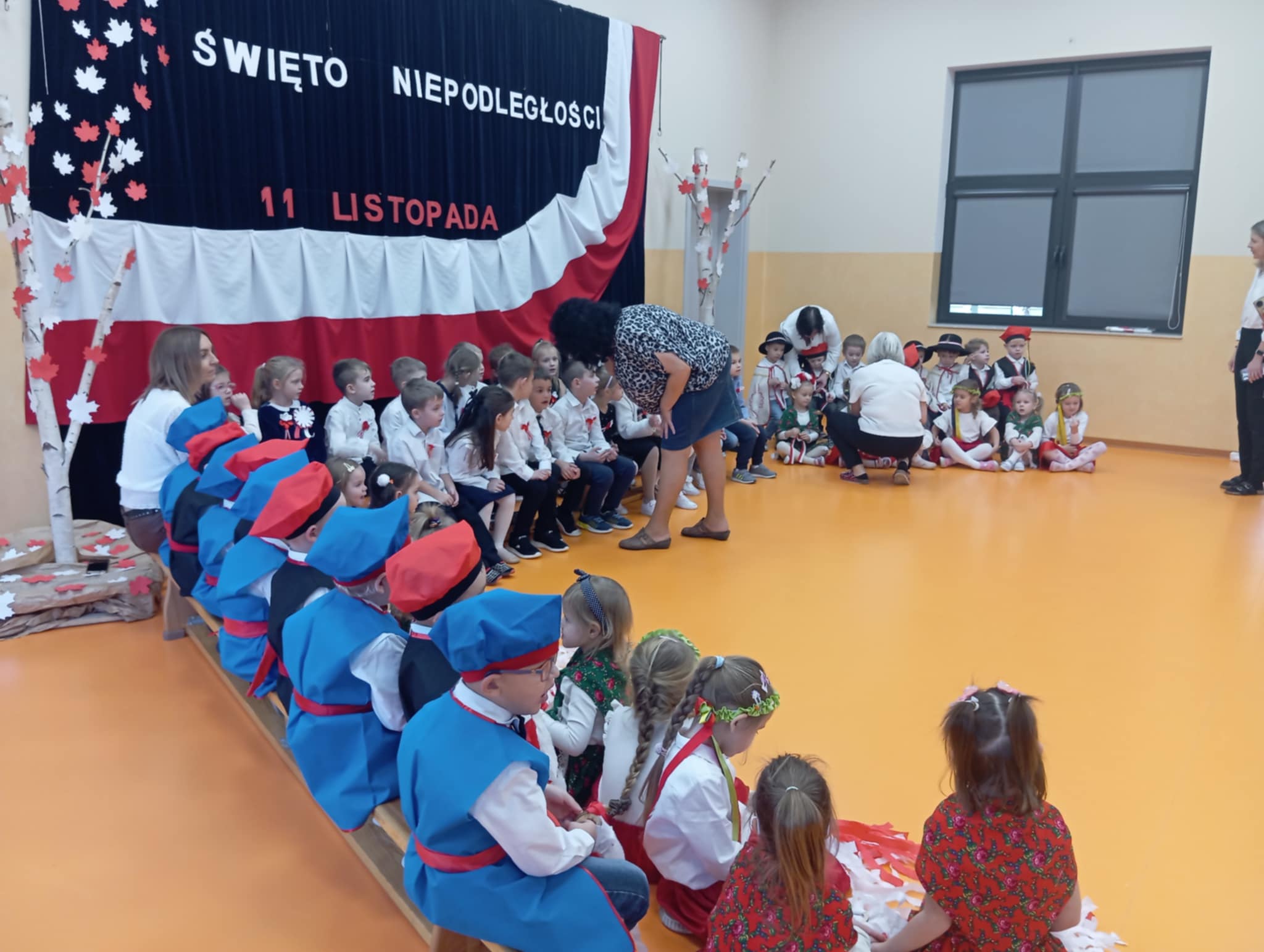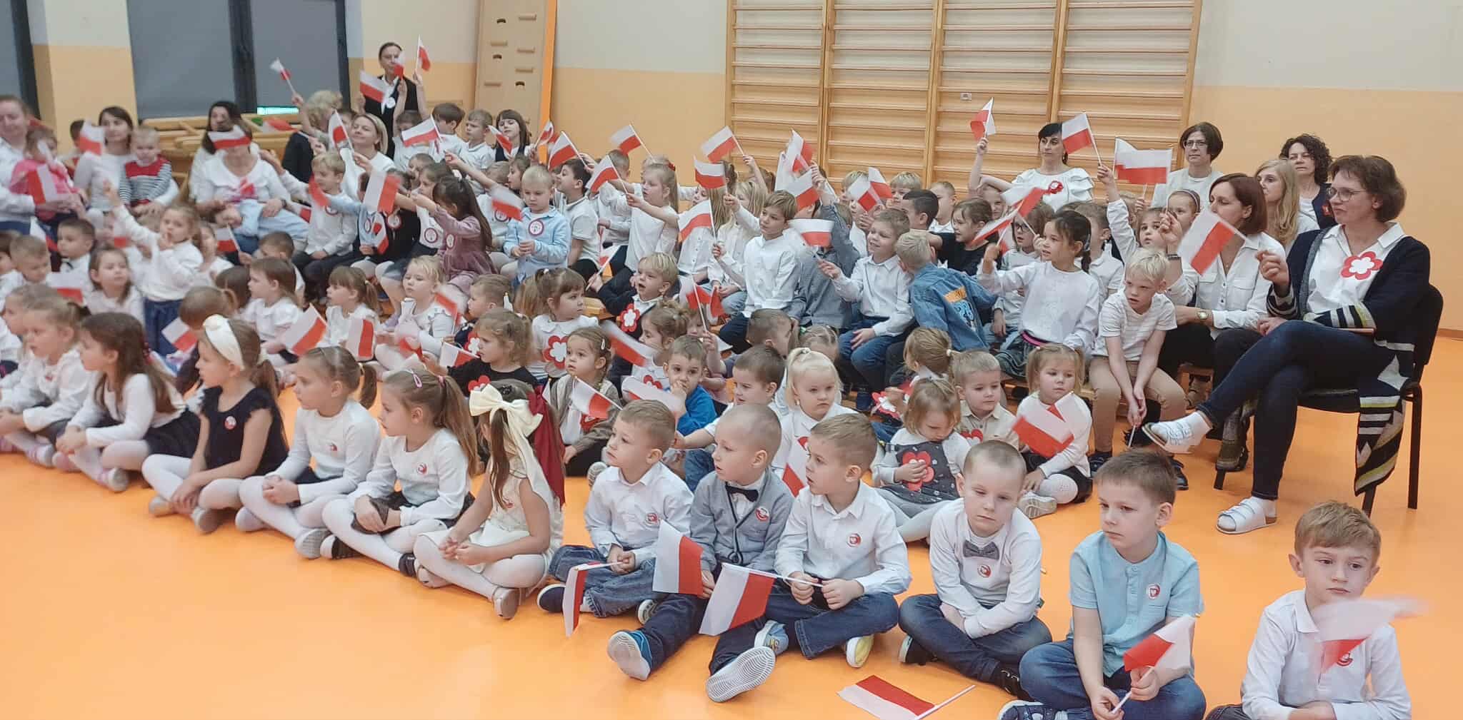Dzisiejszego dnia odbyła się uroczysta akademia. Akademia z okazji upamiętnienia kolejnej rocznicy odzyskania przez Polskę niepodległości. Koordynatorem tego wydarzania była Pani Iwonka i grupa Malinki. Dzieci wprowadziły uroczysty nastrój i zagłębiły całą społeczność przedszkola w ważne wydarzenia, o których wszyscy muszą wiedzieć. Grupę 6-latków dzielnie wspierały młodsze grupy: Truskaweczki, Morelki i Wisienki, które przygotowały piosenki z układami tanecznymi. Grupy 4-latków zaprezentowały się w tradycyjnych strojach ludowych. Cała społeczność przedszkolna uroczyście odśpiewała Hymn Polski, dołączając do akcji Szkoła do hymnu.