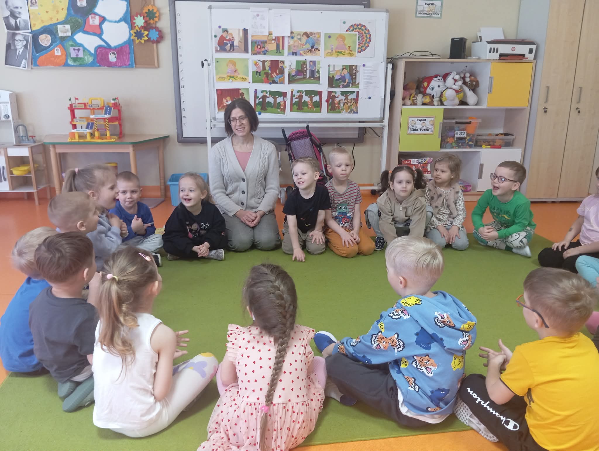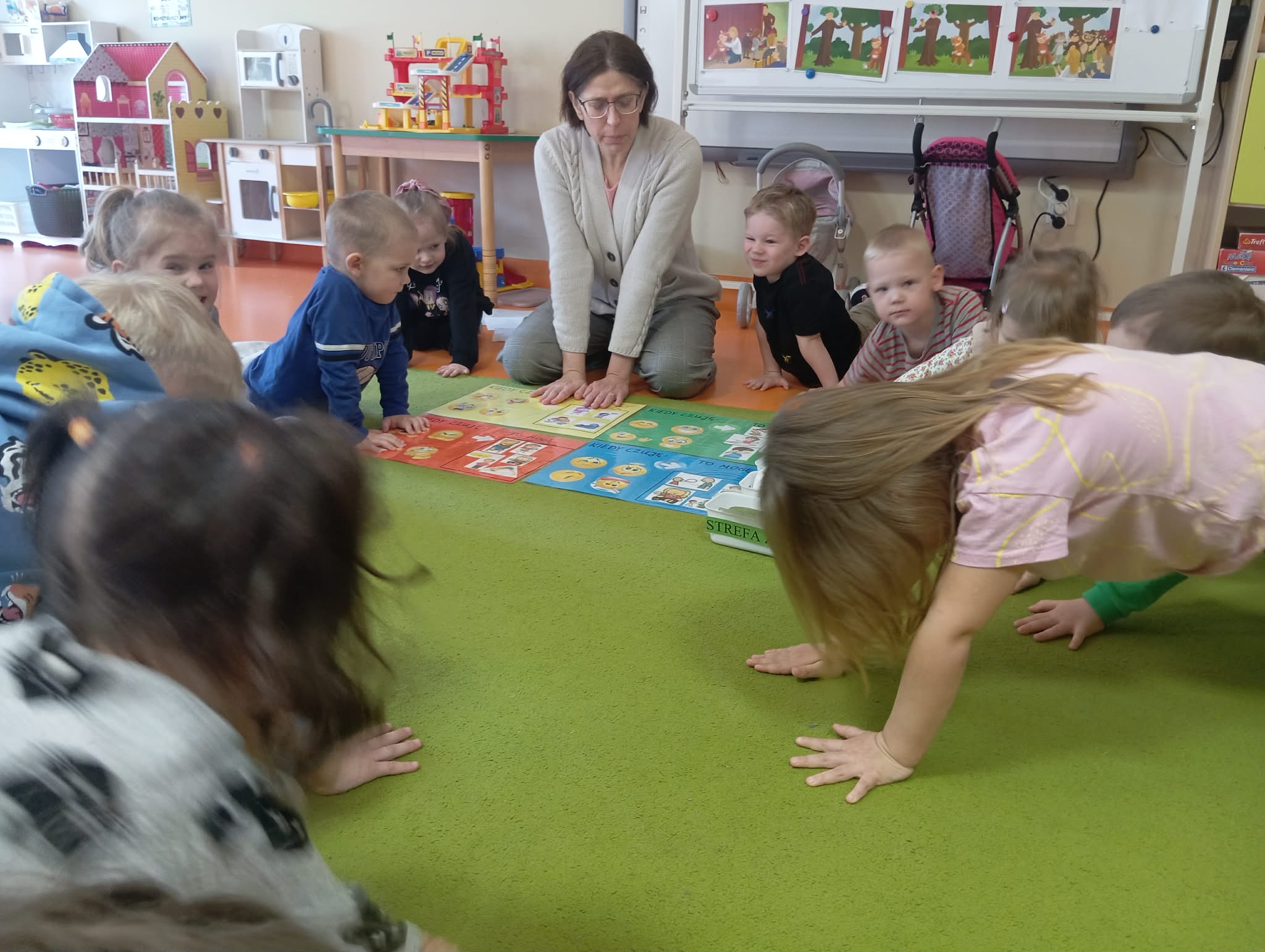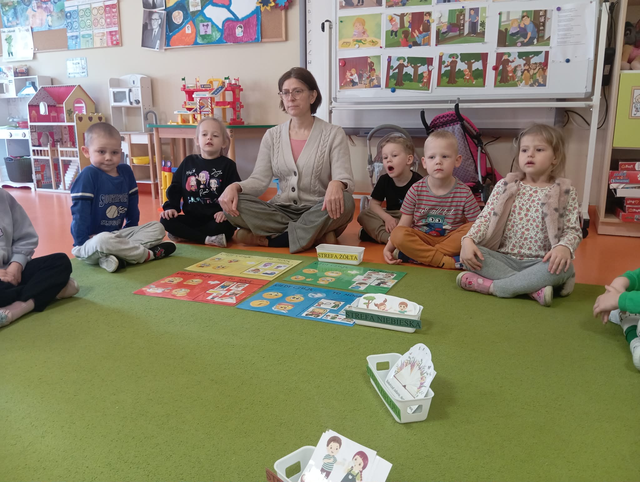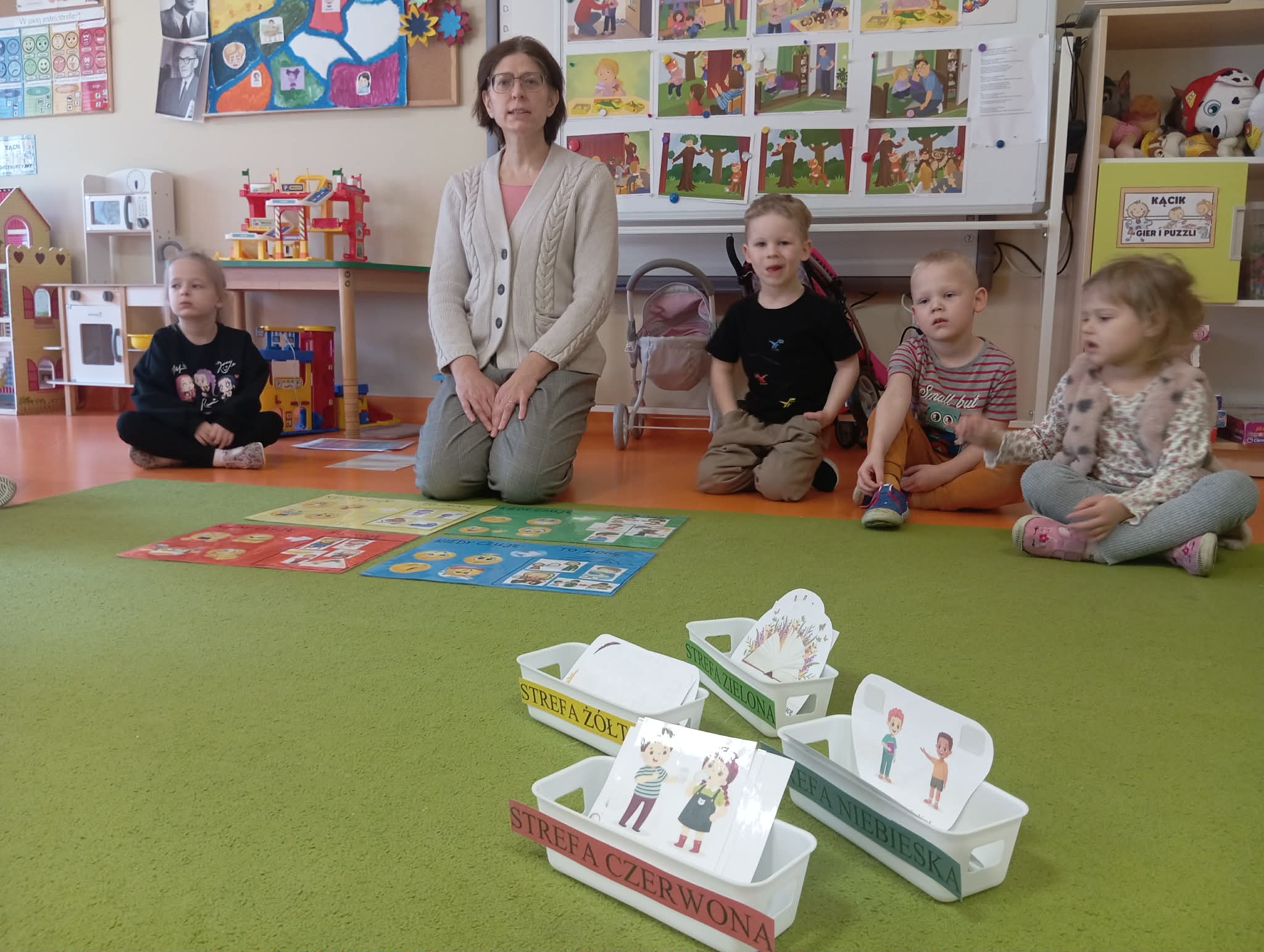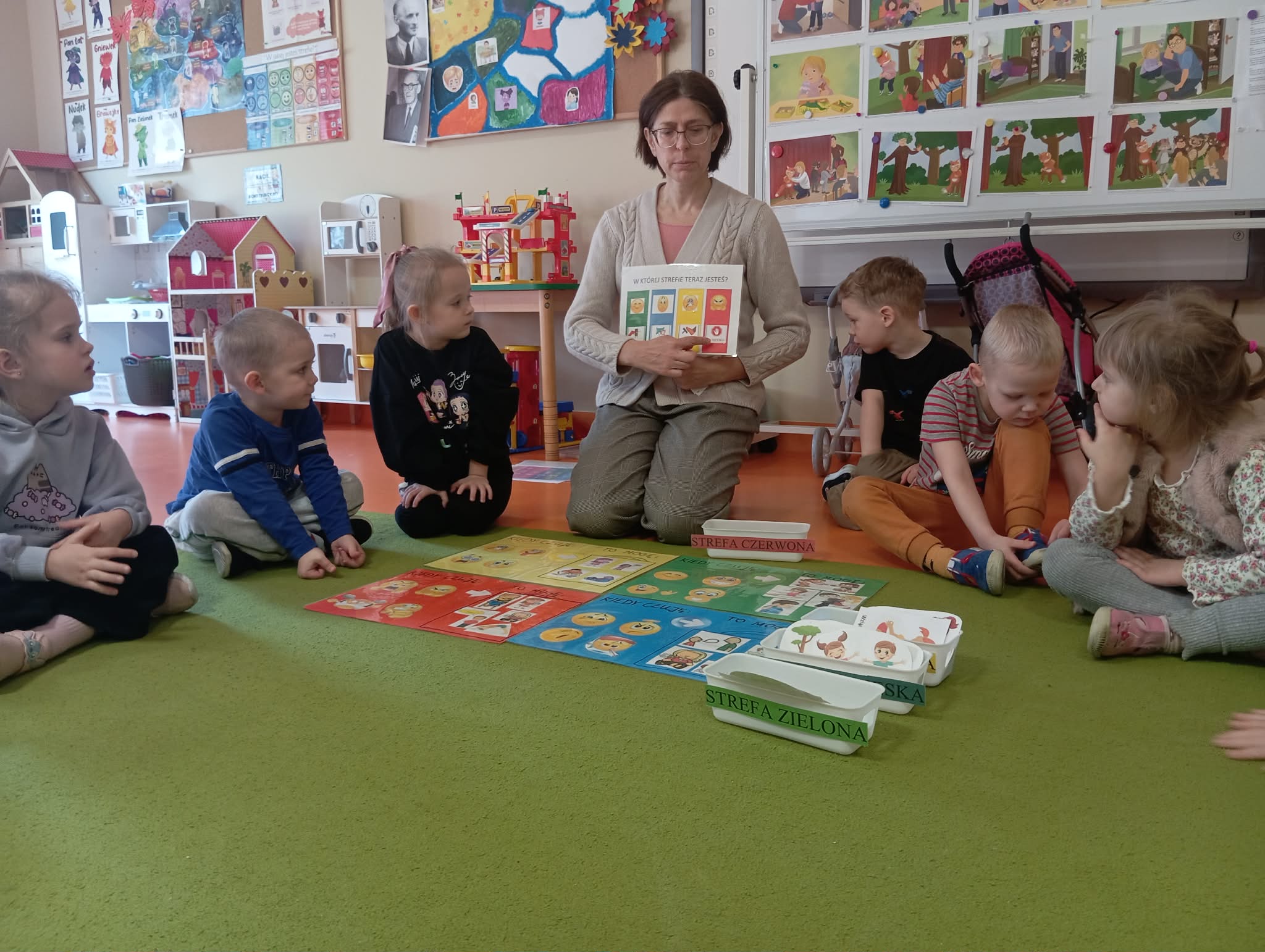 Dzisiejszego dnia odwiedziła nas Pani Anetka - nasza Pani Psycholog. Wspólnie z Panią Anetką rozmawialiśmy na temat bardzo ważny. a są nim emocje. Poznaliśmy strefy emocji w jakich możemy się znaleźć oraz sposoby, jak sobie radzić z trudnymi emocjami. Dzieci wiedzą w jakiej strefie są najbardziej gotowe do działania oraz w jakich trzeba powiedzieć "stop", zatrzymać się i zacząć sobie pomagać.