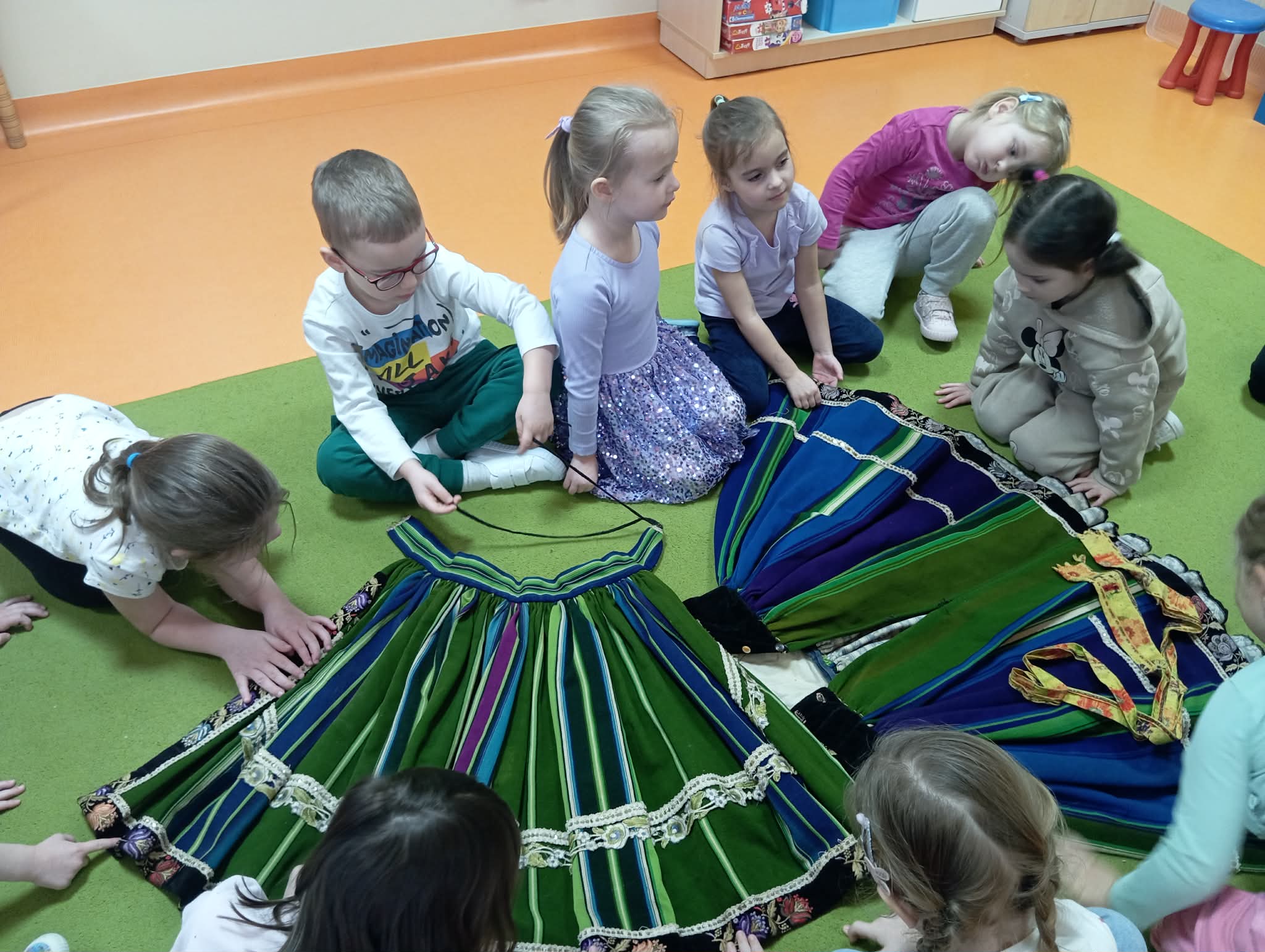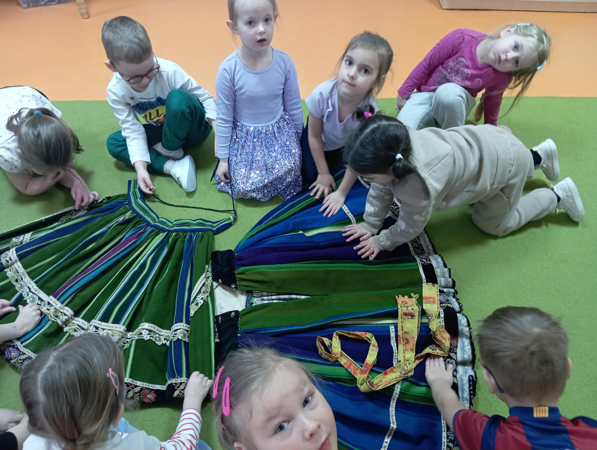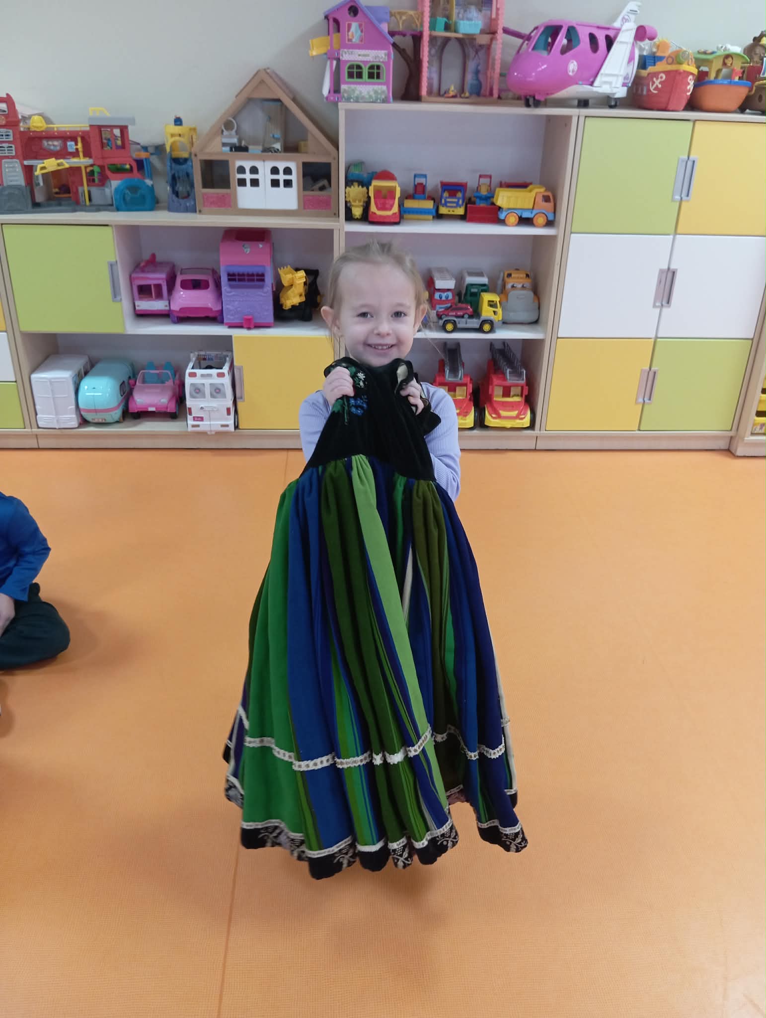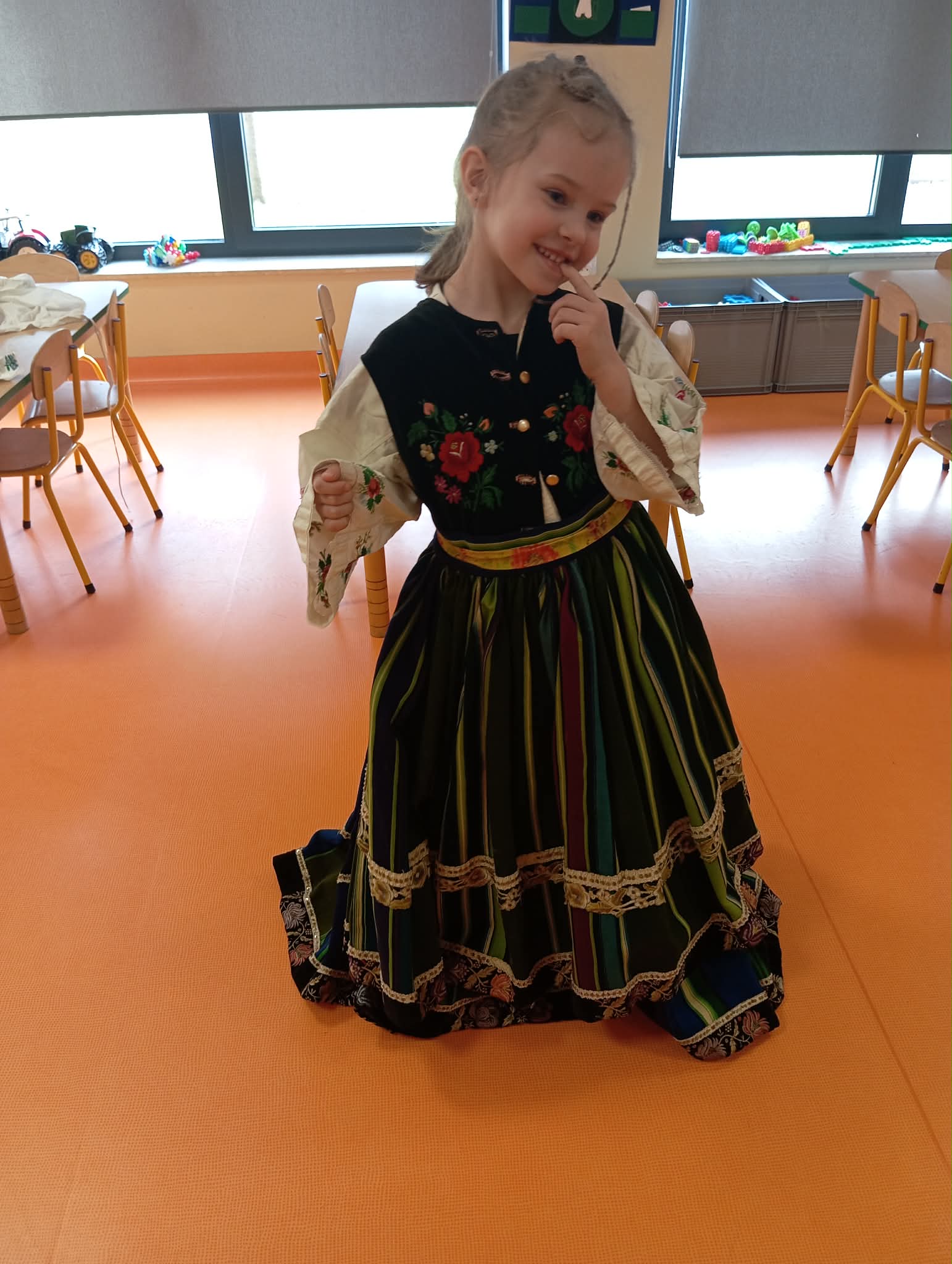 Na dzisiejszych zajęciach Morelki poznały łowicki folklor, sztukę tworzenia wycinanek. Miały okazję obejrzenia i przymierzenia łowickiego, damskiego stroju. Dzieci z zainteresowanie oglądały łowickicie tańce oraz słuchały regionalnej muzyki.