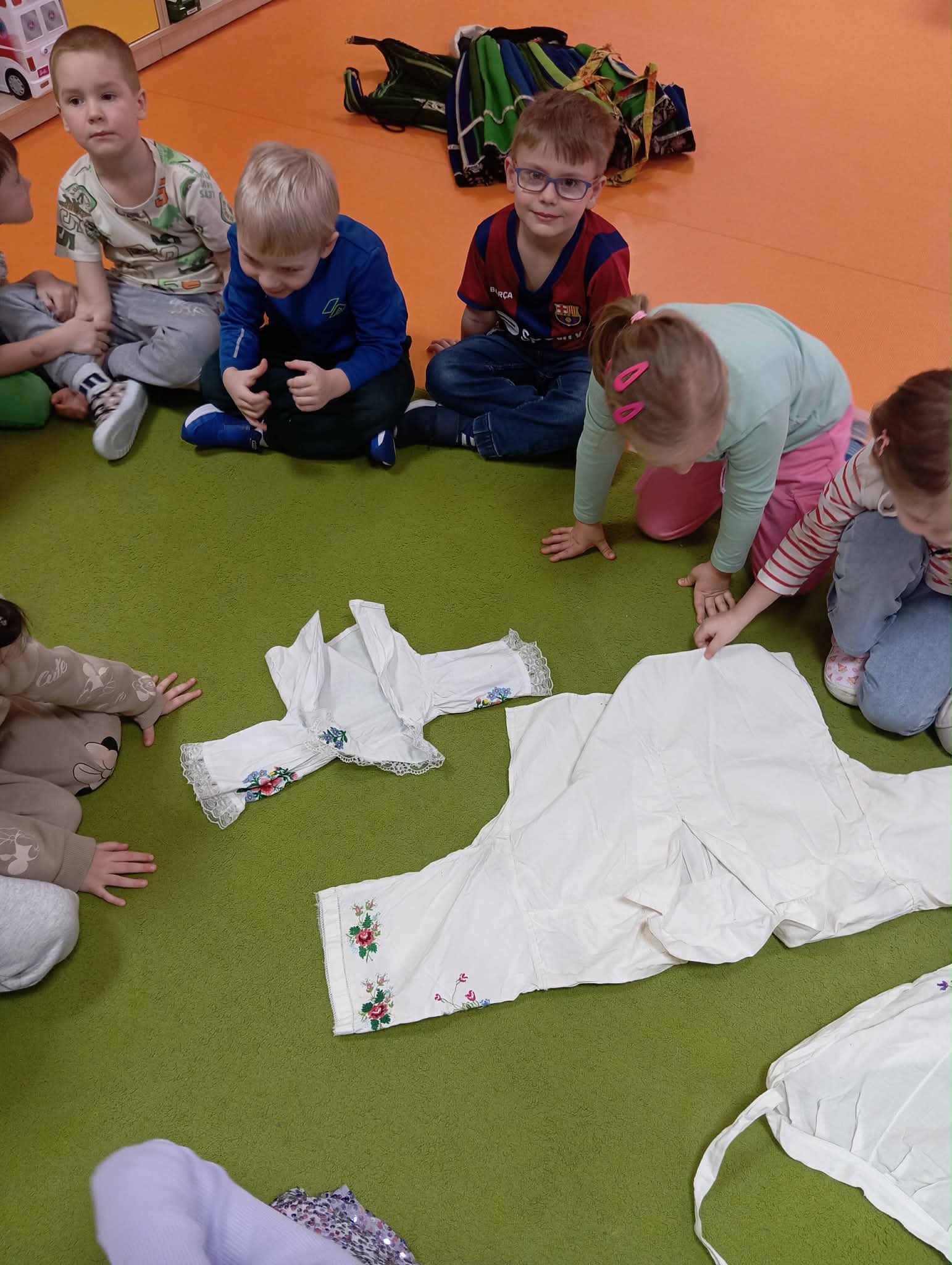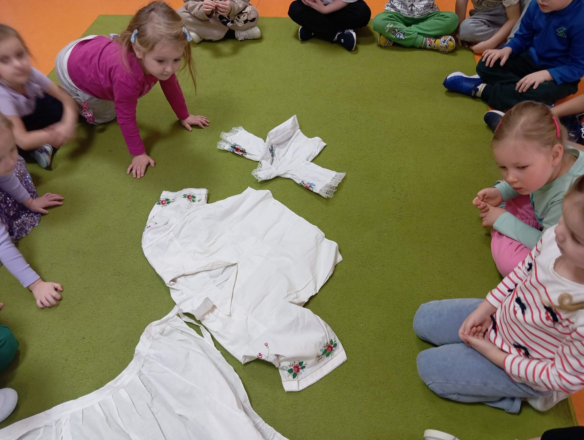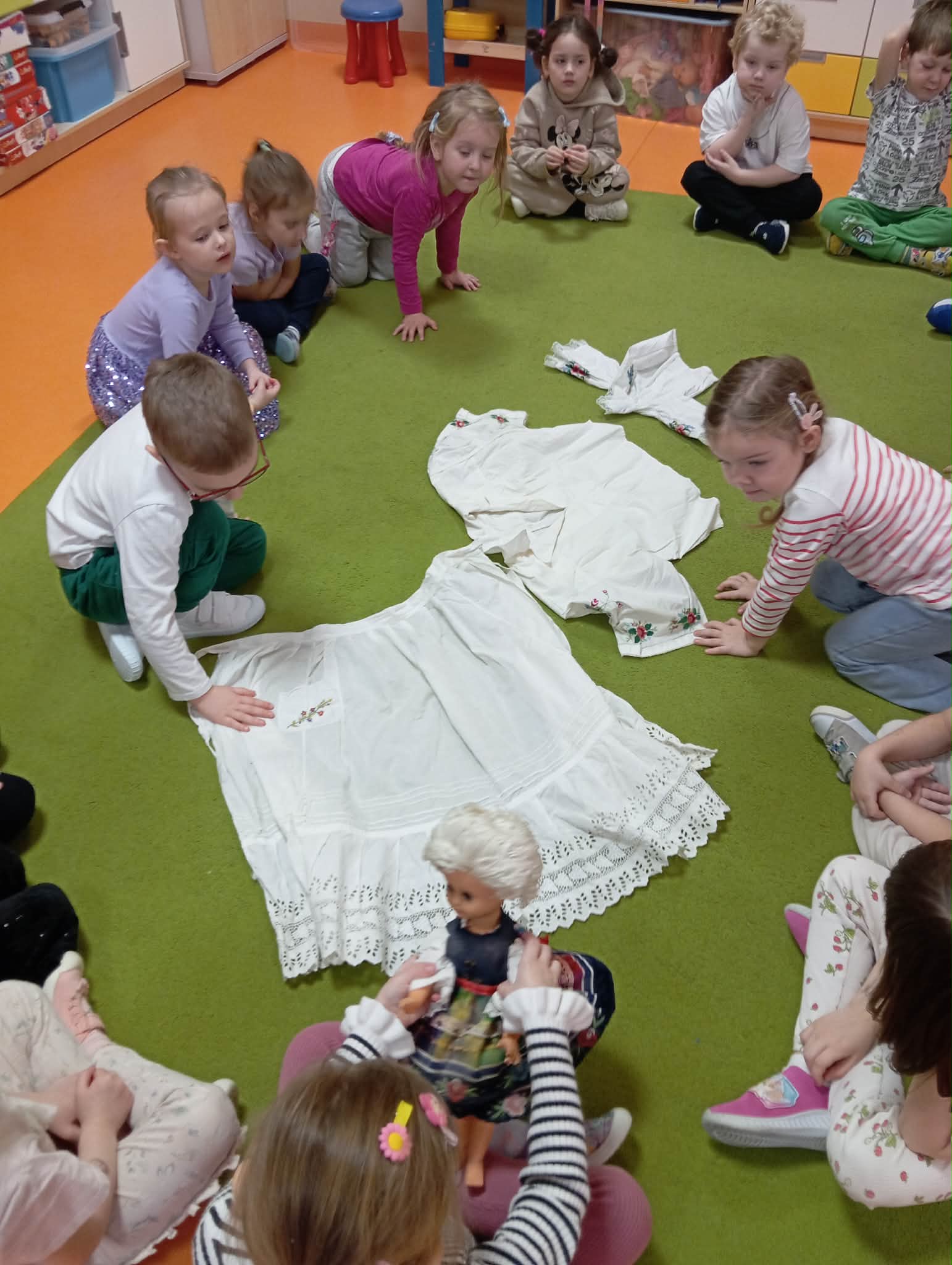 Na dzisiejszych zajęciach Morelki poznały łowicki folklor, sztukę tworzenia wycinanek. Miały okazję obejrzenia i przymierzenia łowickiego, damskiego stroju. Dzieci z zainteresowanie oglądały łowickicie tańce oraz słuchały regionalnej muzyki.