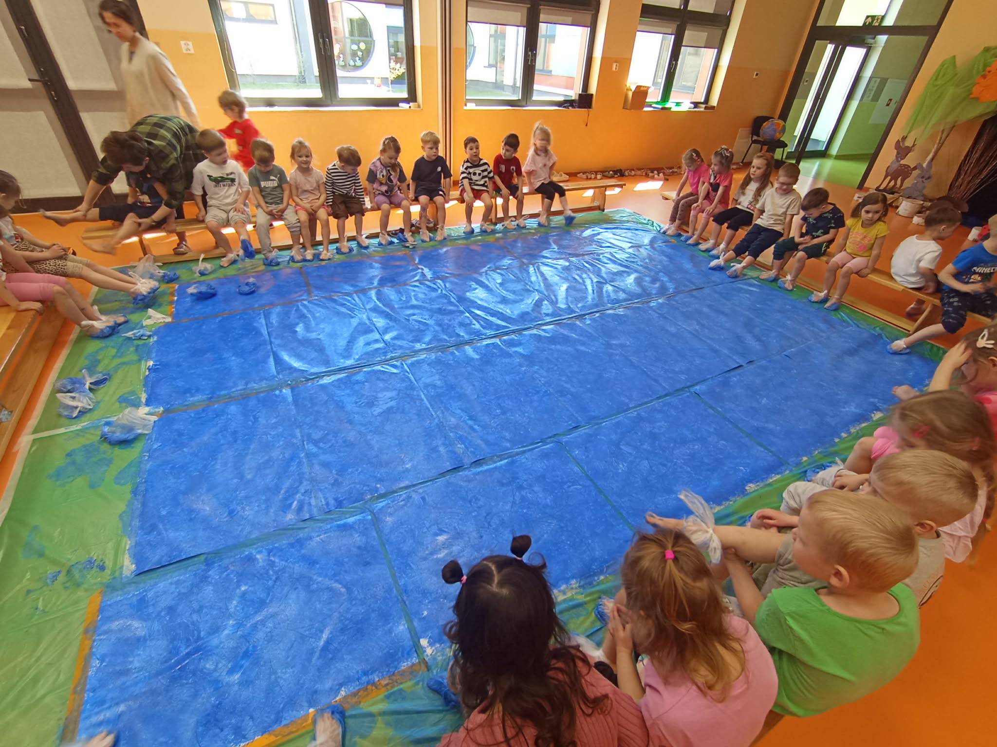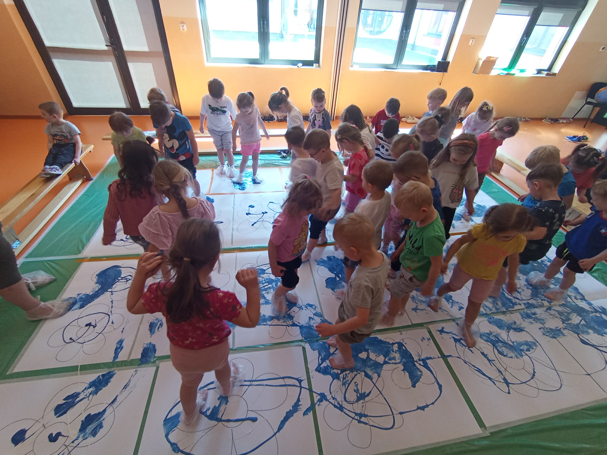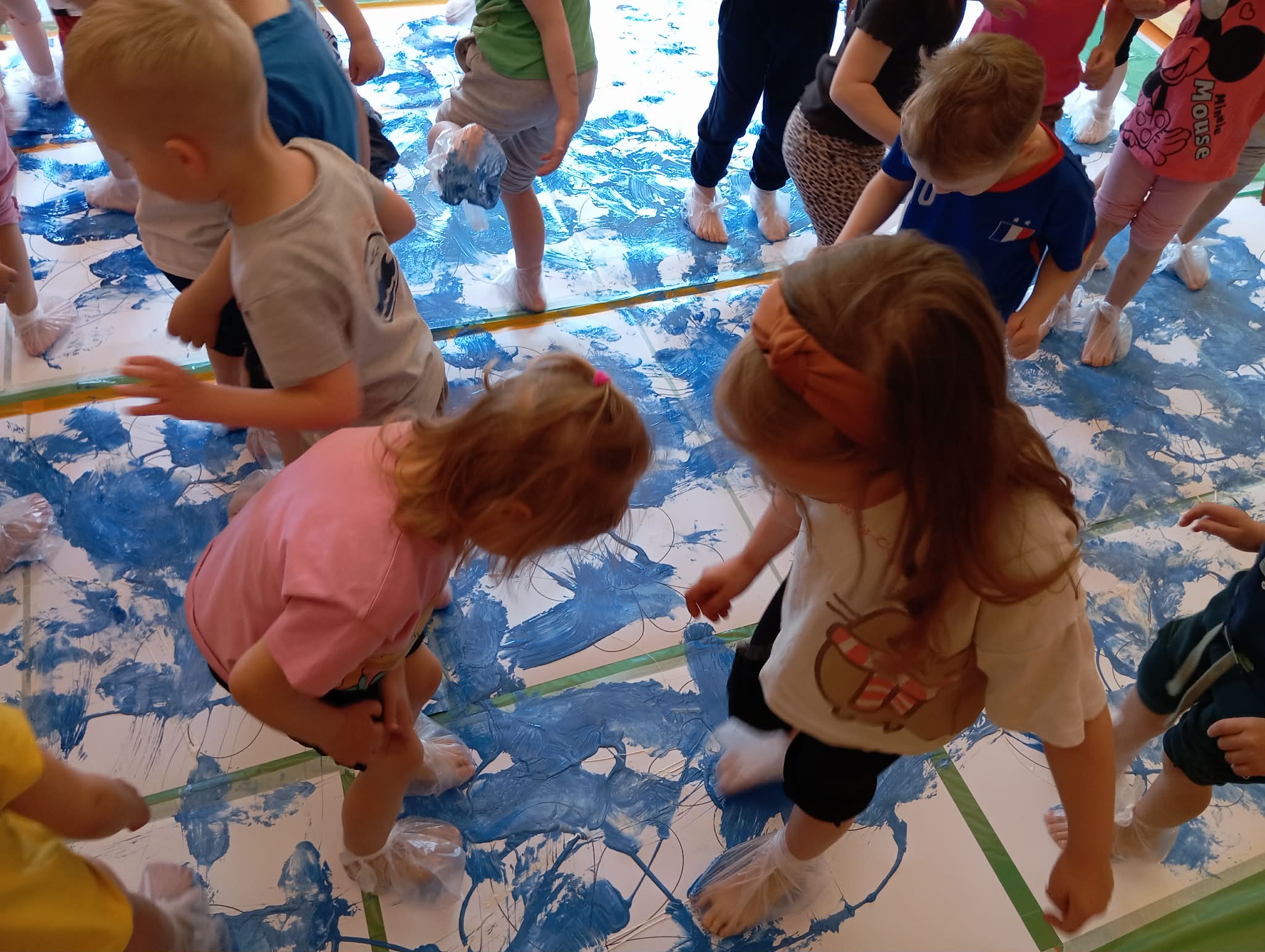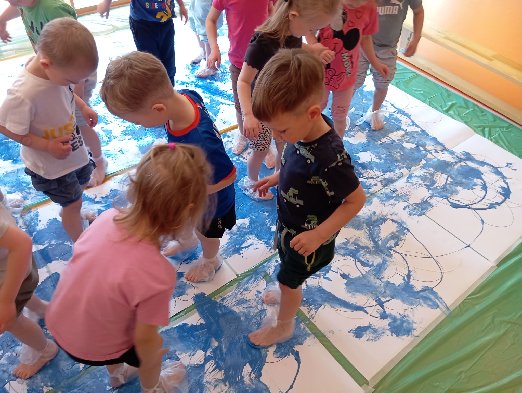 Kolejną aktywnością w ramach niebieskiego miesiąca było malowanie stopami. Morelki i Truskawki spotkały się na sali gimnastycznej, by wspólnie stworzyć piękne kwiaty, które następnie ozdobiły nasze przedszkole. Dzieci z pełnym zaciekawieniem i zaangażowaniem podeszły do zadania.