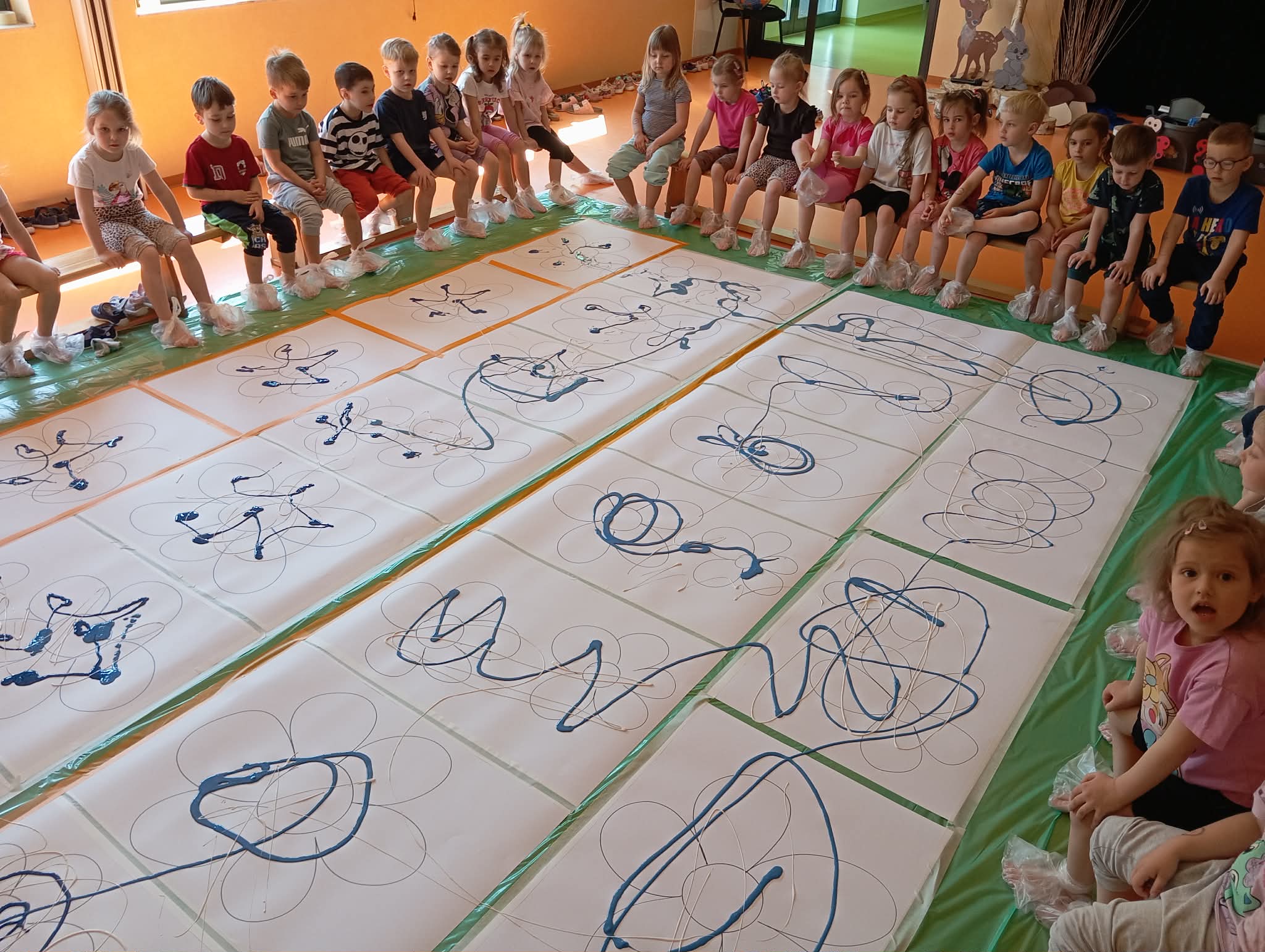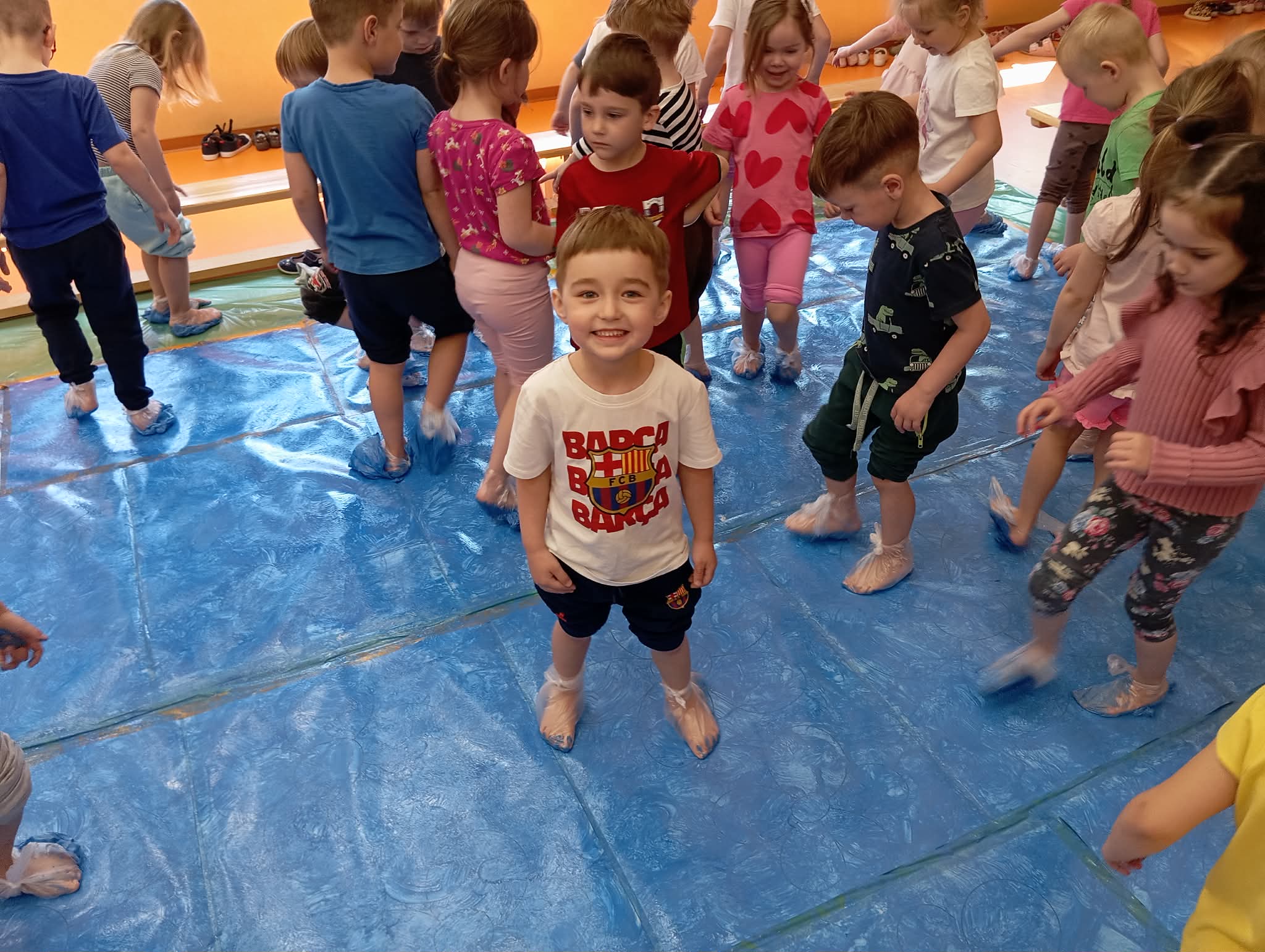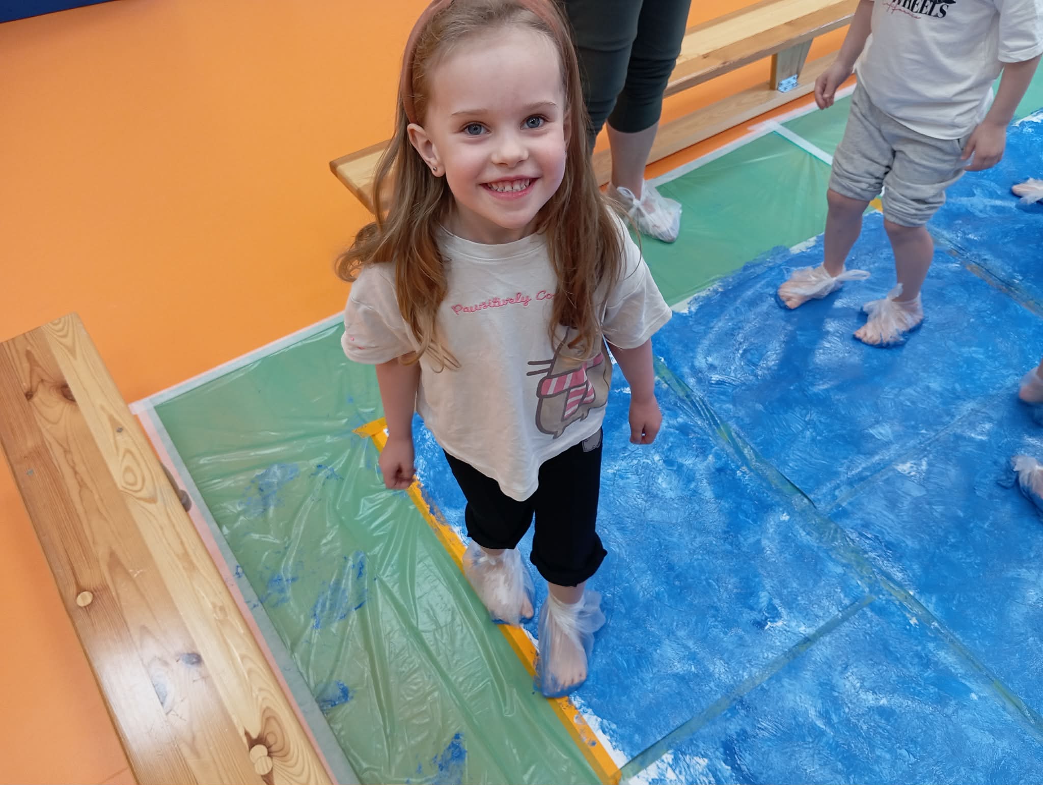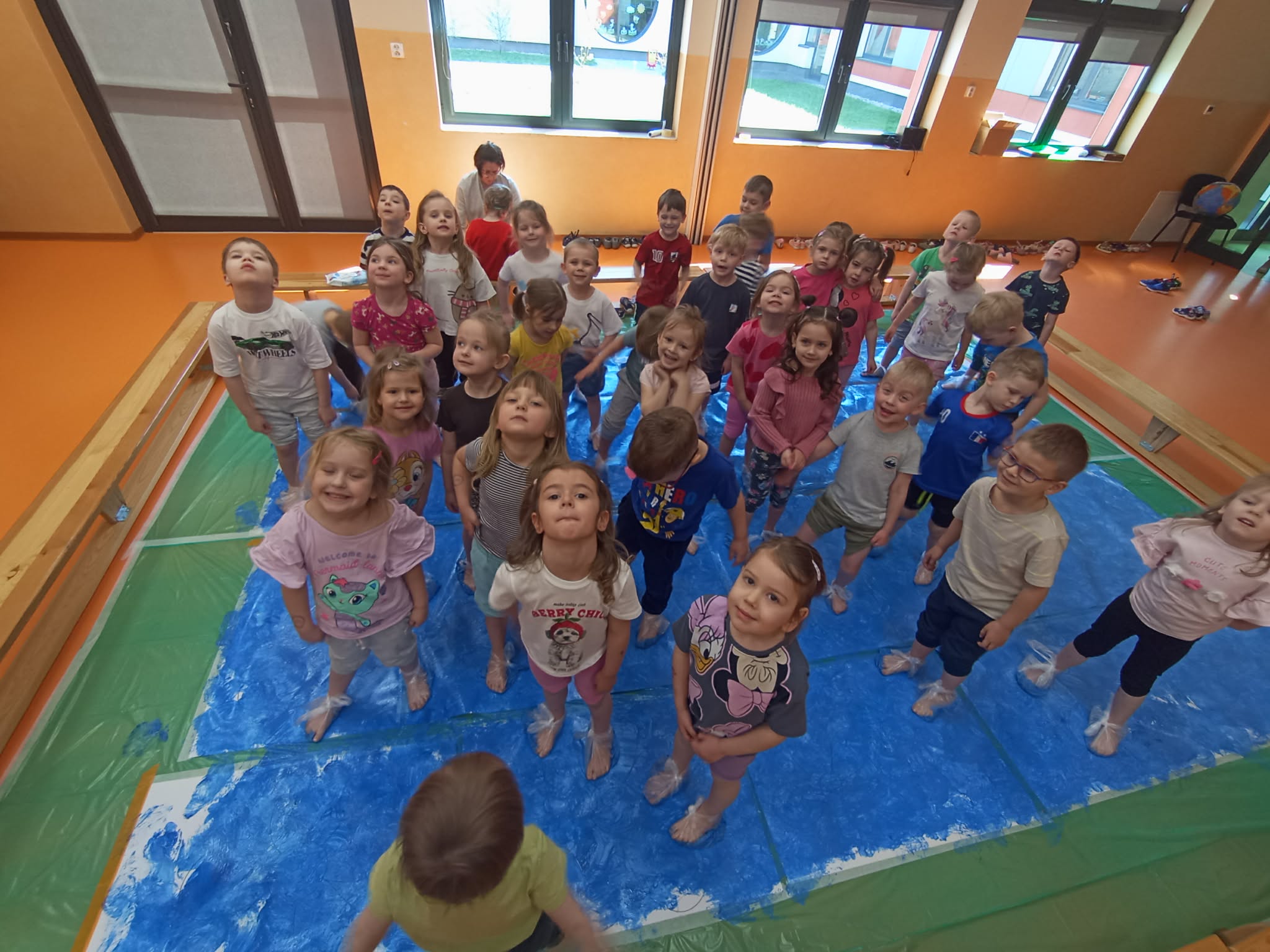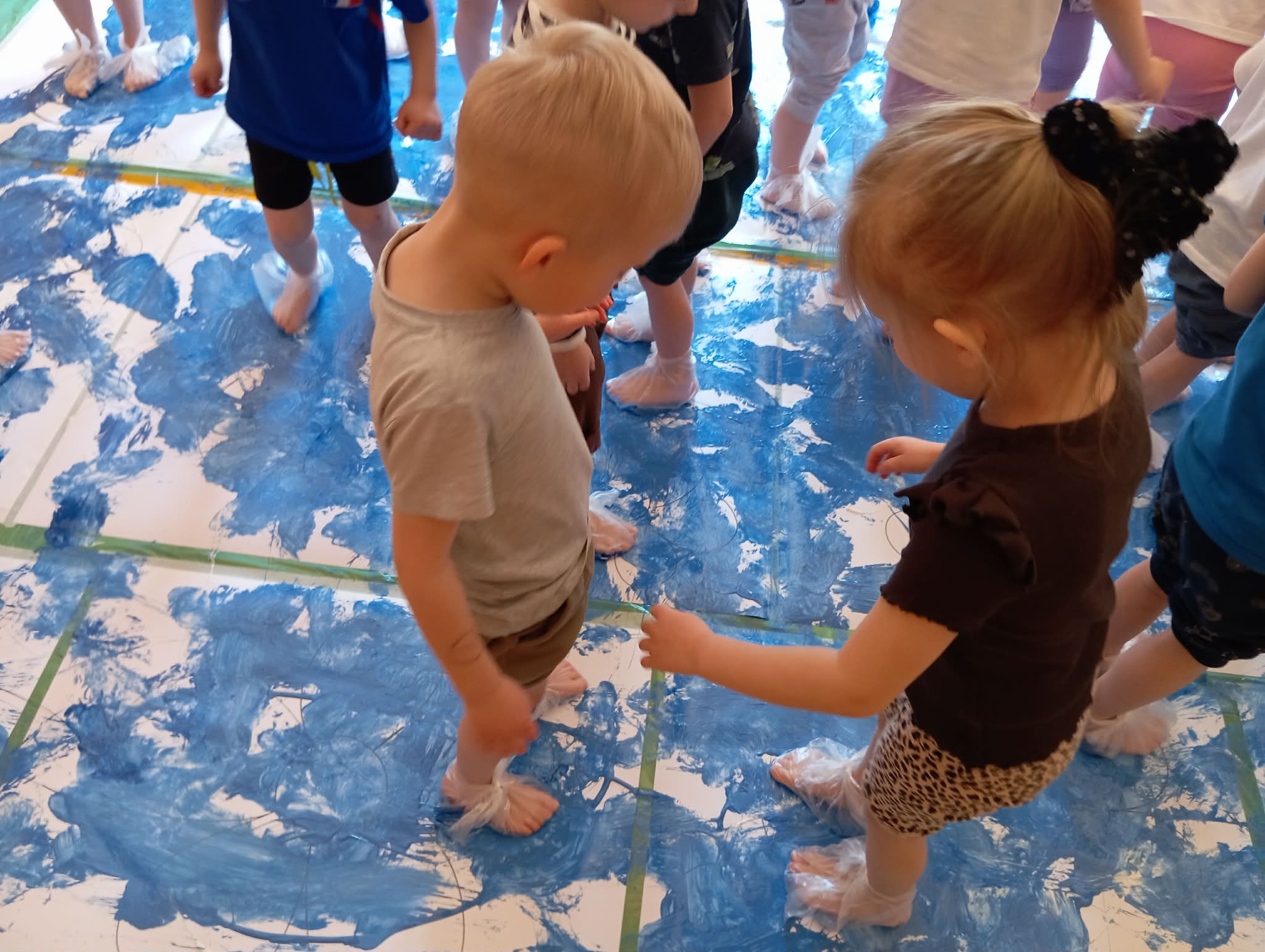 Kolejną aktywnością w ramach niebieskiego miesiąca było malowanie stopami. Morelki i Truskawki spotkały się na sali gimnastycznej, by wspólnie stworzyć piękne kwiaty, które następnie ozdobiły nasze przedszkole. Dzieci z pełnym zaciekawieniem i zaangażowaniem podeszły do zadania.
