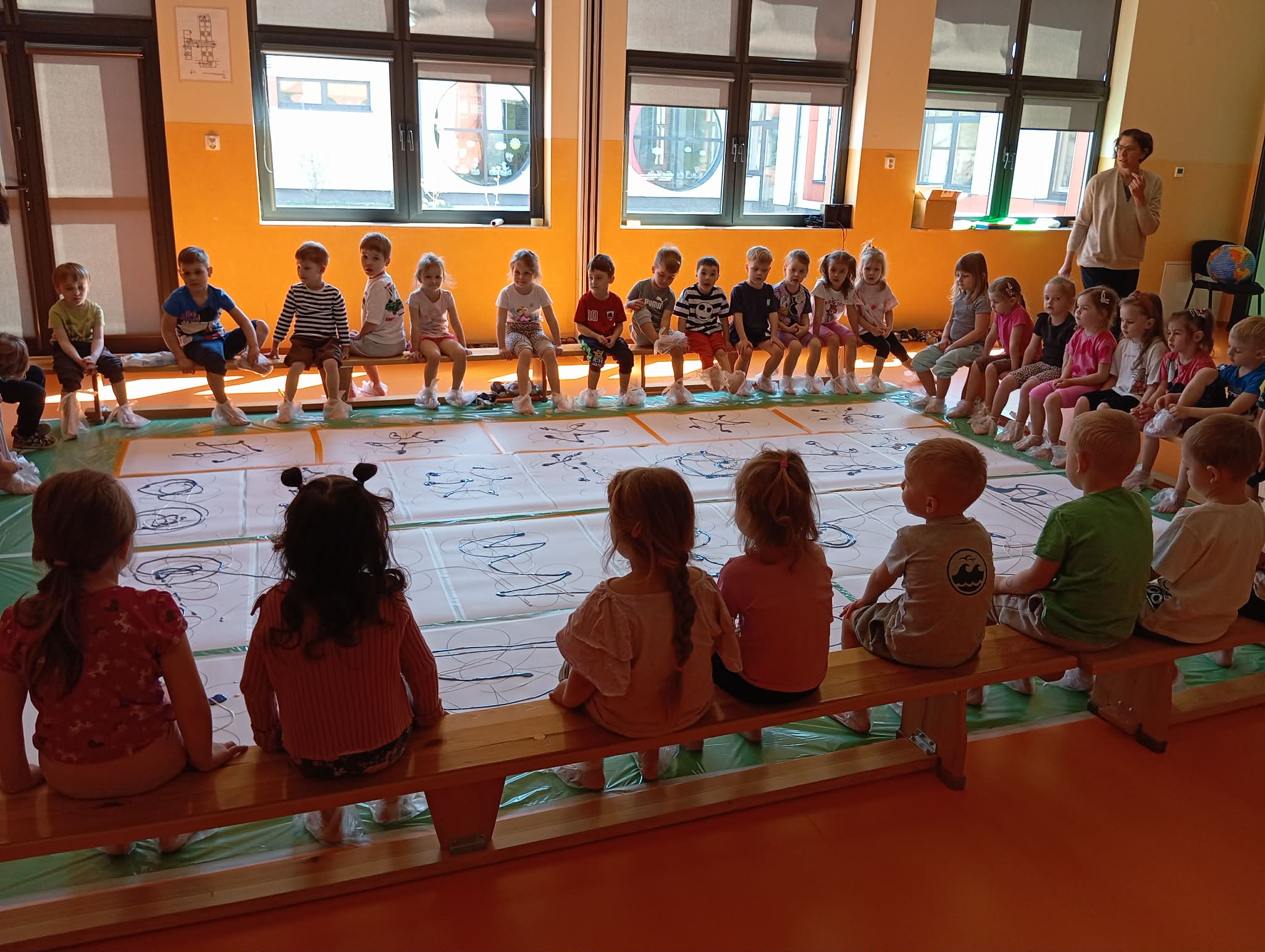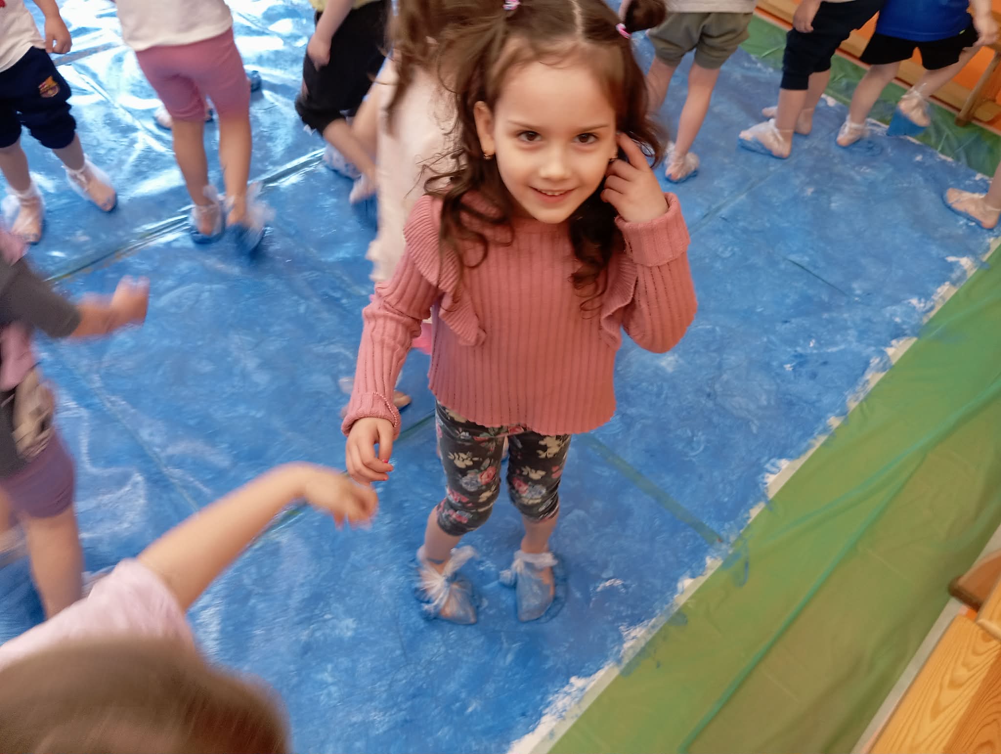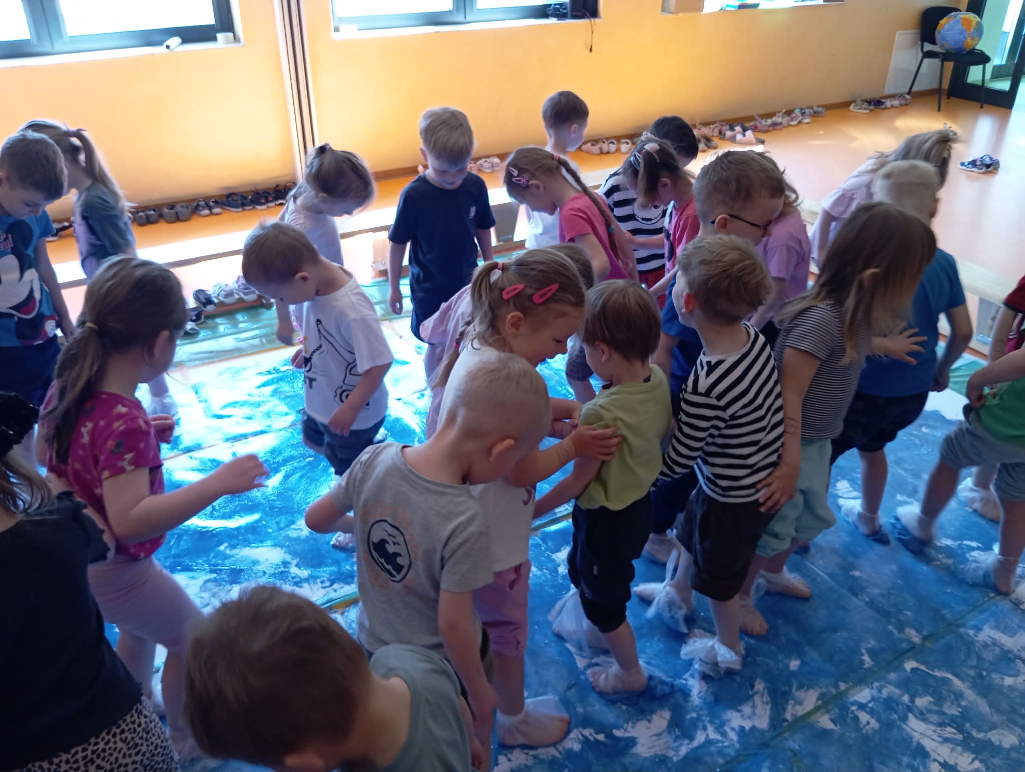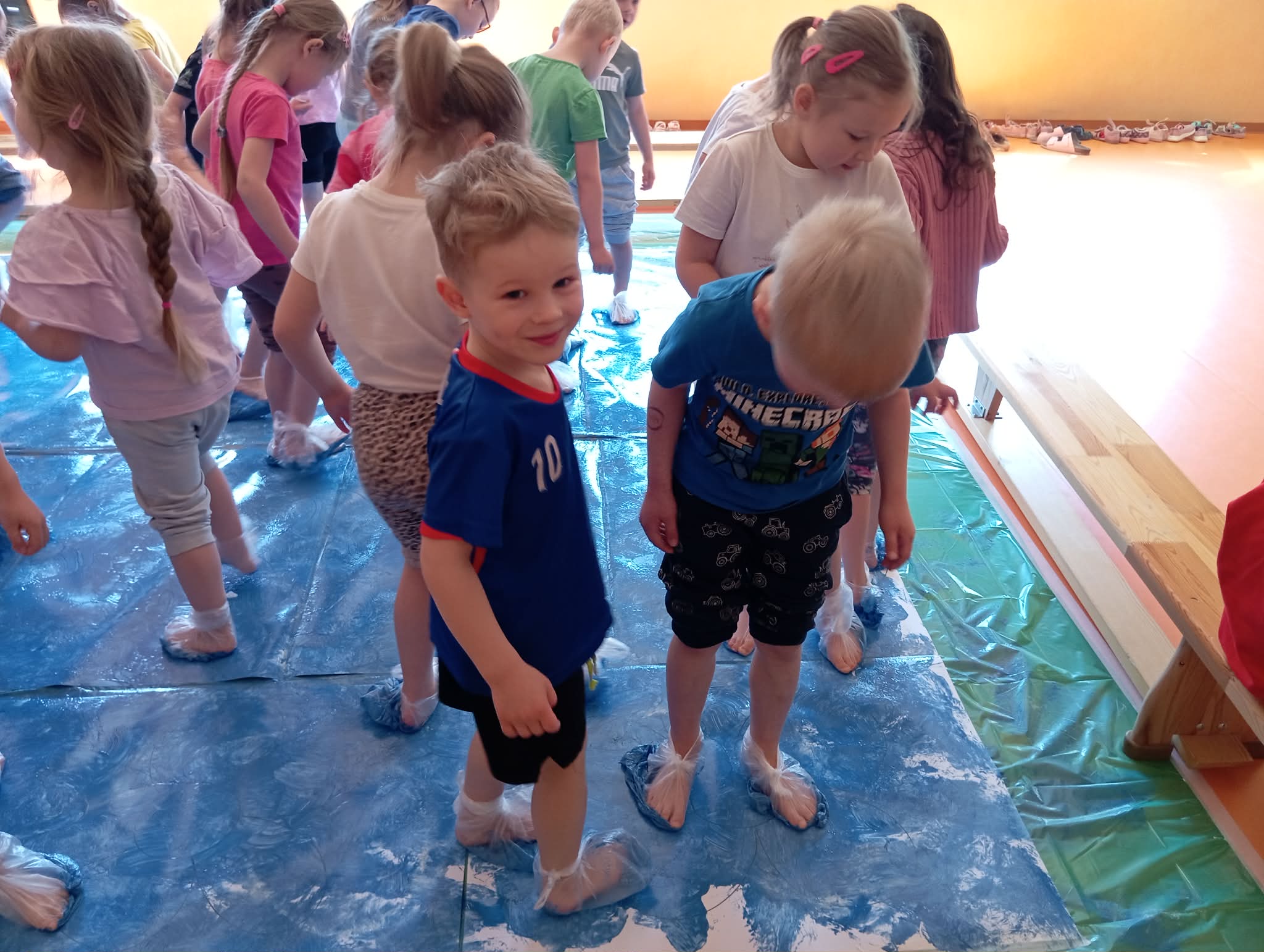 Kolejną aktywnością w ramach niebieskiego miesiąca było malowanie stopami. Morelki i Truskawki spotkały się na sali gimnastycznej, by wspólnie stworzyć piękne kwiaty, które następnie ozdobiły nasze przedszkole. Dzieci z pełnym zaciekawieniem i zaangażowaniem podeszły do zadania.