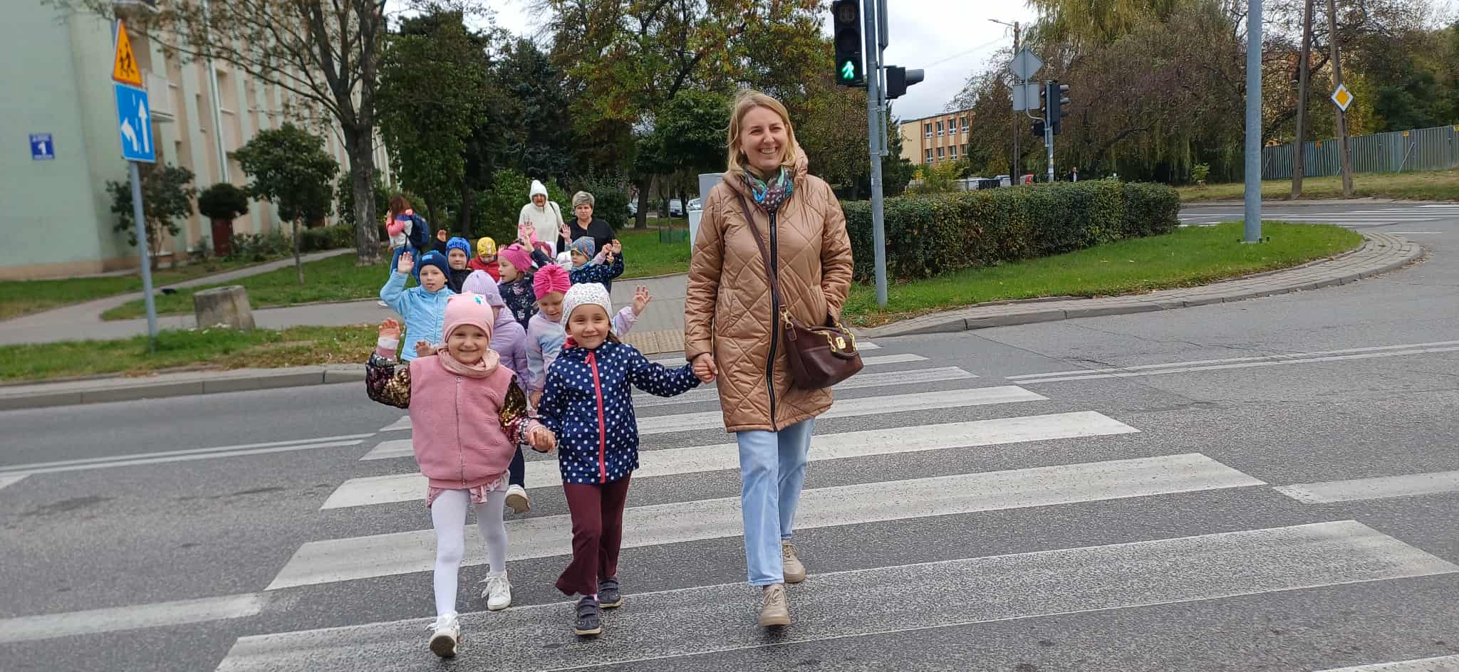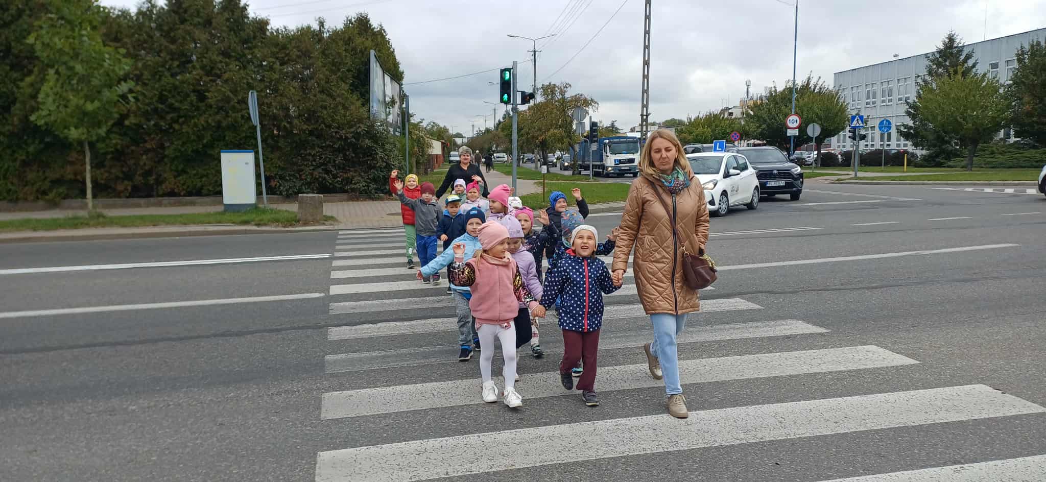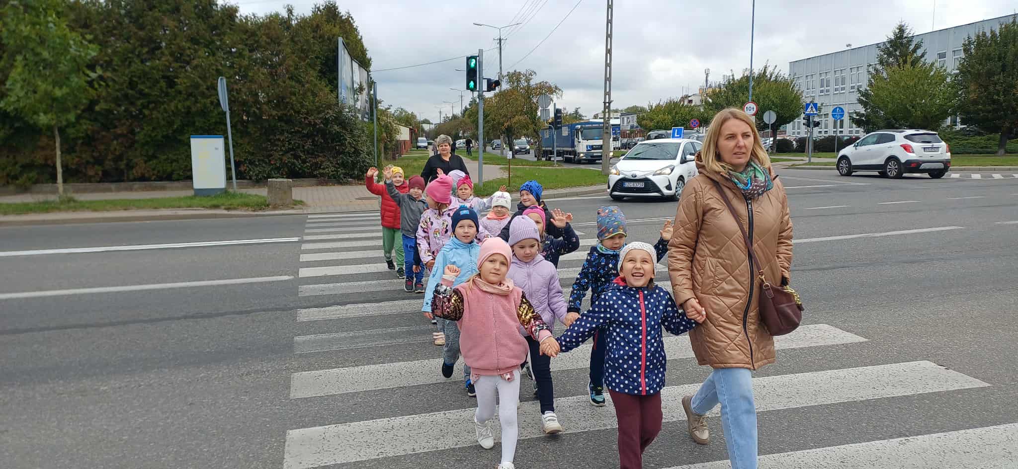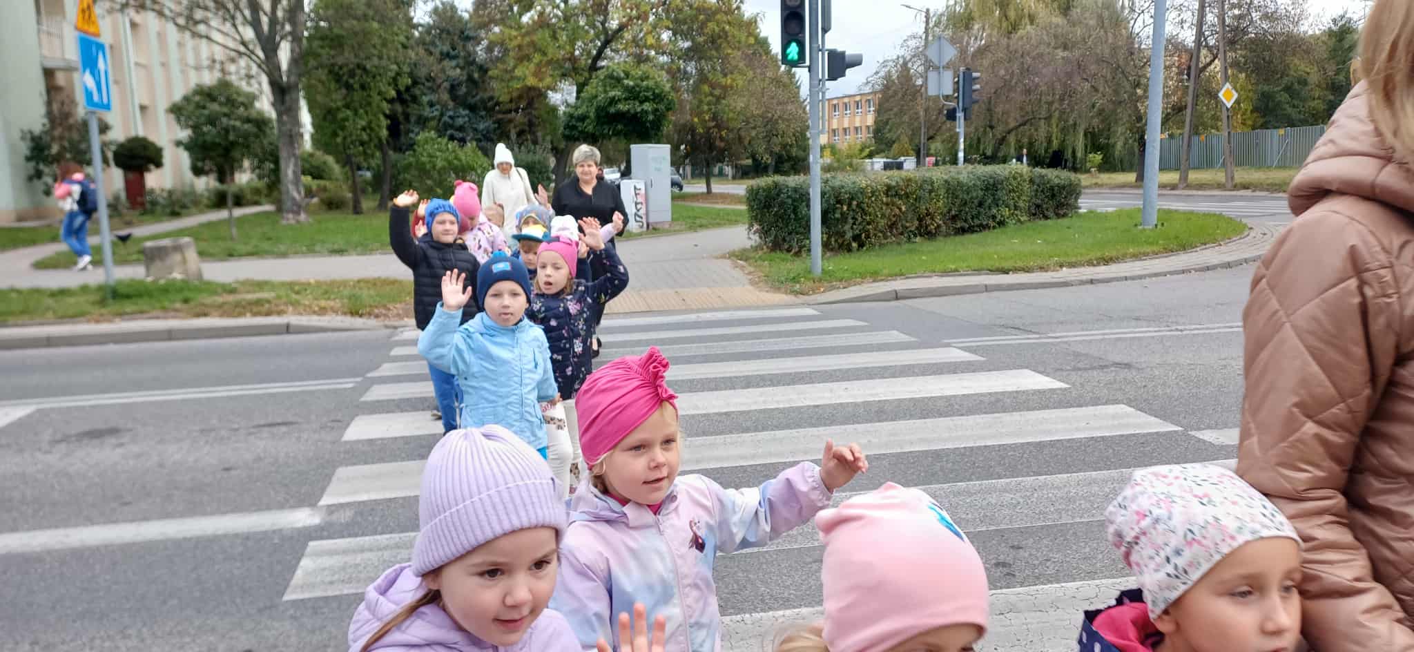 "Wisienki" podczas spacerków ćwiczą bezpieczne przechodzenie przez  ulicę.