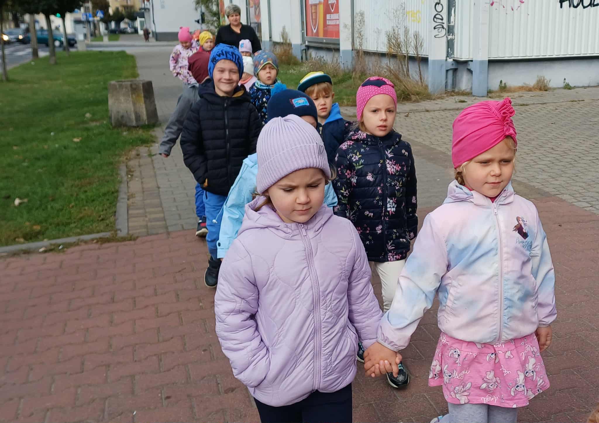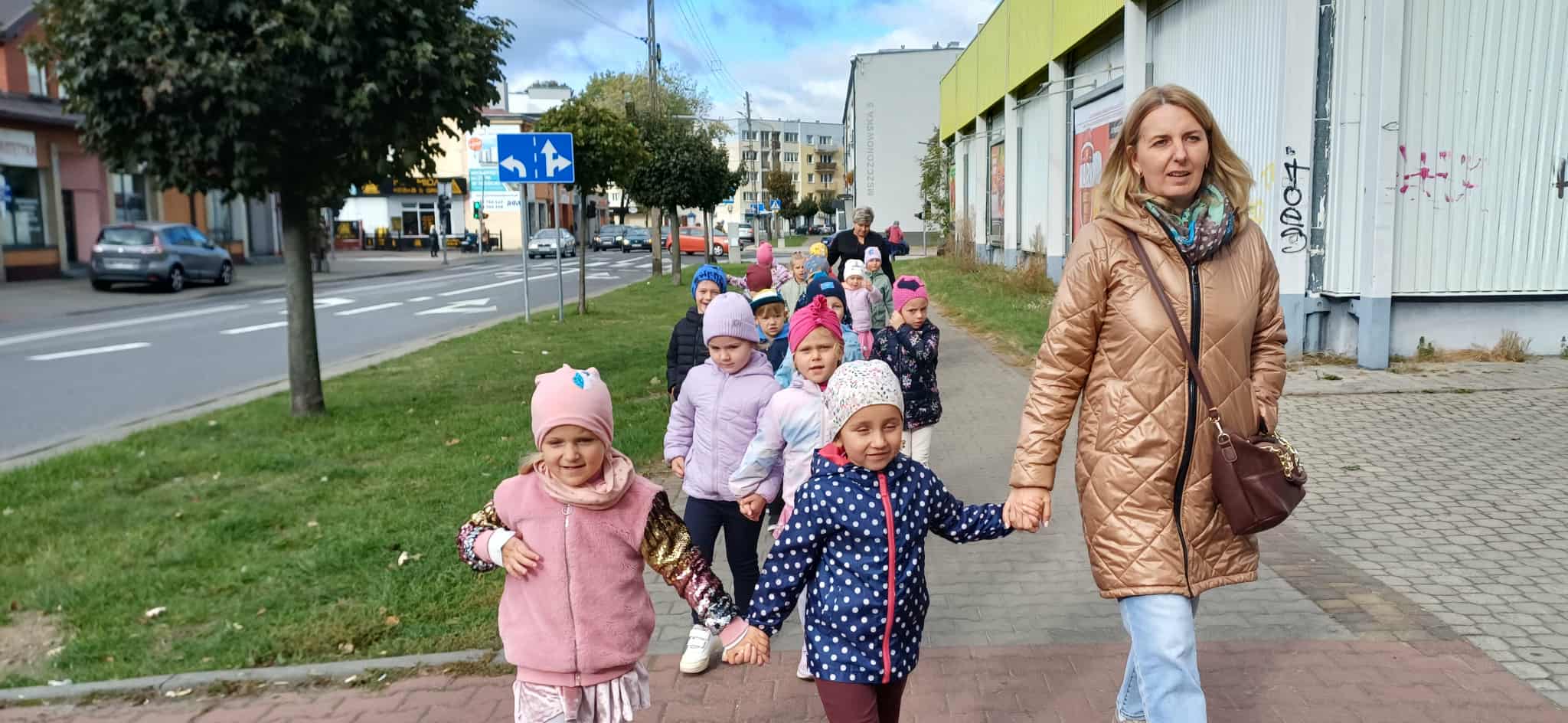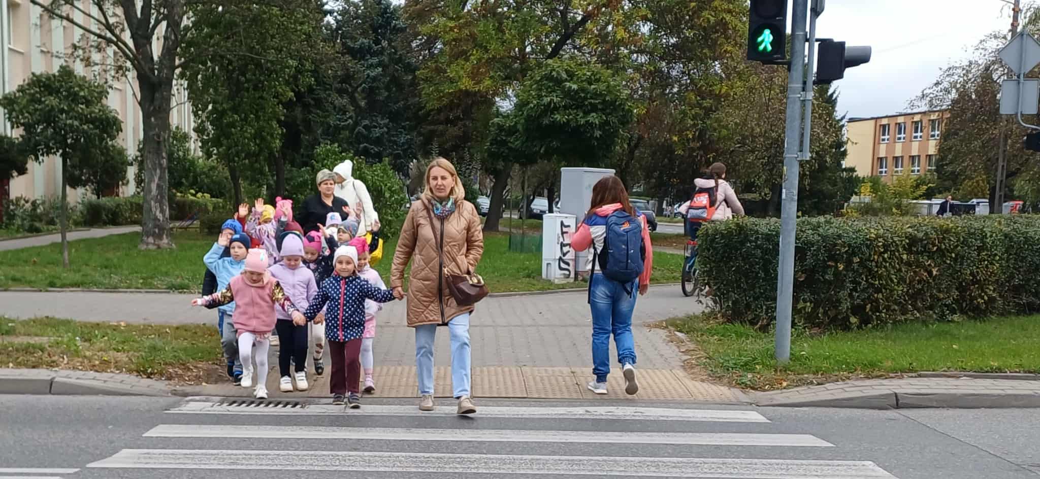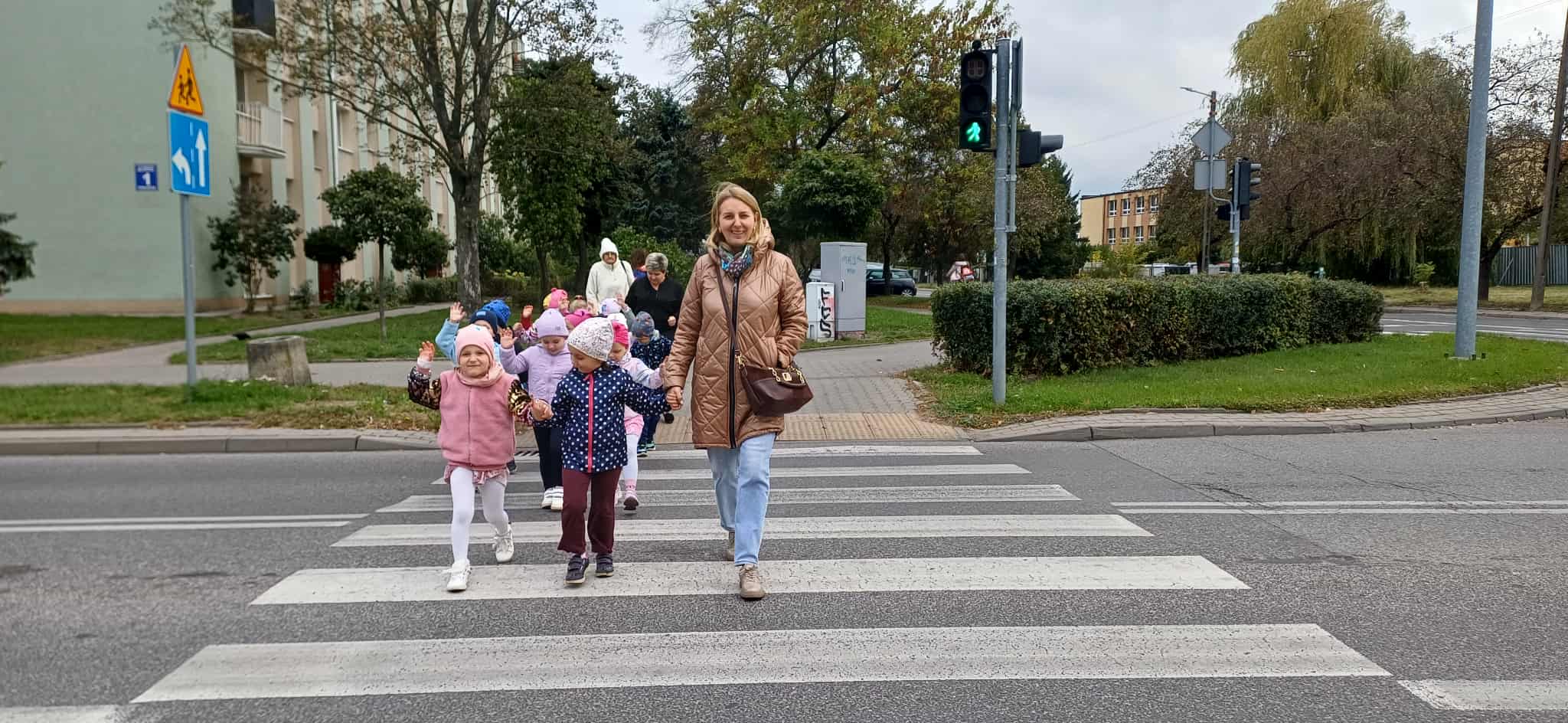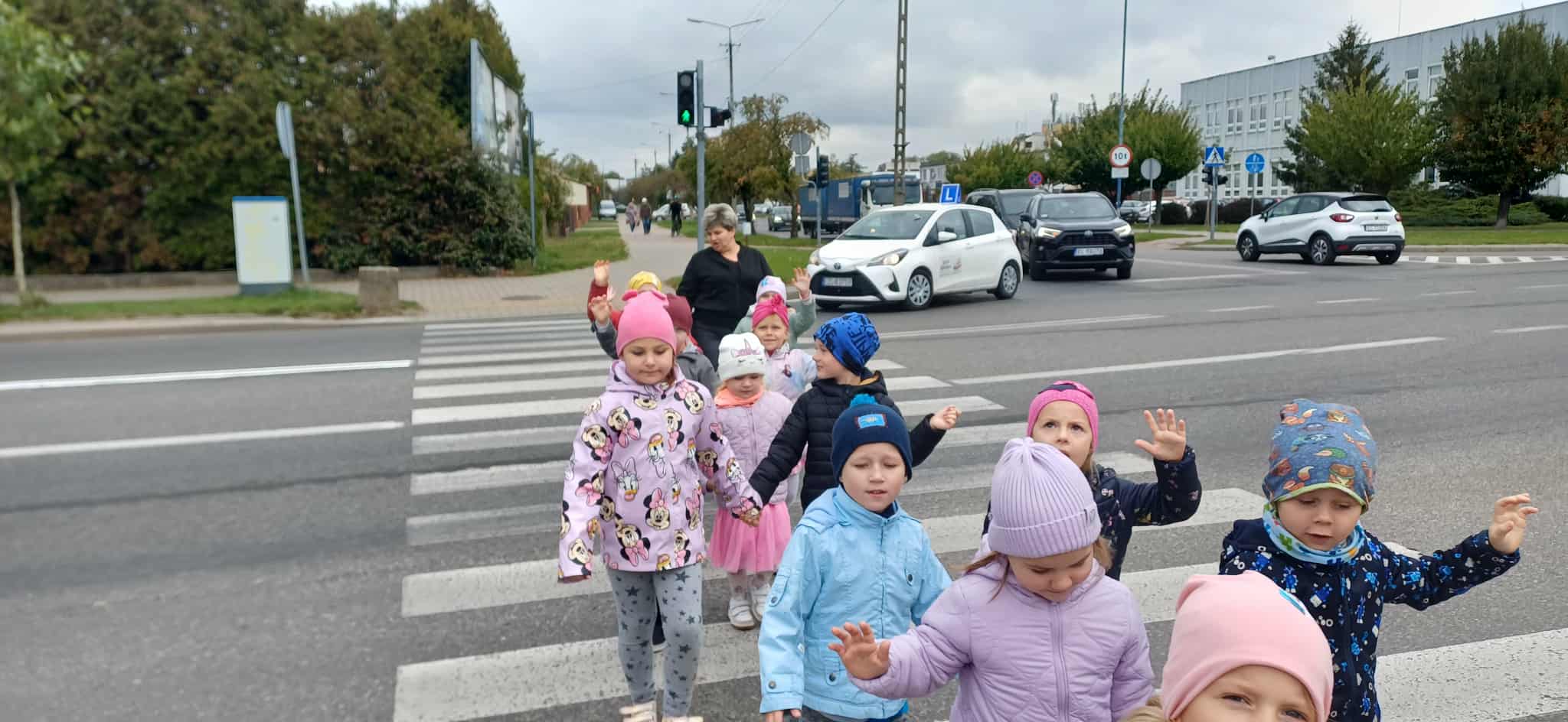 "Wisienki" podczas spacerków ćwiczą bezpieczne przechodzenie przez  ulicę.