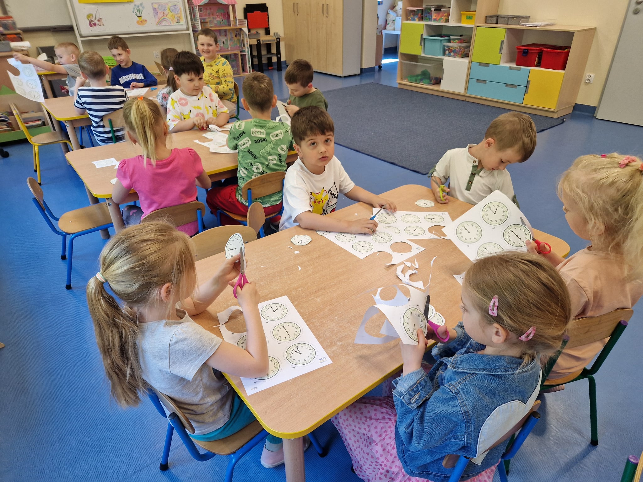 Ostatni etap naszego projektu. Tym razem przez cały tydzień podczas zajęć badaliśmy i mierzyliśmy świat. Określaliśmy długość i szerokość dywanu, naszej sali. Sprawdzaliśmy ile kroków musimy zrobić, by przejść z jednego punktu do drugiego. Porównywaliśmy ile stóp dziecięcych, a ile stóp dorosłego człowieka mierzy nasz dywan. Określaliśmy temperaturę i sprawdzaliśmy, jak należy sie ubrać, w zależności czy jest ciepło czy zimno. Zbudowaliśmy ogromny zegar i przekręcaliśmy wskazówki na konkretną godzinę.