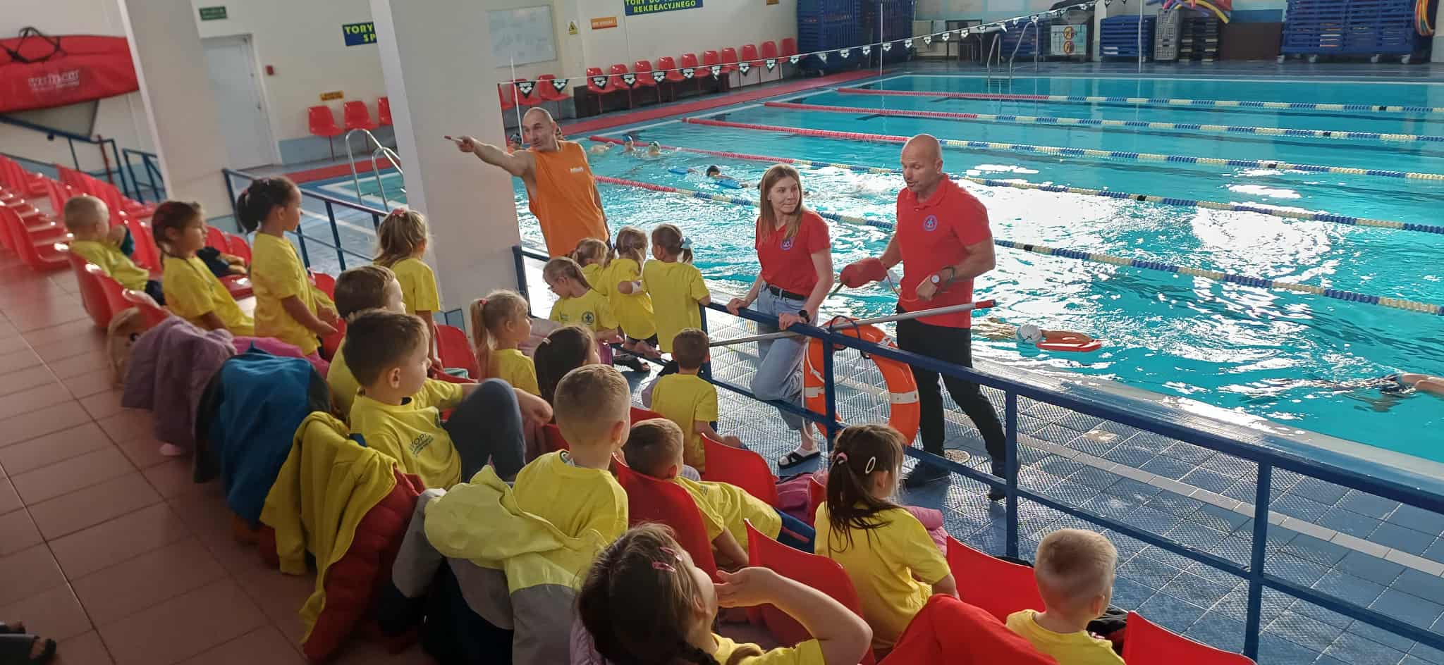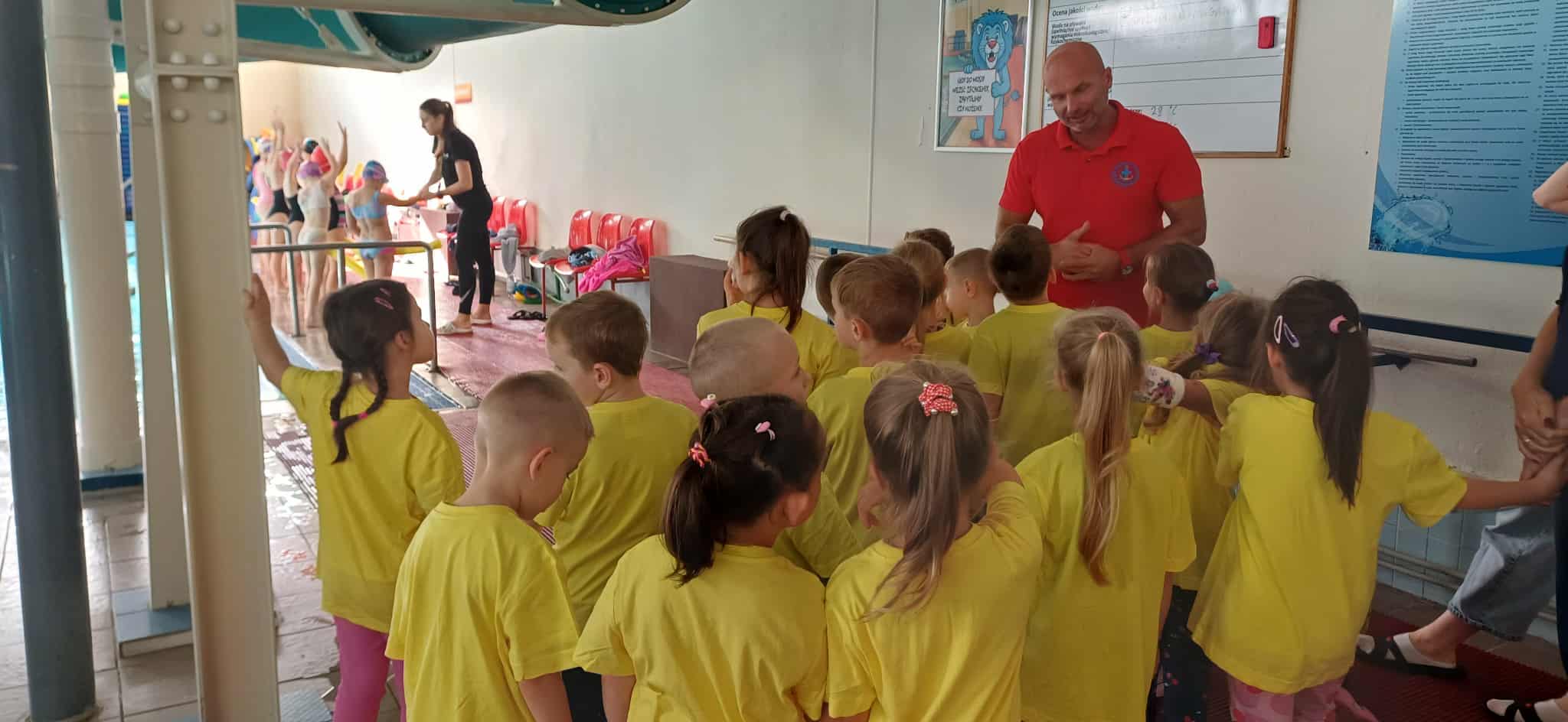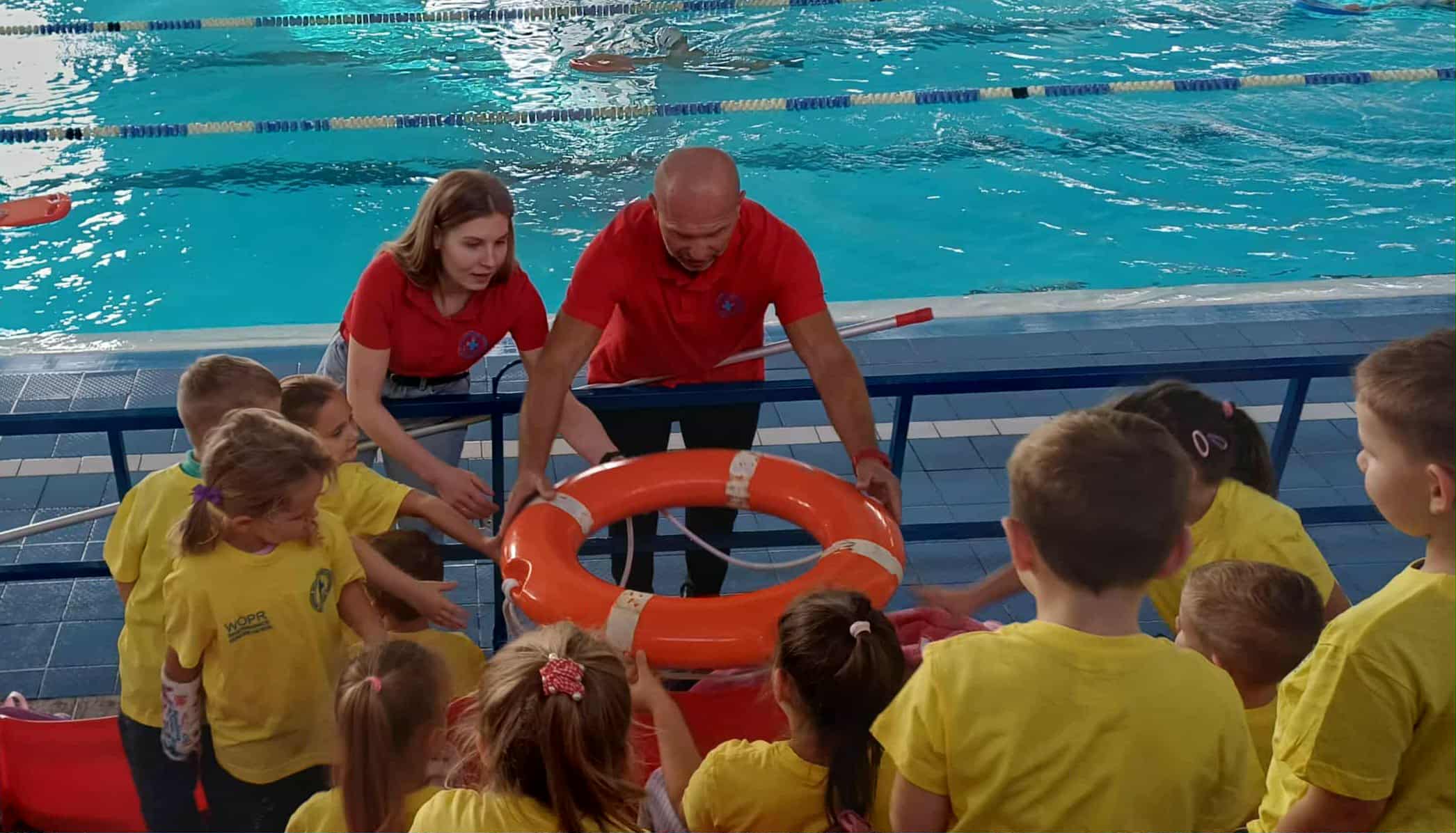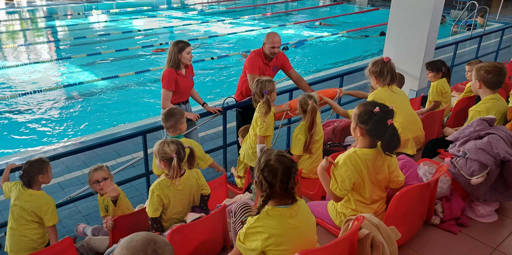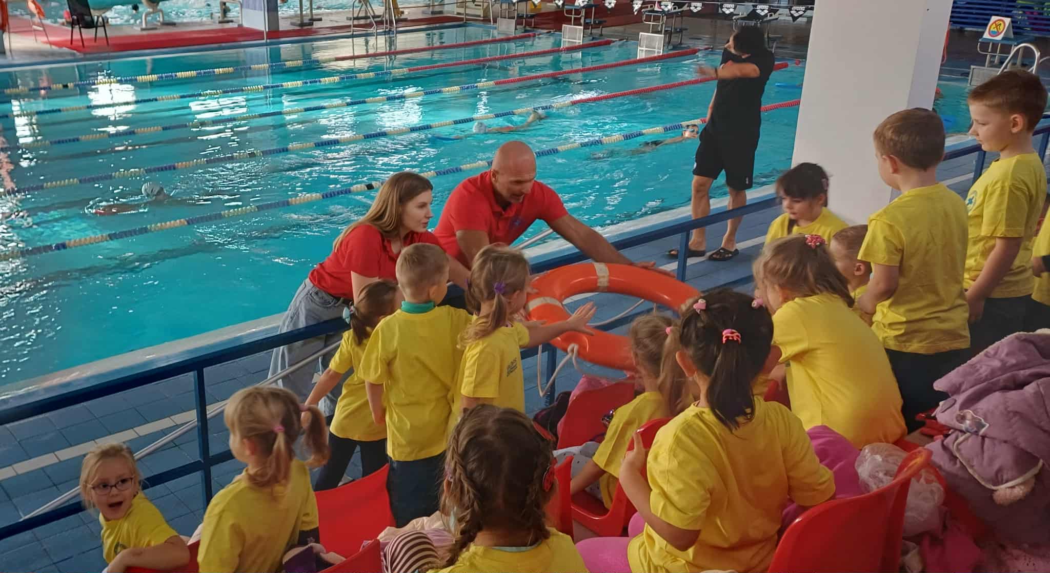 Wisienki pojechały na basen, żeby zobaczyć i poznać to miejsce. Ratownicy omawiali zasady dotyczące bezpiecznego zachowania się na basenie i pokazywali ważne znaki informacyjne. Po powrocie dzieci mogły przymierzyć kamizelki ratunkowe, otrzymały książeczki i dyplomy za udział w programie "Bezpiecznie nad Wodą".