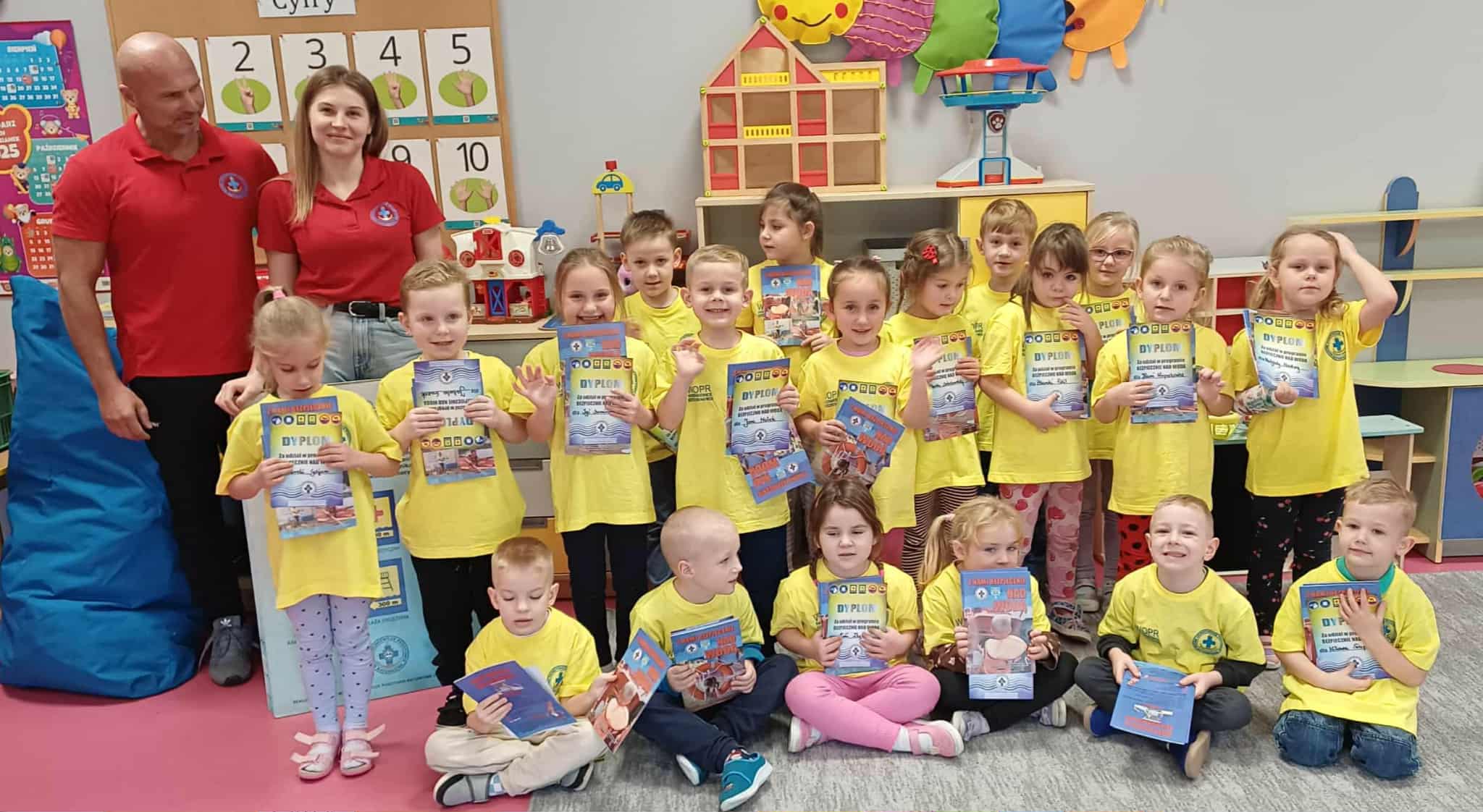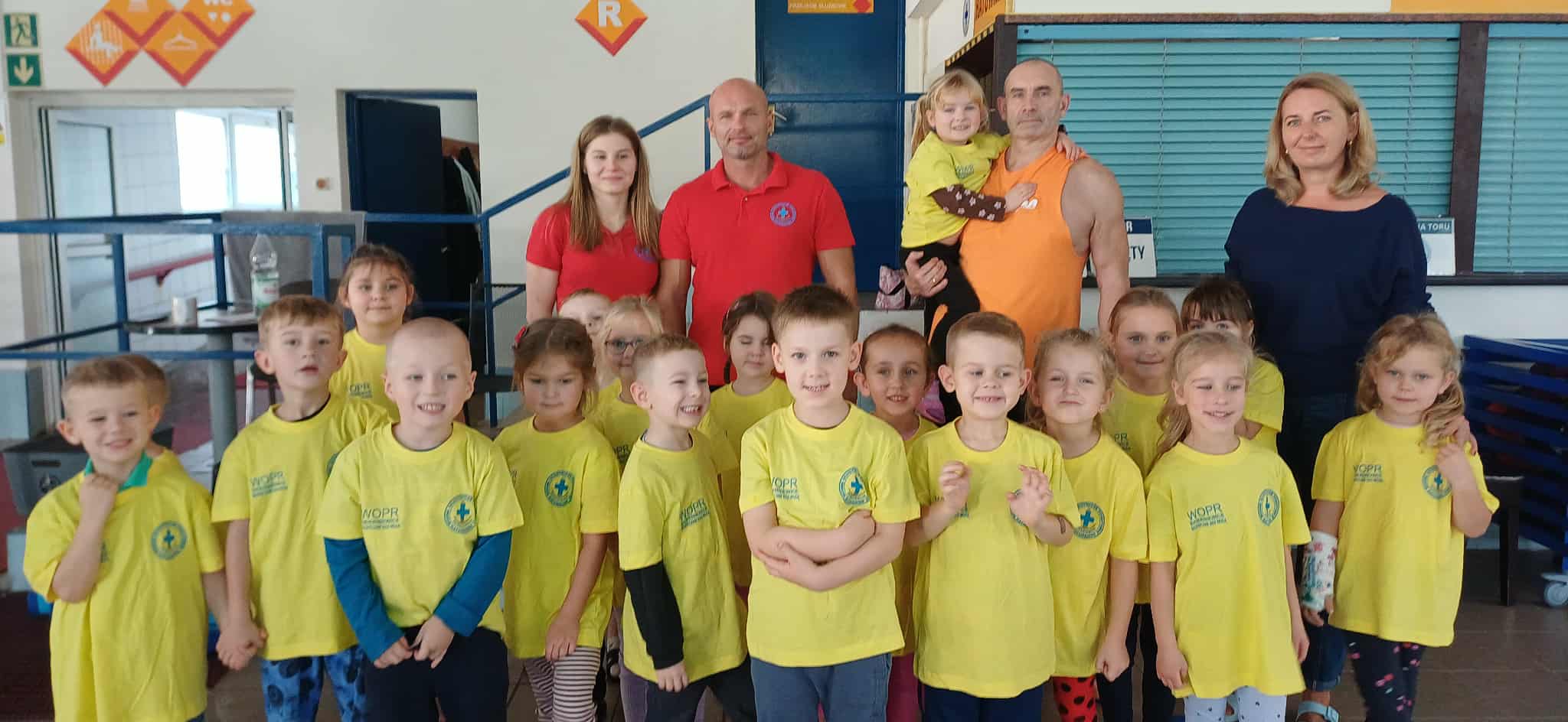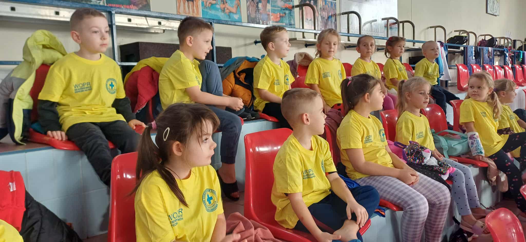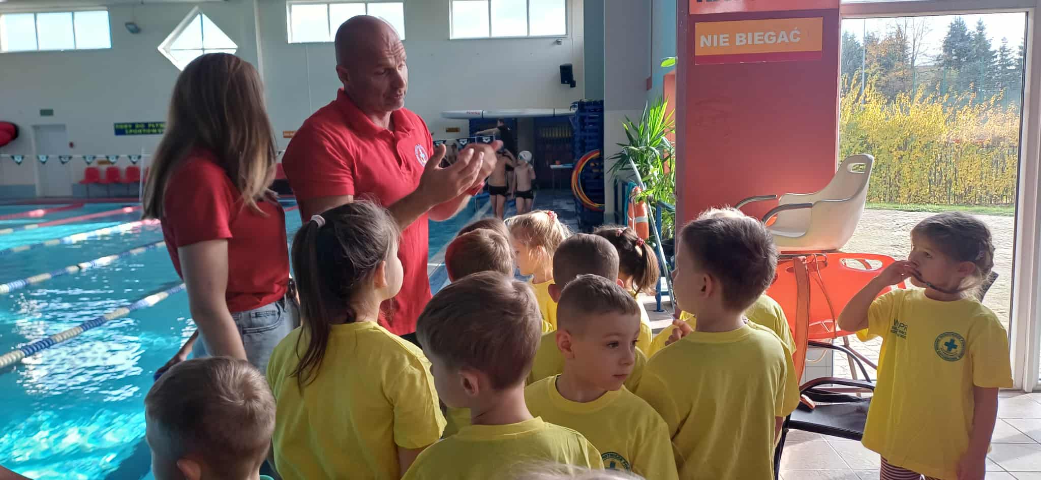 Wisienki pojechały na basen, żeby zobaczyć i poznać to miejsce. Ratownicy omawiali zasady dotyczące bezpiecznego zachowania się na basenie i pokazywali ważne znaki informacyjne. Po powrocie dzieci mogły przymierzyć kamizelki ratunkowe, otrzymały książeczki i dyplomy za udział w programie "Bezpiecznie nad Wodą".
