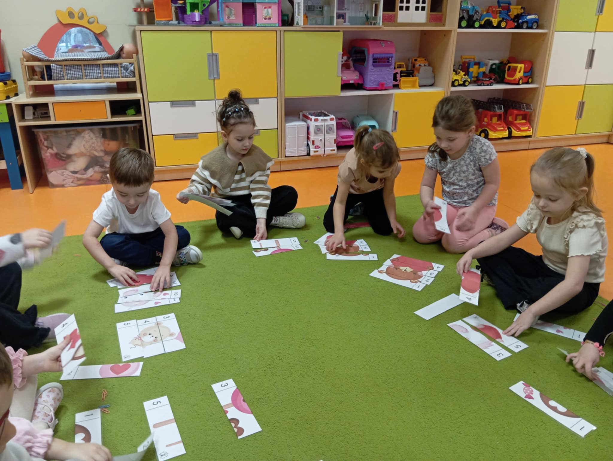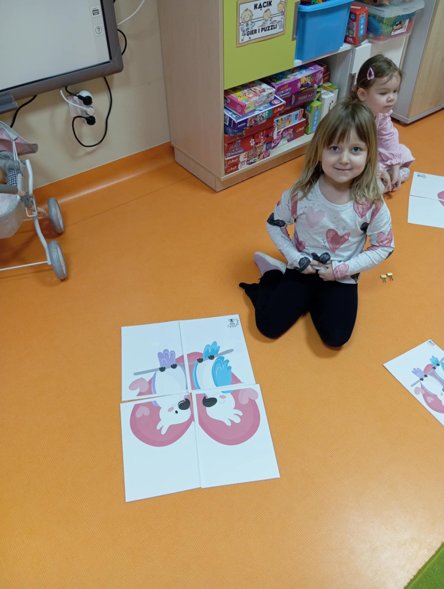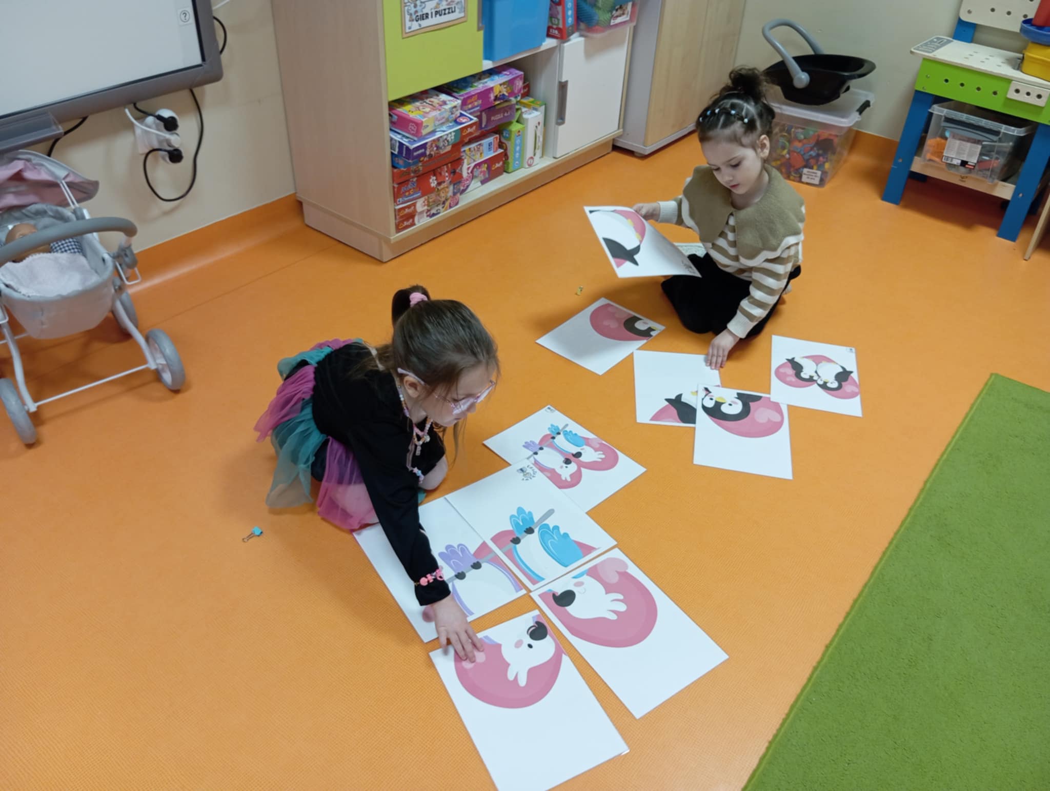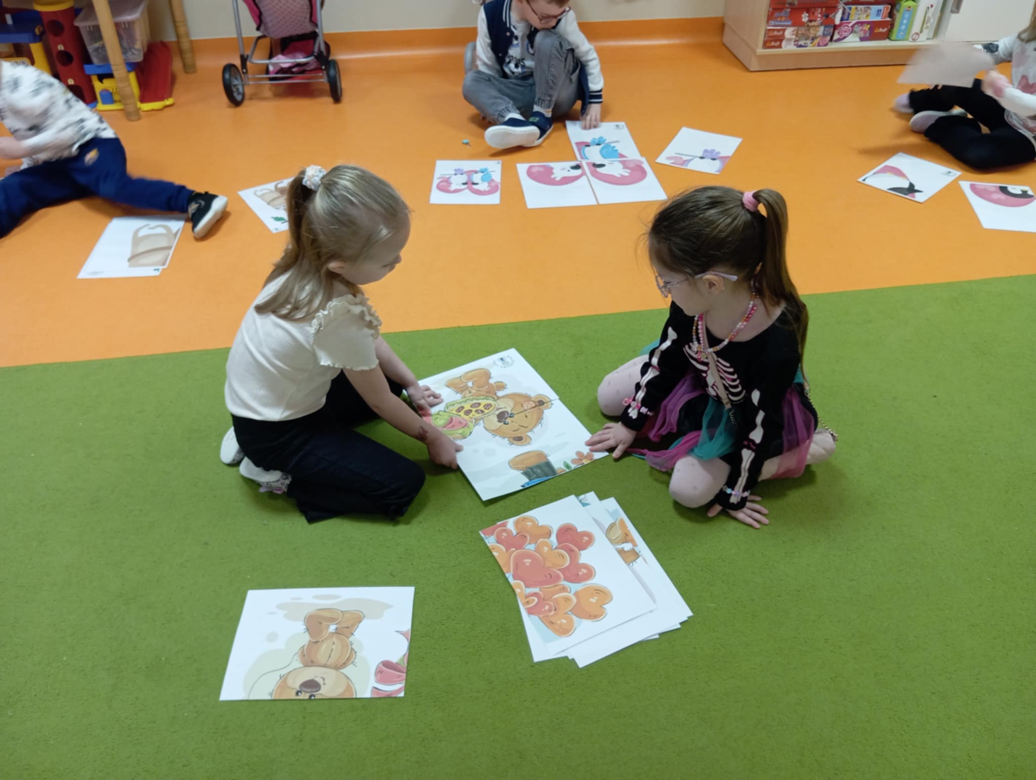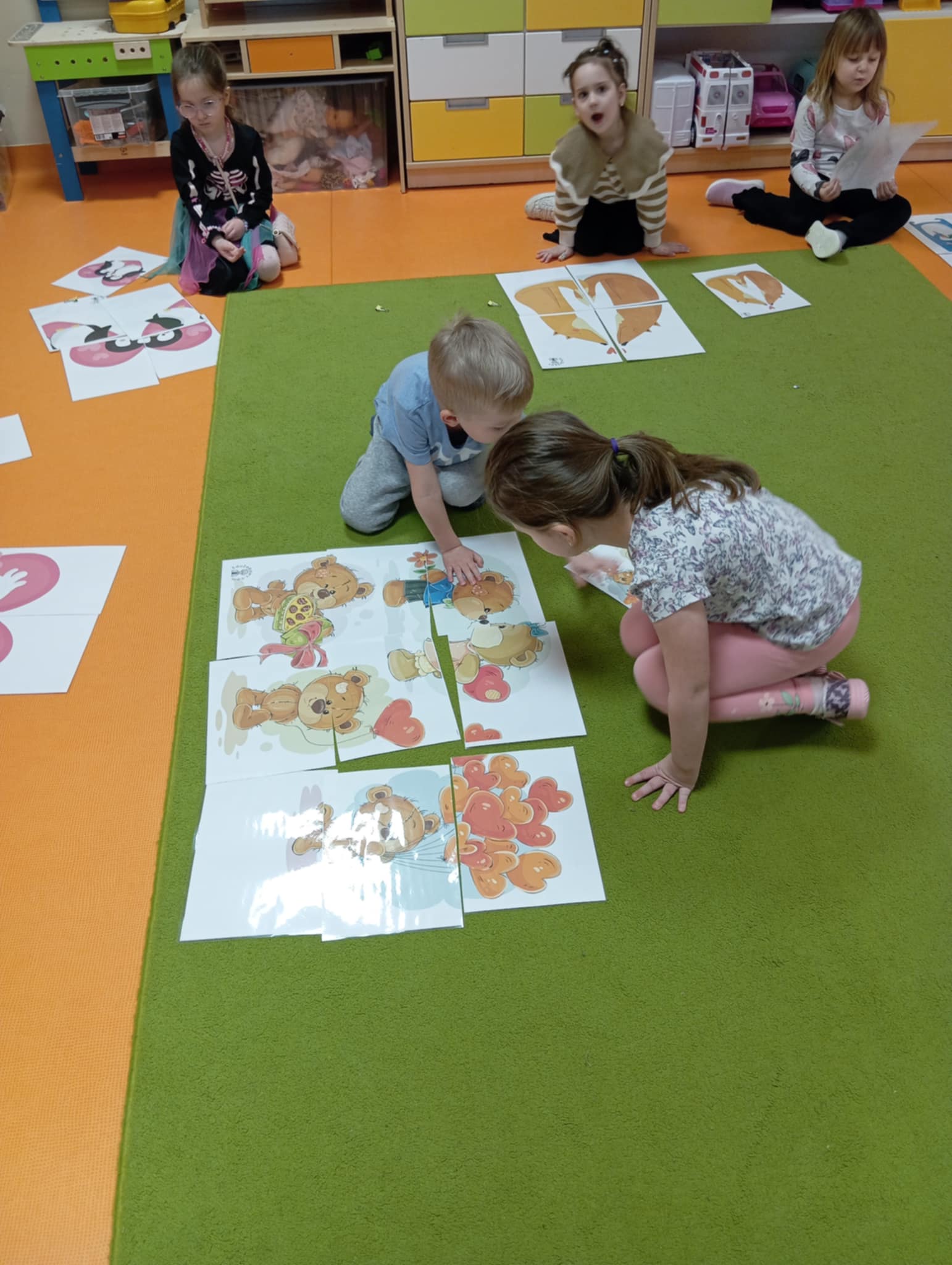 Walentynki to doskonały czas, aby poruszyć z dziećmi temat miłości, kochania, relacji z rodziną. Dzieci chętnie dzielą się swoimi przeżyciami. Na dzisiejszych zajęciach rozmawialiśmy o miłości rodziców do dzieci. Dzieci układały obrazki z części, obrazki przedstawiały walentynkowe ilustracje. Następnie dzieci zamieniały się miejscami i układały kolejne. Wspólnie bawiły się i tańczyły.
