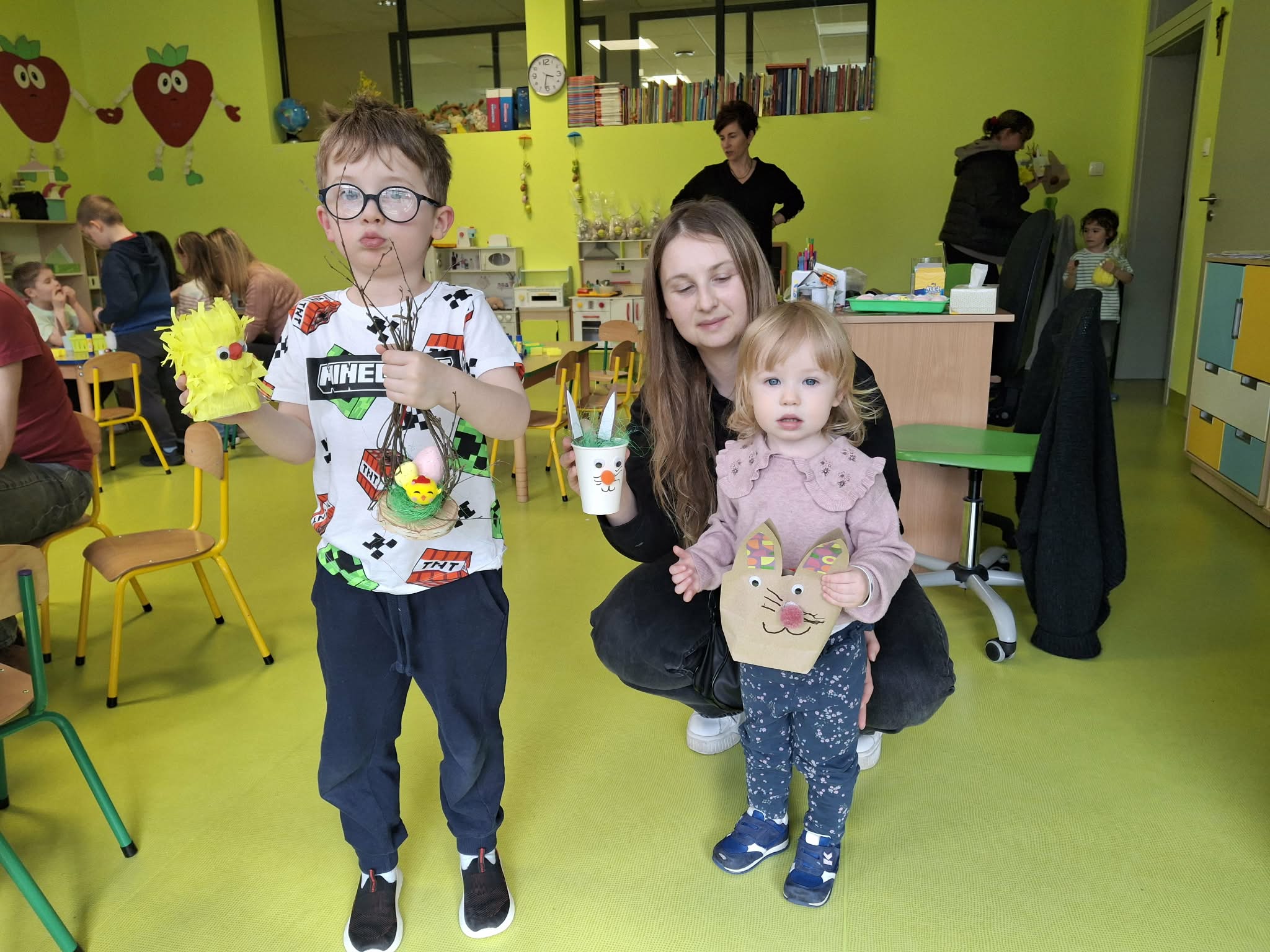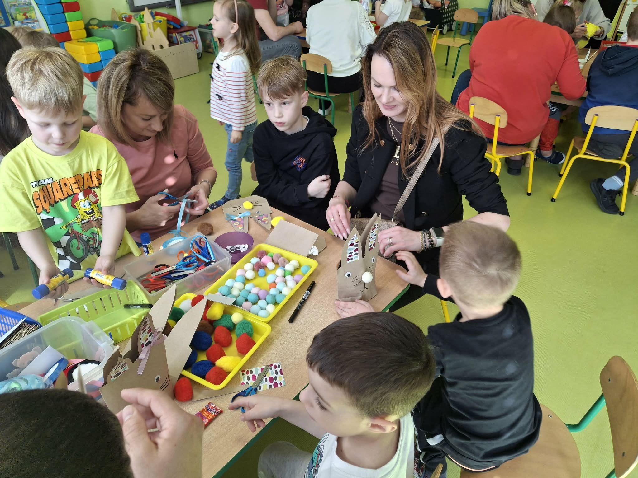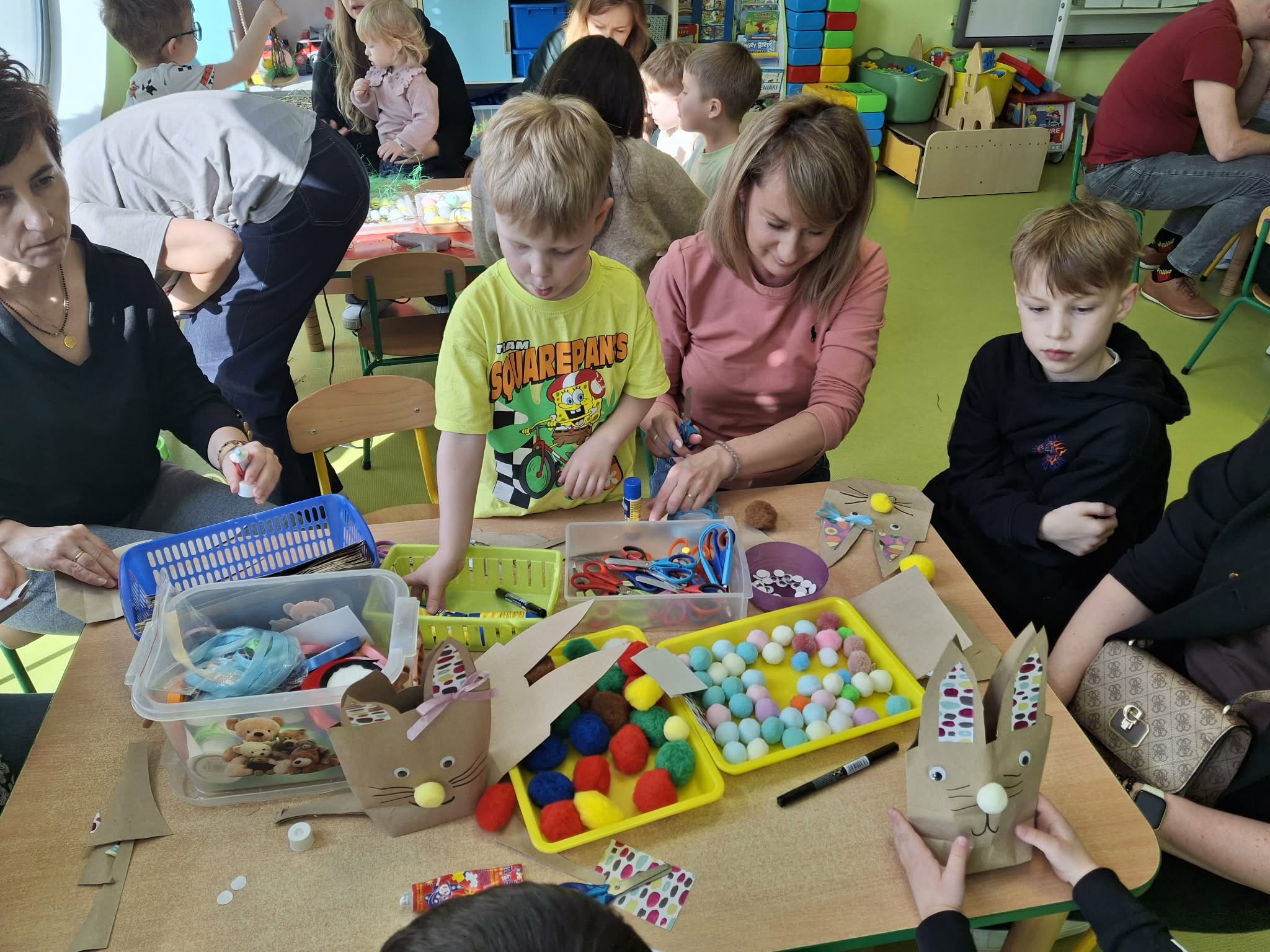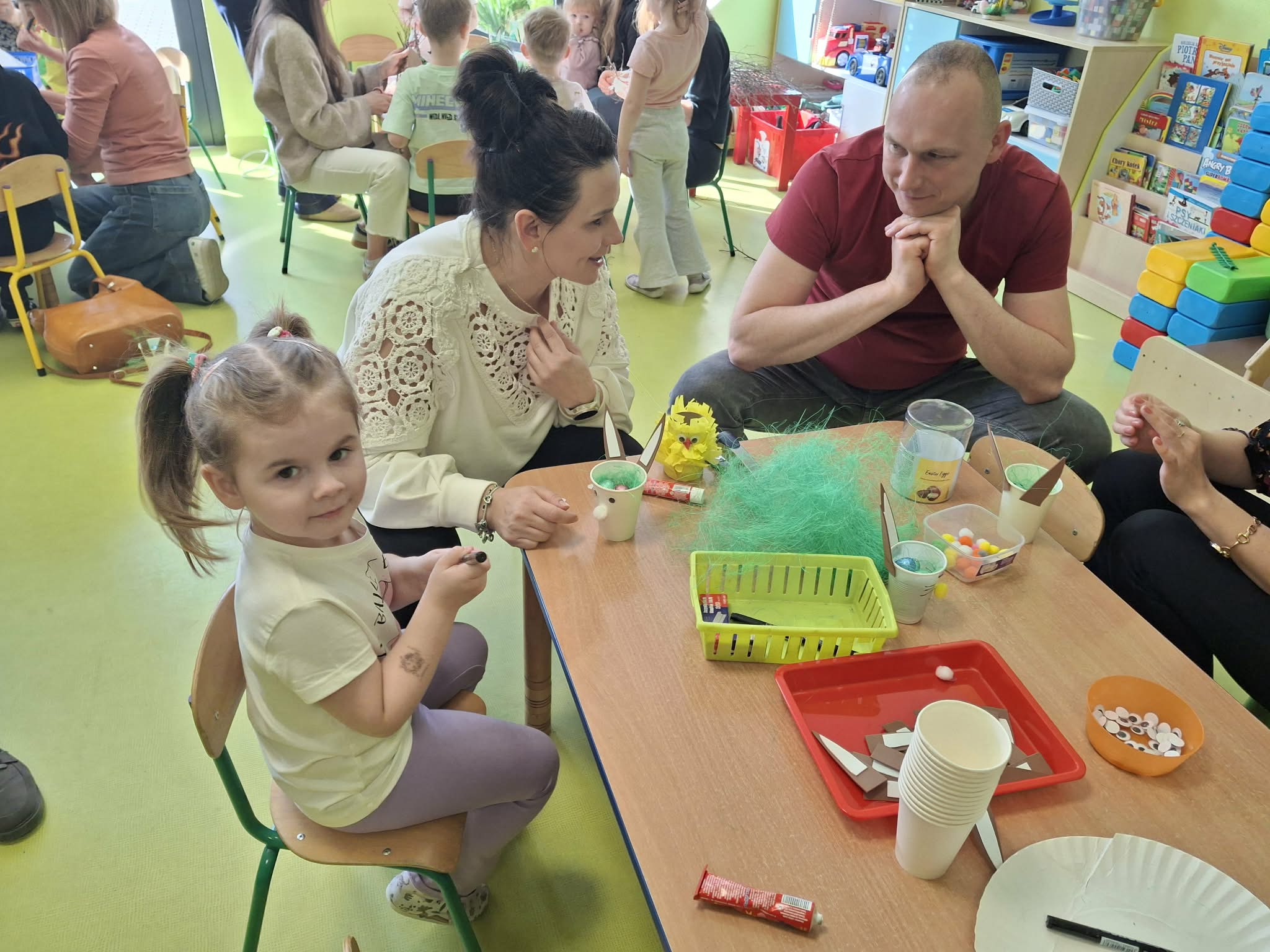 Wielkanocne spotkanie z rodzicami to frajda dla wszystkich. Dzisiaj na warsztatach robiliśmy przepiękne ozdoby - torebkę prezentową, kurczaka, zajączka z papierowego kubeczka i wielkanocny stroik. Zadań było dużo, ale uporaliśmy się z nimi doskonale. Efekty naszej wspólnej pracy widać na zdjęciach.