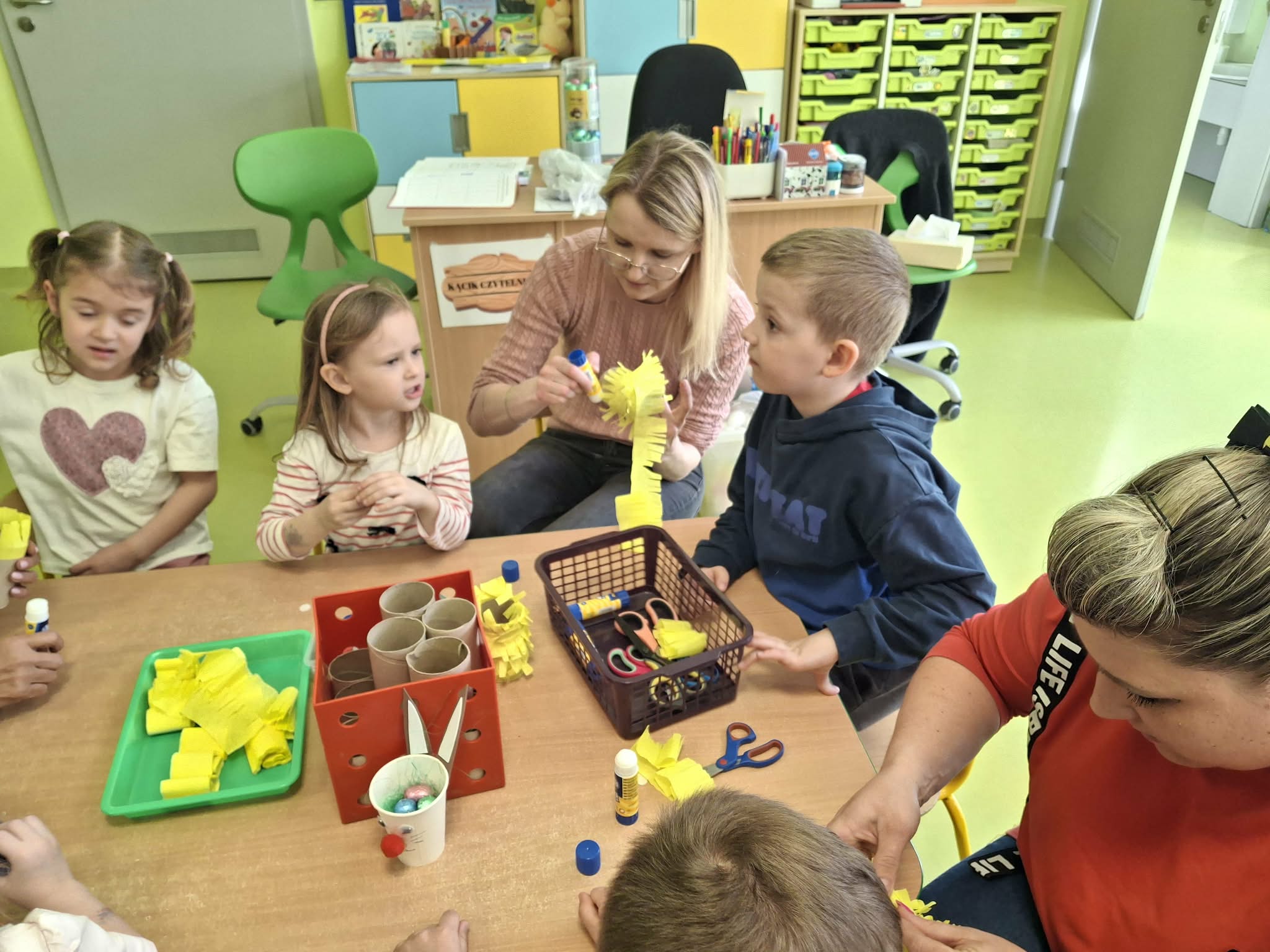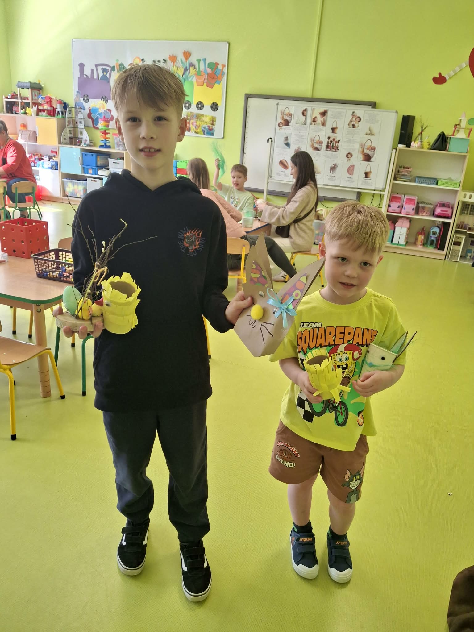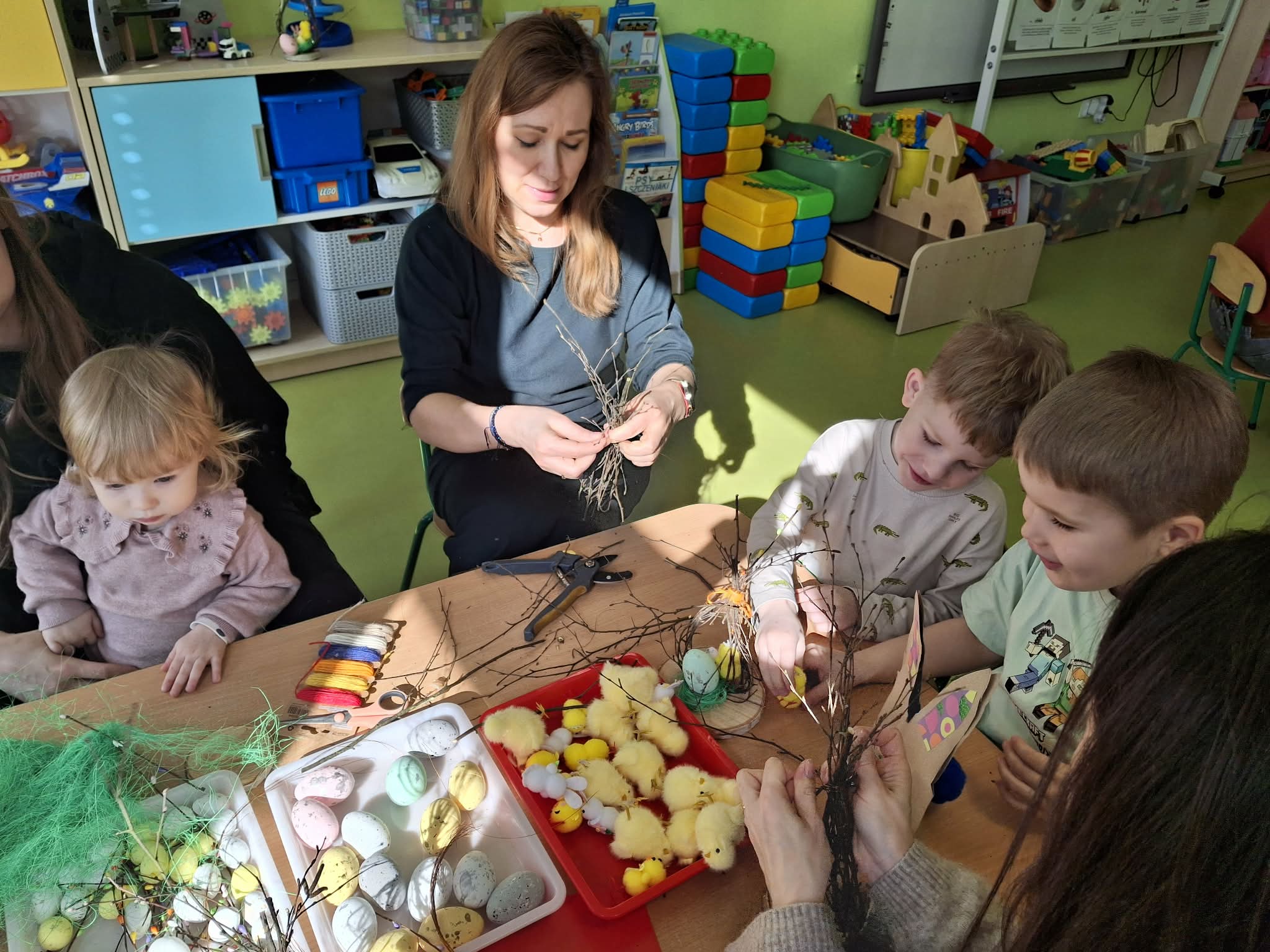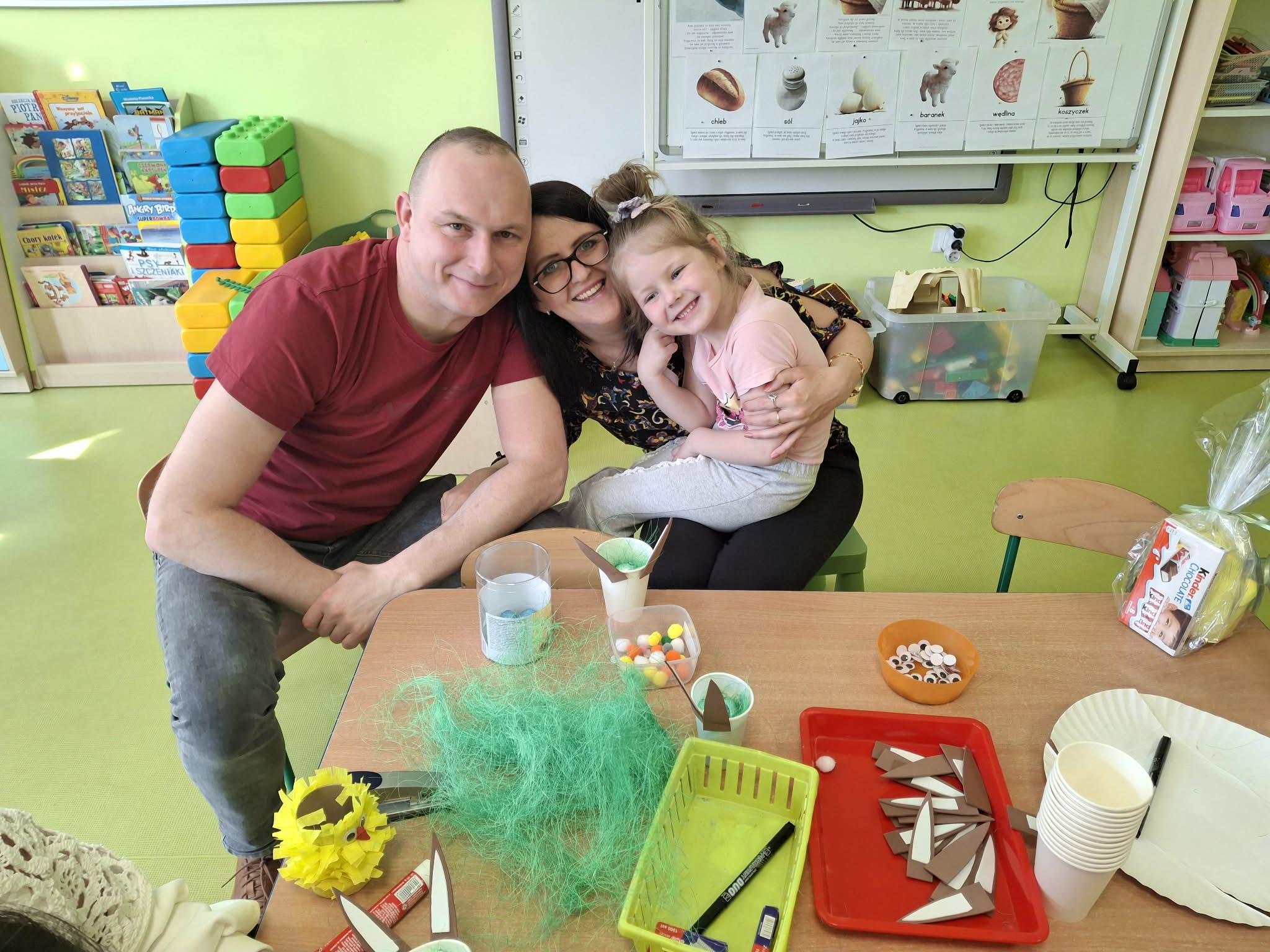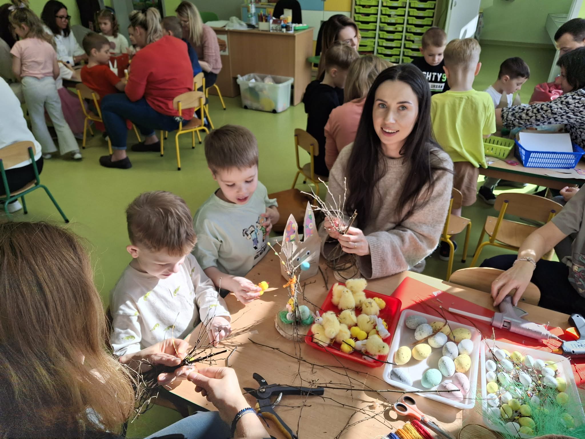Wielkanocne spotkanie z rodzicami to frajda dla wszystkich. Dzisiaj na warsztatach robiliśmy przepiękne ozdoby - torebkę prezentową, kurczaka, zajączka z papierowego kubeczka i wielkanocny stroik. Zadań było dużo, ale uporaliśmy się z nimi doskonale. Efekty naszej wspólnej pracy widać na zdjęciach.
