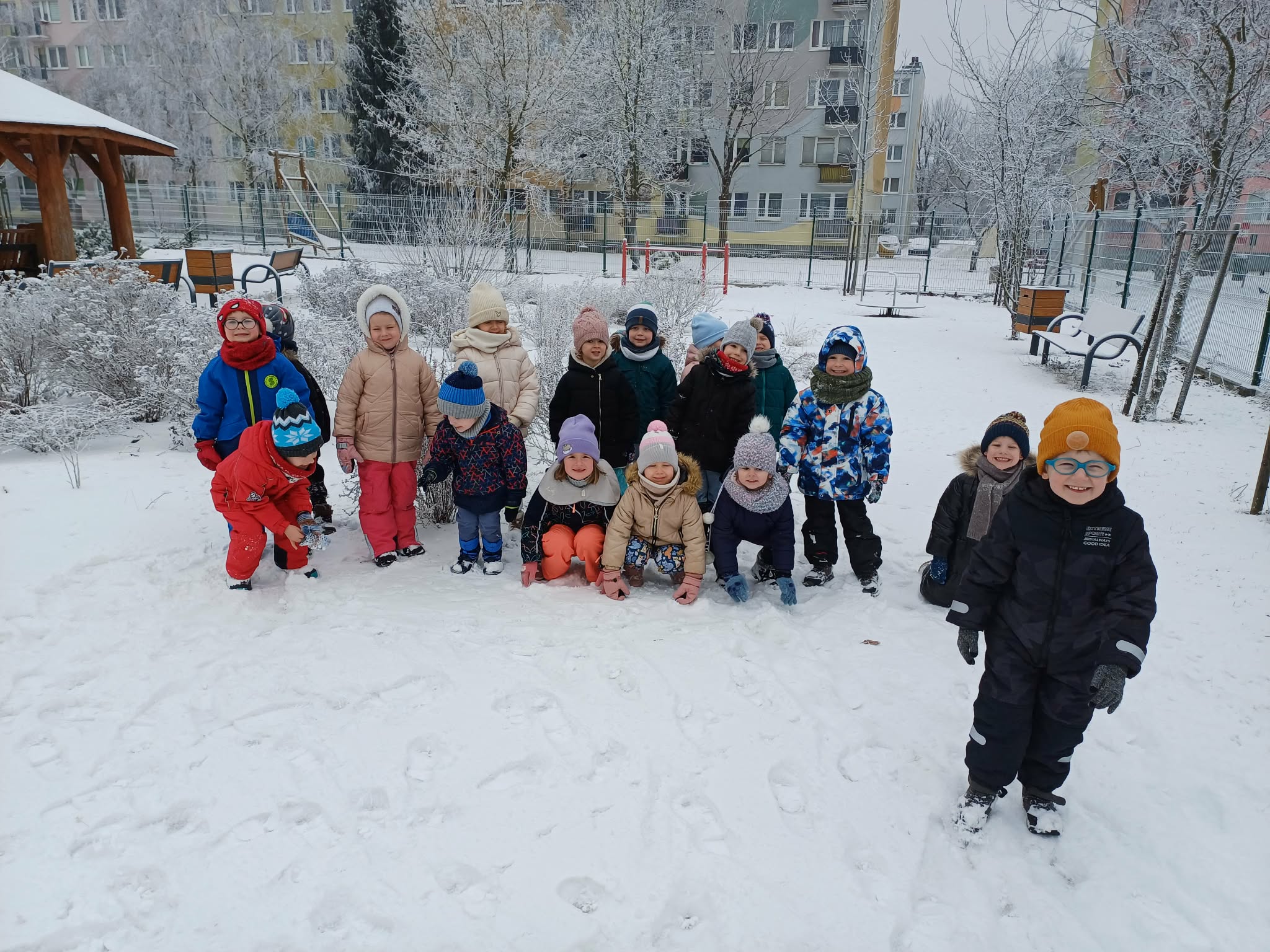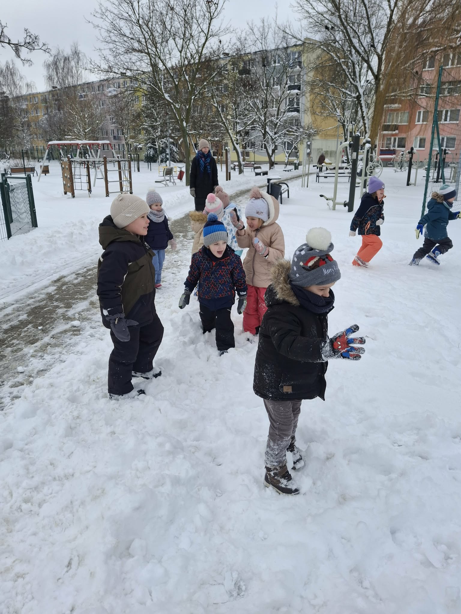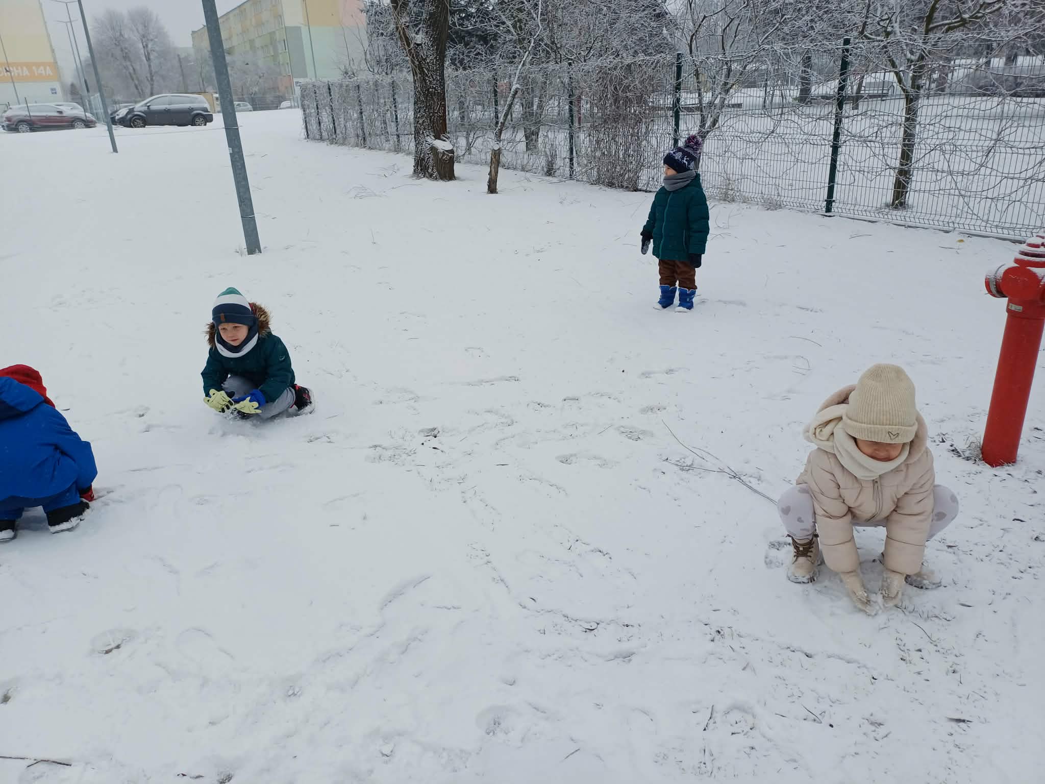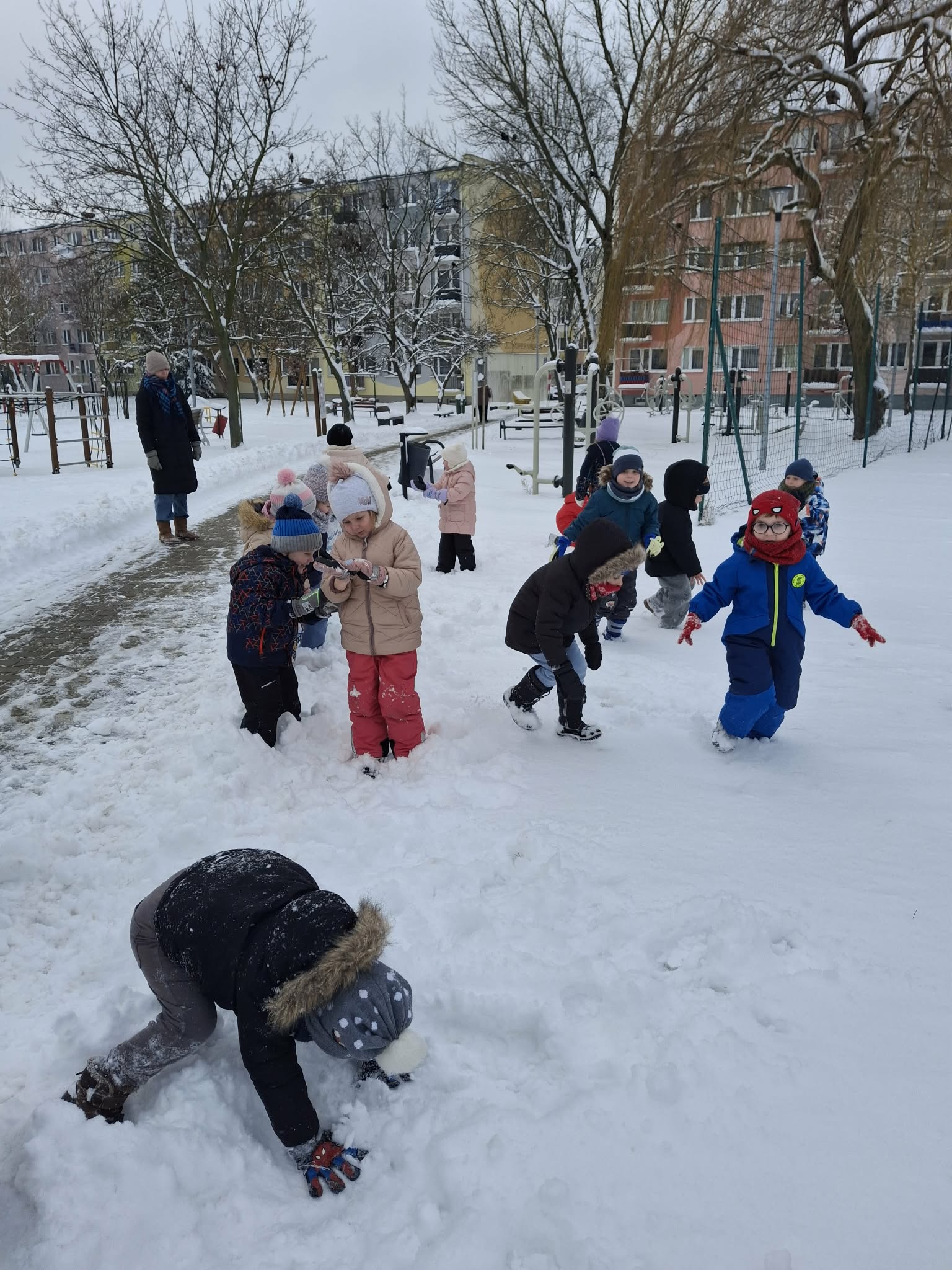 W tym roku nareszcie przyszła do nas zima - od razu popędziliśmy na dwór. Zabawa była bardzo udana, spacer również. Niestety nie mogliśmy ulepić bałwana bo śnieg był za suchy. Ale bitwa śnieżna udała się i sami wyglądaliśmy jak bałwanki. Chodzenie po śniegu to niezła gimnastyka.